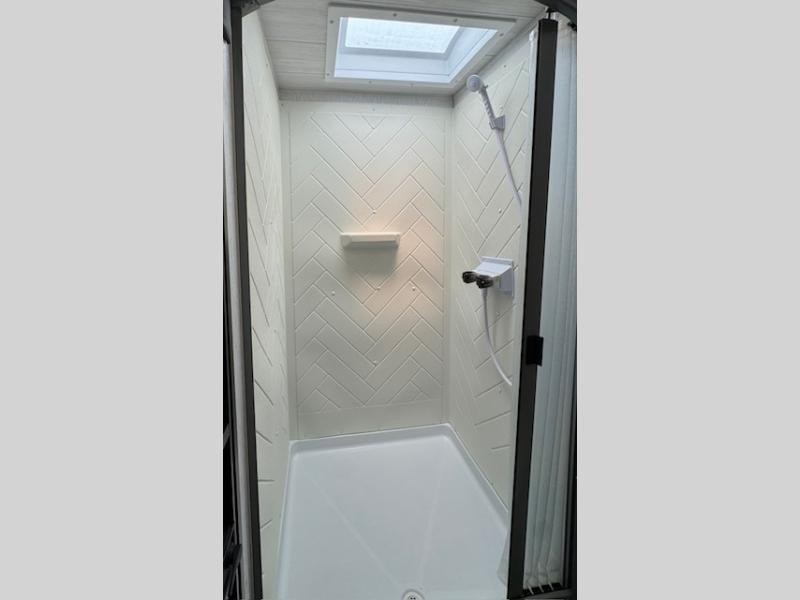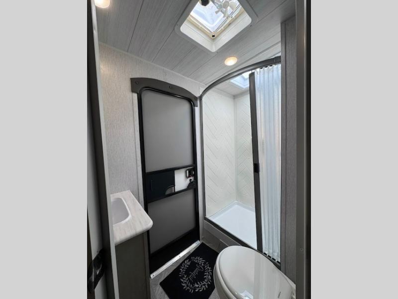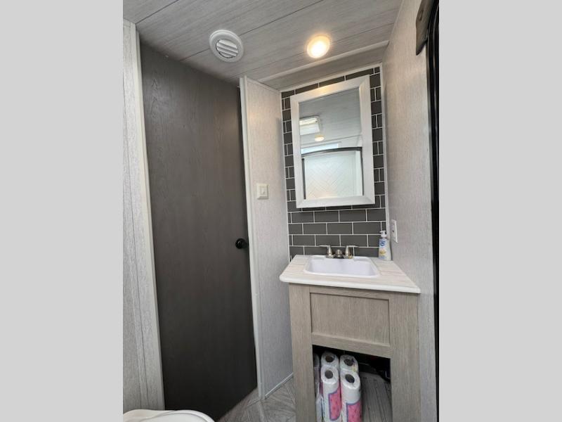 Continue toward the back and to your right is two double bunks 46X74 that can sleep two small children each. To your left is the bathroom with a toilet, vanity with sink, and a walk in shower, The second door entry is in the bathroom.