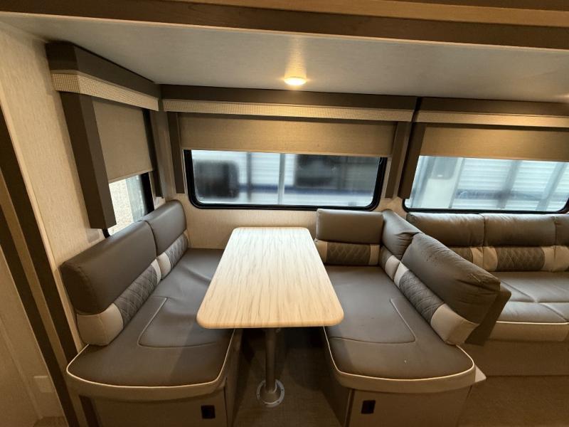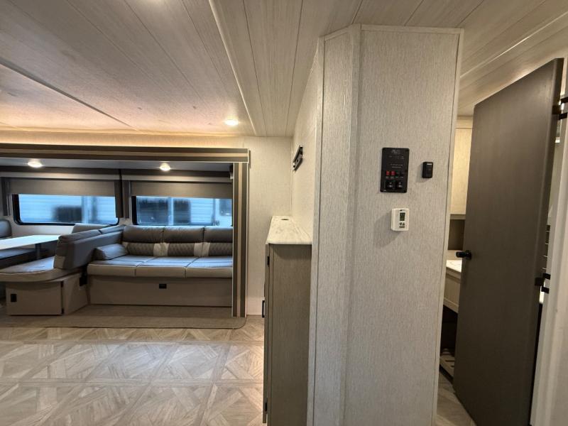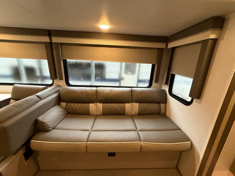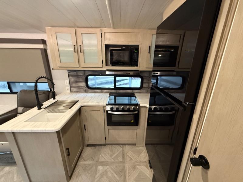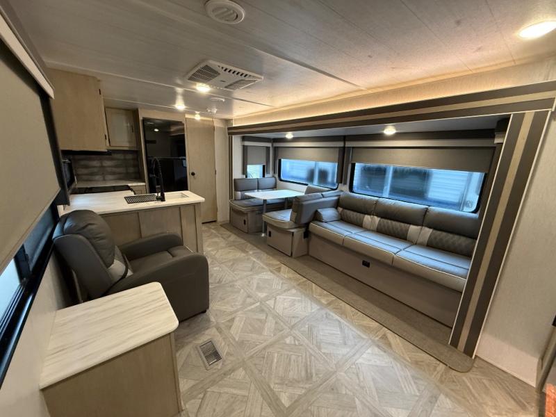 This Wildwood travel trailer is perfect for your family of five looking for a new adventure. You will enjoy the rear kitchen that includes an oversized refrigerator and a three-burner cooktop. The booth dinette within the slide out is perfect for enjoying meals, and when you're through, you can relax on the sofa. Both of these pieces of furniture are a part of the Versa Lounge which allows you to customize their function by moving the middle section to create a larger sofa or a larger dinette. This unit also includes two lounge chairs, so you'll feel right at home! You'll love the full bath in this unit, and the custom king bed in the private bedroom is perfect for a good night's rest.