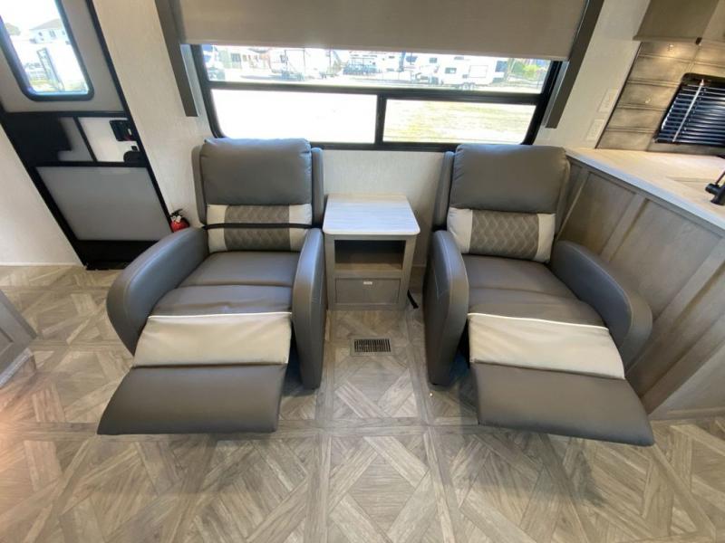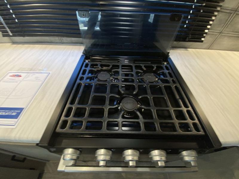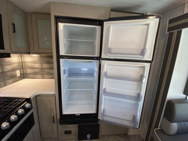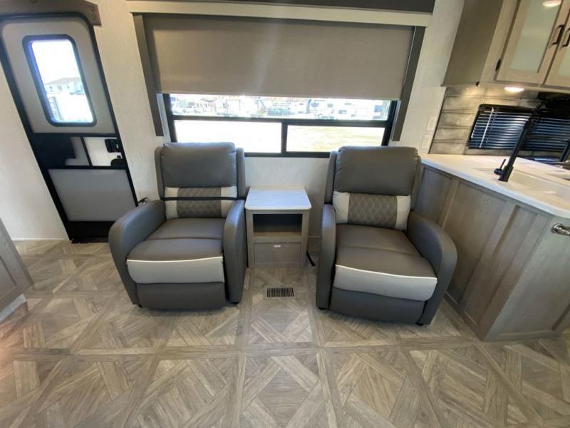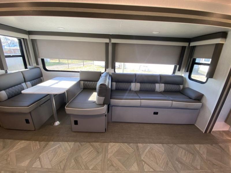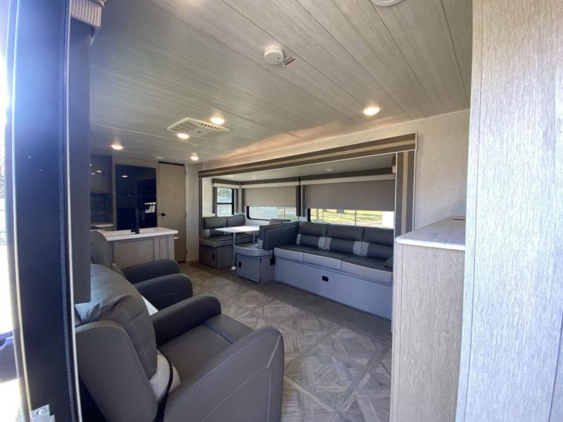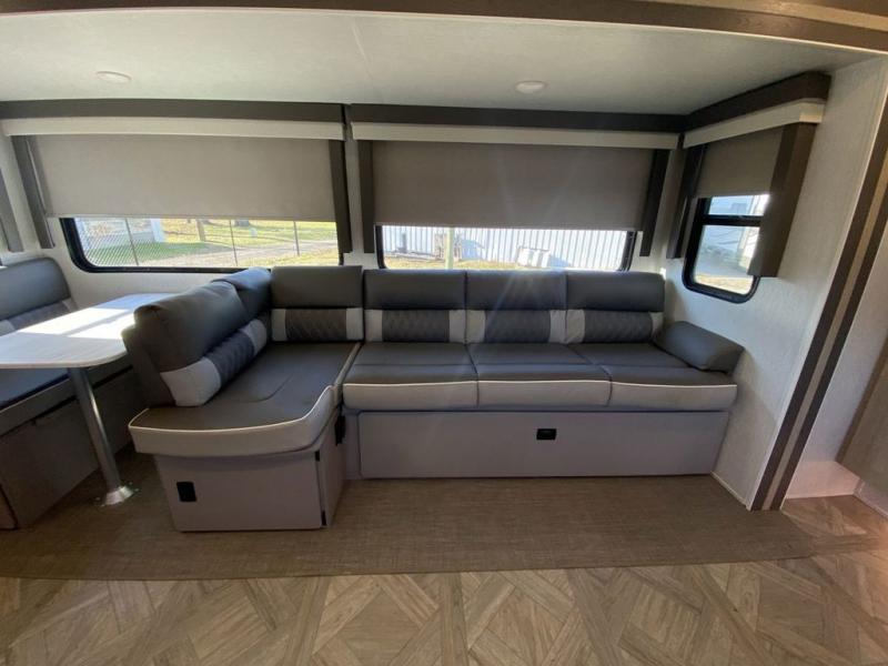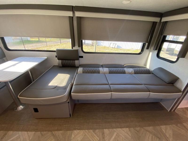 This Wildwood travel trailer is perfect for your family of five looking for a new adventure. You will enjoy the rear kitchen that includes an oversized refrigerator and a three-burner cooktop. The booth dinette within the slide out is perfect for enjoying meals, and when you're through, you can relax on the sofa. Both of these pieces of furniture are a part of the Versa Lounge which allows you to customize their function by moving the middle section to create a larger sofa or a larger dinette. This unit also includes two lounge chairs, so you'll feel right at home! You'll love the full bath in this unit, and the custom king bed in the private bedroom is perfect for a good night's rest.