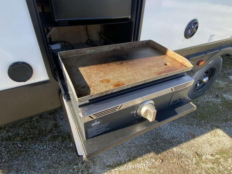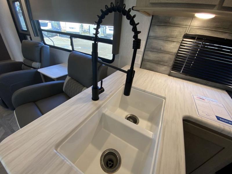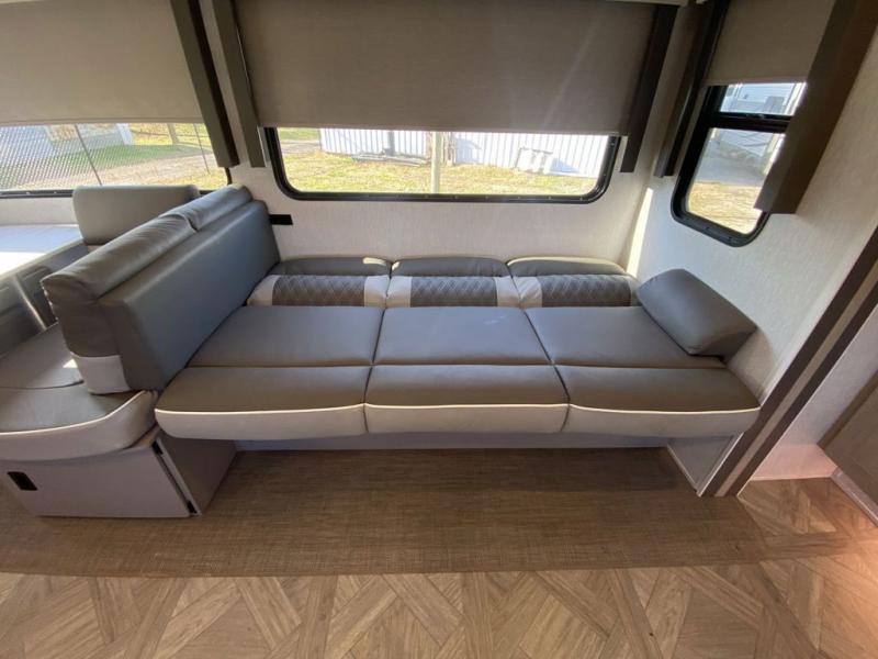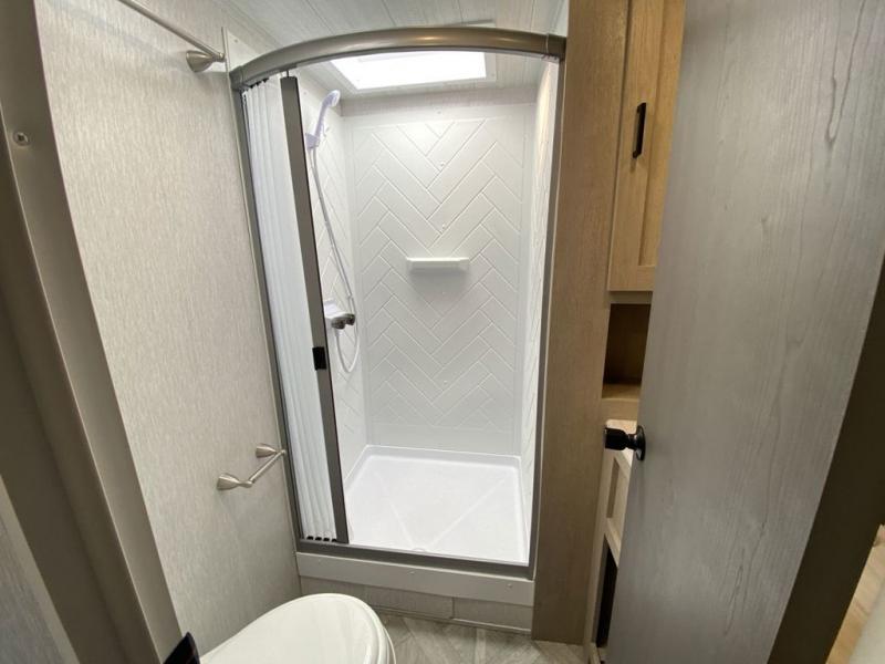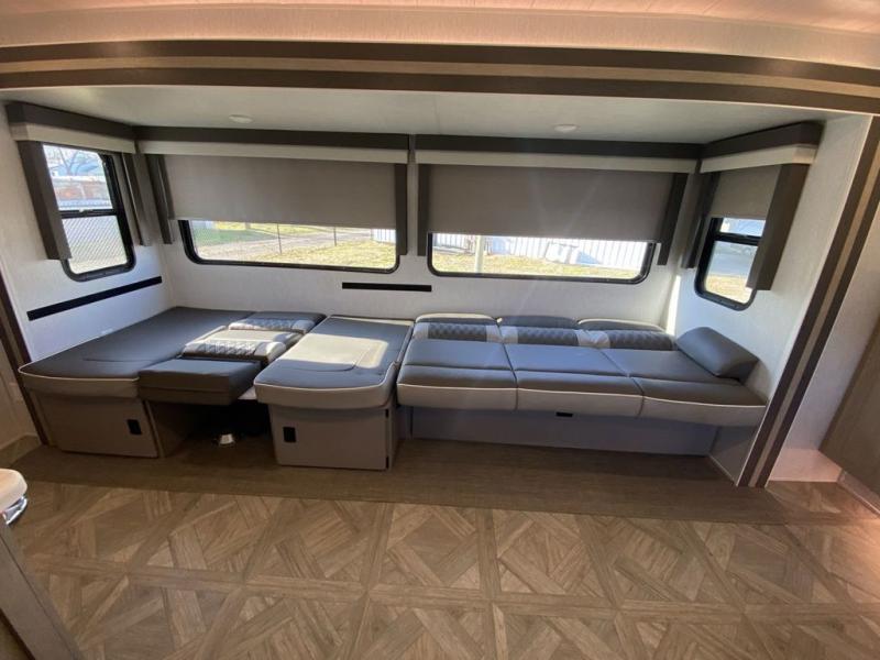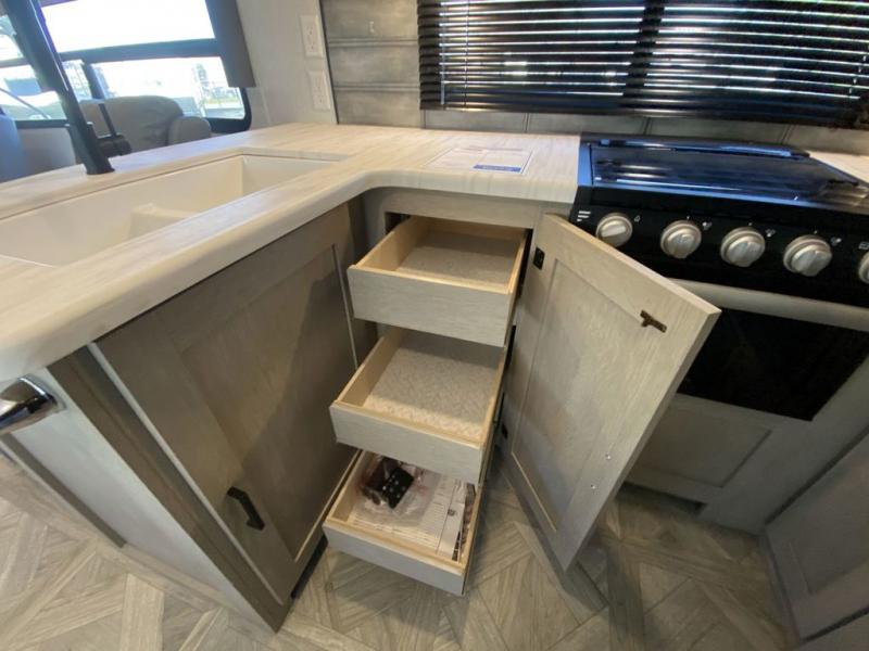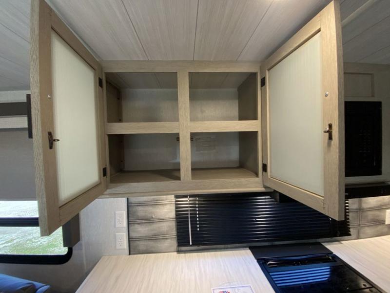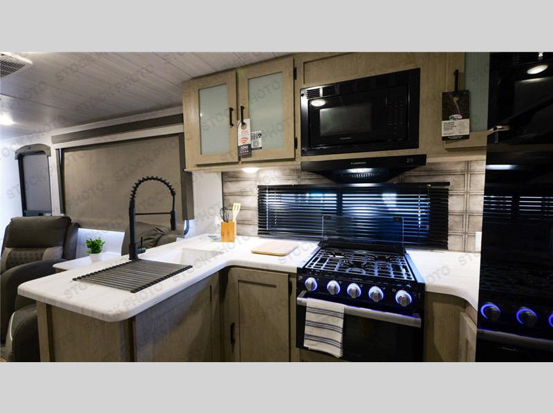 This Wildwood travel trailer is perfect for your family of five looking for a new adventure. You will enjoy the rear kitchen that includes an oversized refrigerator and a three-burner cooktop. The booth dinette within the slide out is perfect for enjoying meals, and when you're through, you can relax on the sofa. Both of these pieces of furniture are a part of the Versa Lounge which allows you to customize their function by moving the middle section to create a larger sofa or a larger dinette. This unit also includes two lounge chairs, so you'll feel right at home! You'll love the full bath in this unit, and the custom king bed in the private bedroom is perfect for a good night's rest.