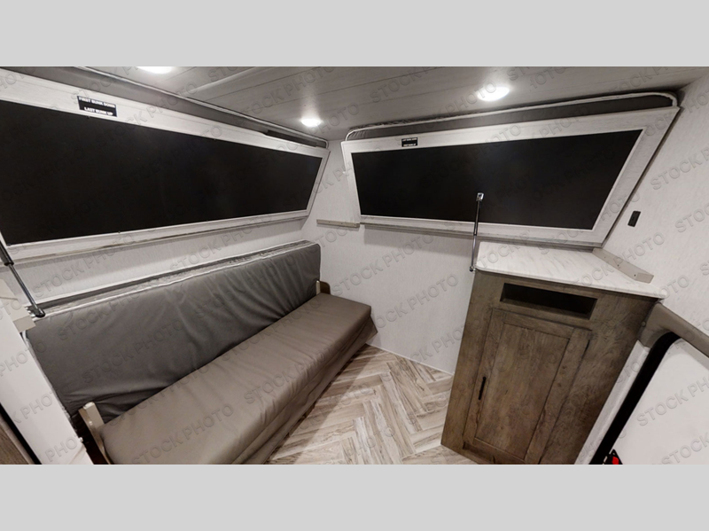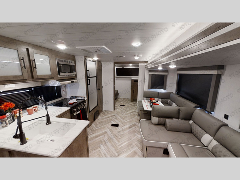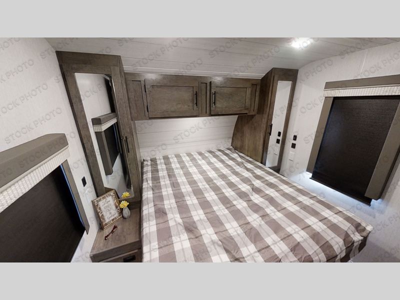 This travel trailer is the perfect unit for a larger family since it includes a private bunkhouse for the kids, and a private bedroom for mom and dad. The large slide in the main living area provides more floor space, and everyone will love the exterior camp kitchen! Easily store paper good and snacks in the walk-in pantry, and you'll find overhead compartments for your belongings and a pass-through storage for larger camp gear. This model also includes a spacious bath with a walk-in shower so you can freshen up after hiking or swimming in the lake!