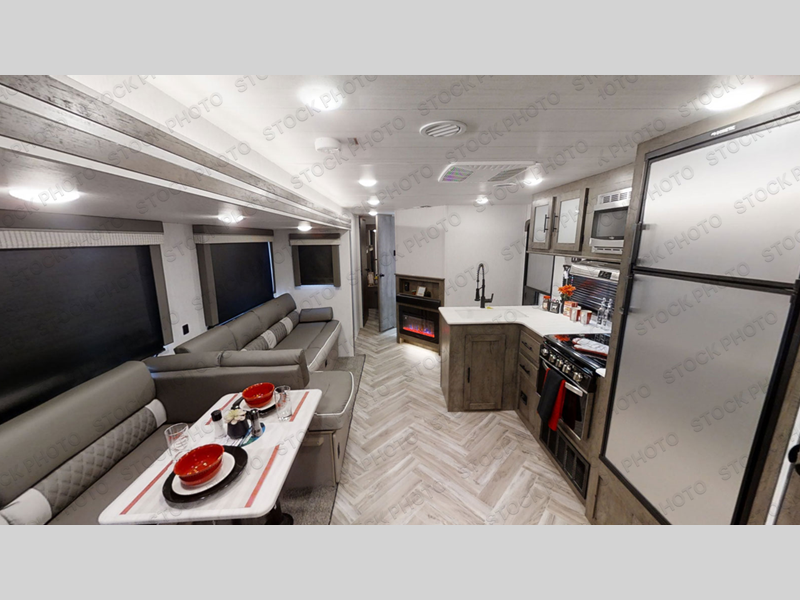 These Wildwood travel trailers are something to take a look at! Inside you will be pleased with plenty of storage space, including Stow N Go storage on some models, and all of the closets throughout. Each unit features a gas/electric refrigerator, seamless countertops with an undermount sink that makes clean-up a breeze, and an extra large panoramic window package in the main slide so you can look out at your beautiful scenery while eating a meal or playing a game. Each unit also includes a Bluetooth stereo, a USB port package to keep your electronics at 100%, and even a 30" built-in electric fireplace heater on some models!