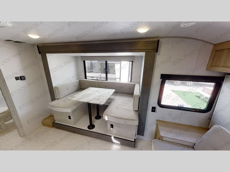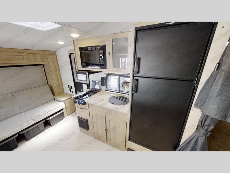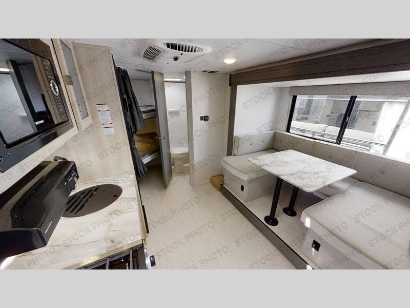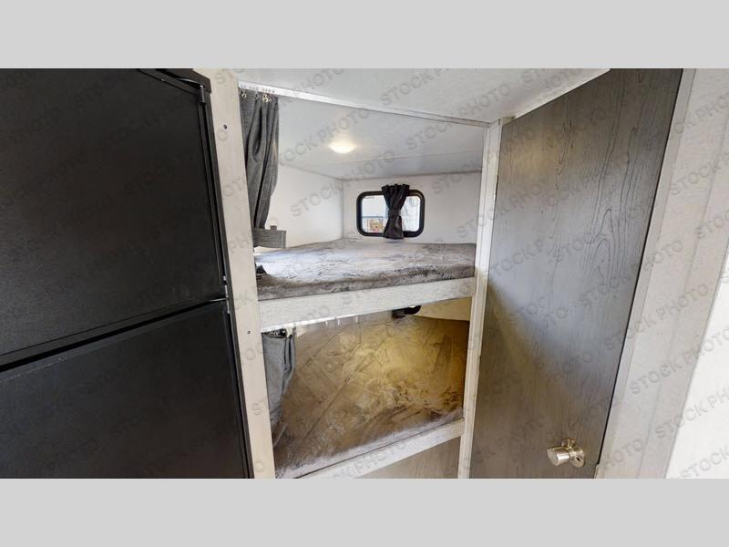 Bring your whole crew along for trips in this roomy travel trailer that can sleep eight people each night. Once you've set up the 14' power awning with LED lights, make lunch on the outdoor LP griddle, and there is an outdoor refrigerator for cold drinks. Explore some trails or take your fishing poles down to the river, then head back to the trailer to clean up in the full bath. The kids may want to rest on the double-size bunks, while the adults play a game around the U-shaped dinette. This model also includes a sofa with storage access, plus a Murphy bed that lowers over the sofa when you're ready for bed. Don't let this travel trailer slip away!