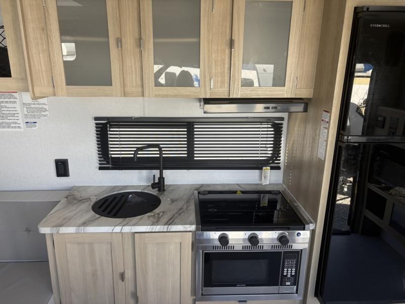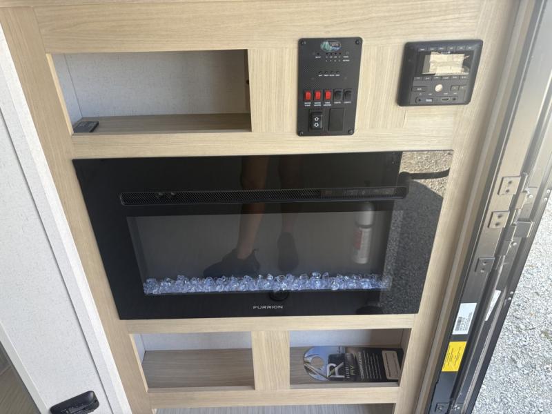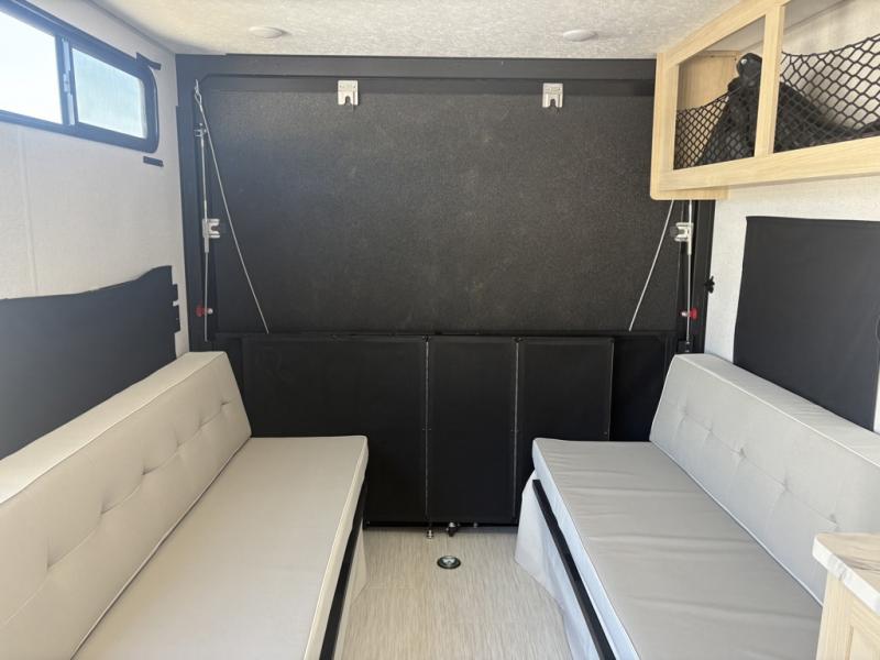 This toy hauler is packed to the Max with standard features and comforts. Once you unload your toys from the garage with a total of 14' cargo space, you can enjoy lunch at the sofa/sleepers with a table. The kitchen includes a dual swinging 12V refrigerator, and everyone will love the fireplace for a more at-home feel. Head through the bath to enjoy the front master bedroom with a queen bed and dual wardrobes for your clothes!