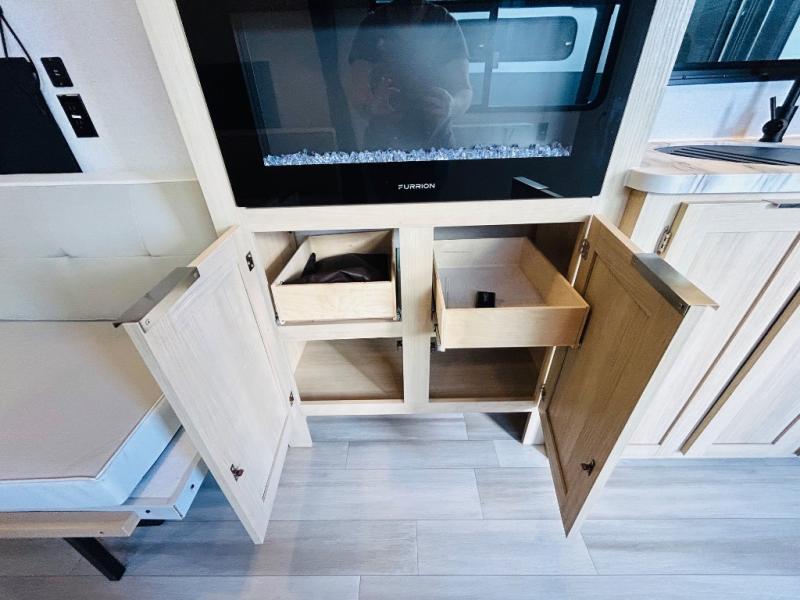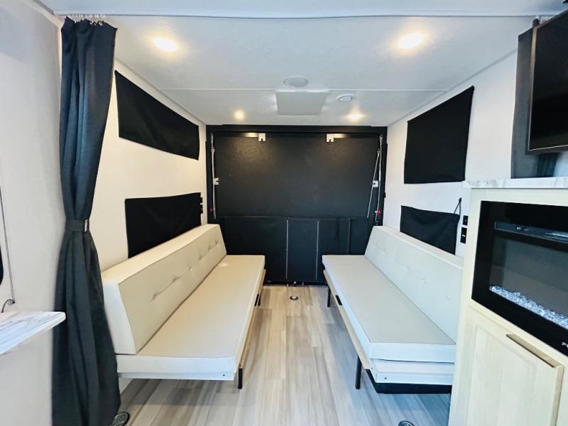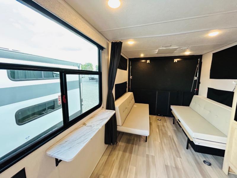 Take your adventures to the max in this MAX toy hauler with more space and features! Unload your dirt bikes from the 14' garage, then convert this space to the 1,500 lb. patio. This model includes two sofa sleepers with a table, or you can choose the optional quad bunk system to sleep even more friends. The main living area will feel more like home with a fireplace, and the full kitchen will allow you to prepare meals for your whole group. If you enjoy cooking outdoors then you will love the outdoor griddle and refrigerator, plus there is an 18' power awning here for shade. After dinner is cleaned up, head to the front private bedroom for a great night's rest and plan to do it all over again tomorrow!