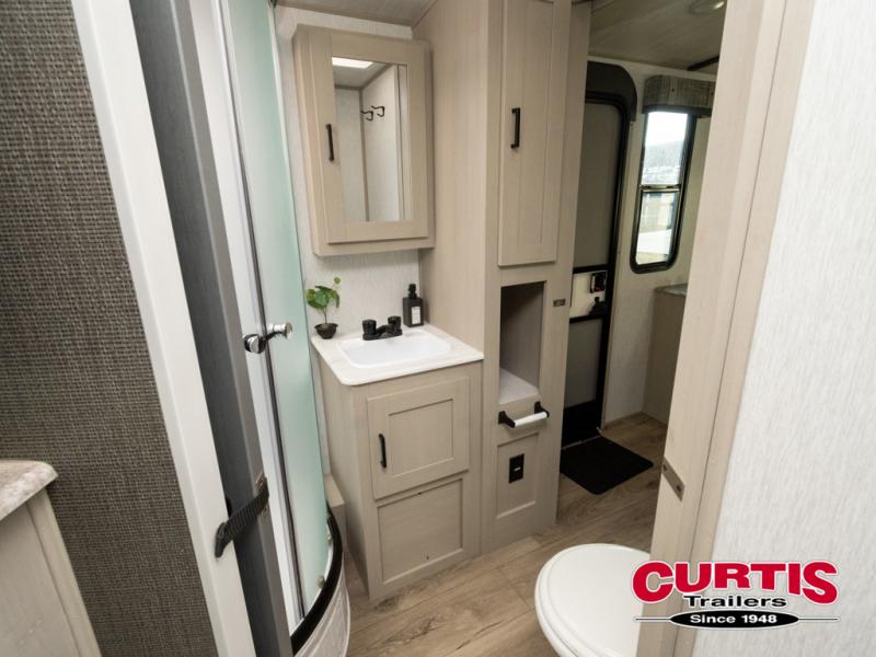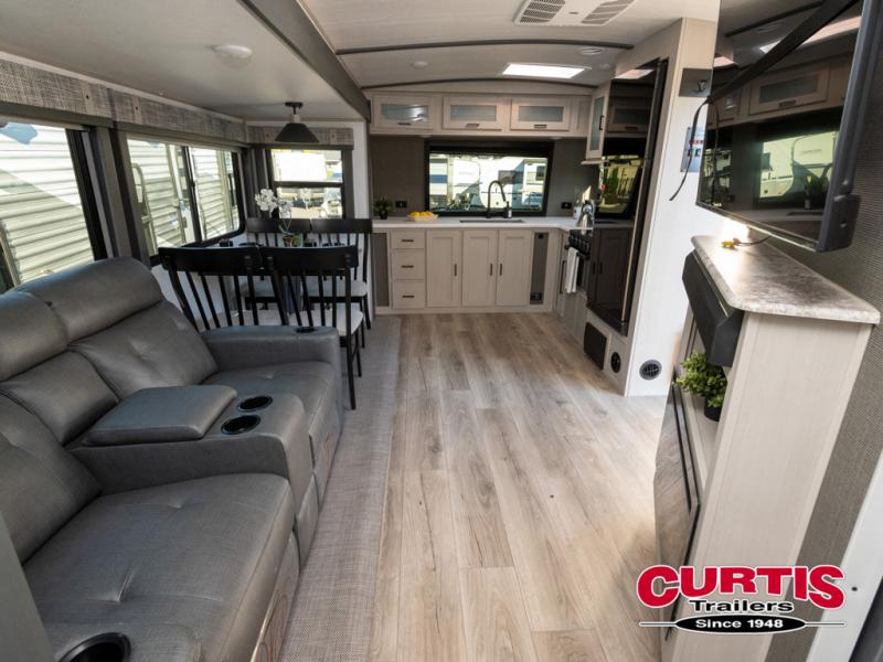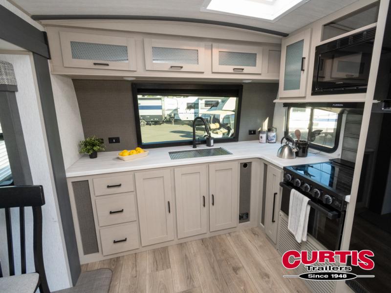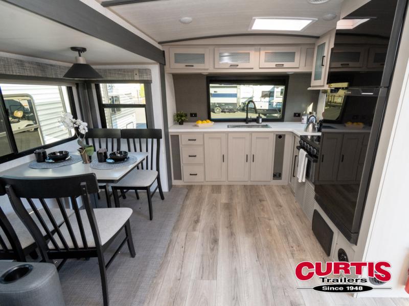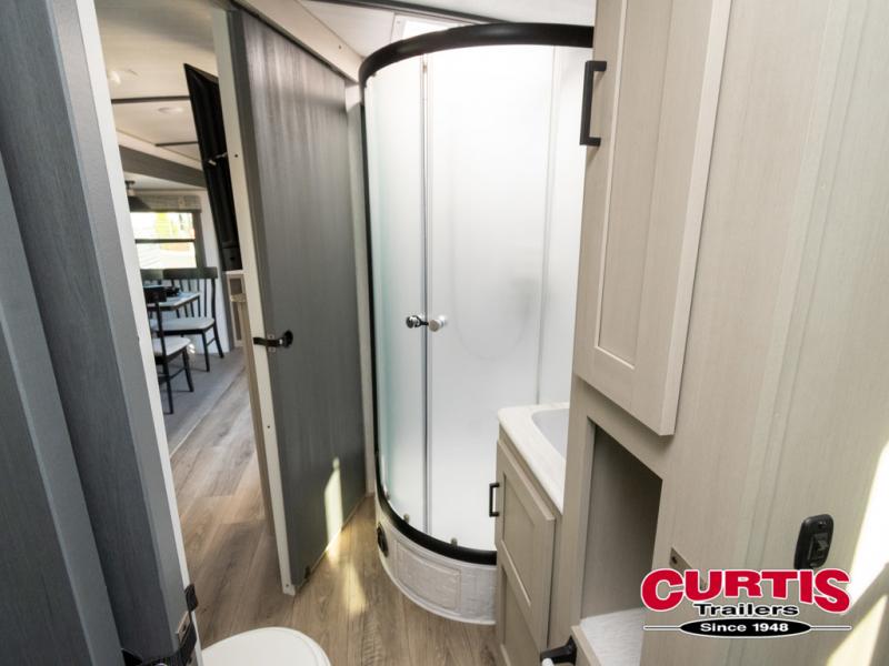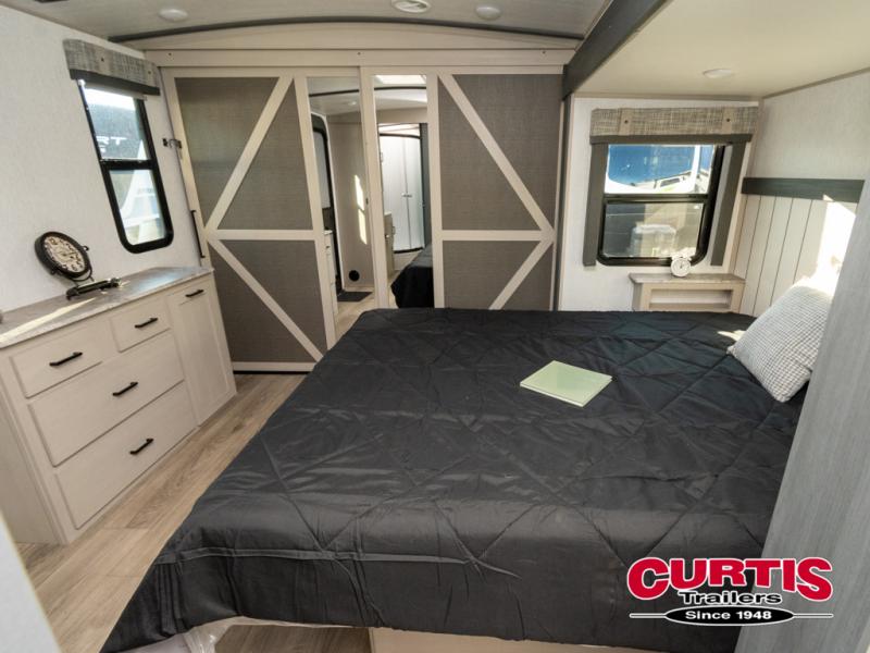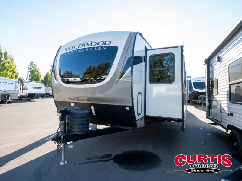 With any Wildwood Heritage Glen travel trailer and fifth wheel by Forest River, the quality construction, attention to detail and design along with a bright and welcoming interior allows you to relax in comfort with conveniences while exploring outdoors. The European Oak colored horizontal plank linoleum flooring is unique, beautiful and durable, and the Saddle colored wood cabinetry with matte black cabinet hardware on the cabinet doors is stylish and beautiful. The heated and enclosed underbelly plus 12V heat pads will help protect your unit from the elements. More features that provide convenience include the power stabilizer jacks, the extra large pass-through storage, and the central switch center plus the back-up camera prep and roof mounted solar panel prep give you choices. There are many more features included whether you choose a travel trailer or fifth wheel!