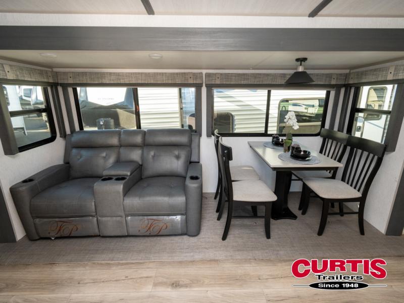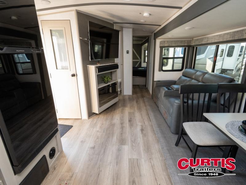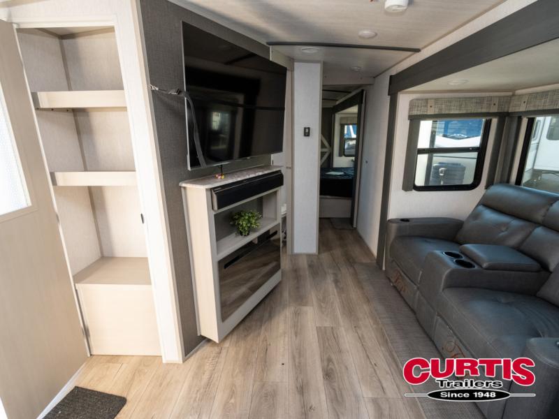 Your family and friends will enjoy each camping trip in this feature-packed Wildwood Heritage Glen travel trailer. Once you arrive at the lake, put out the 19' awning with LED lights before preparing lunch on the outside kitchen/bar. The kids can grab the yard games out of the exterior storage compartments before stretching their legs around the campground. Your crew can get comfortable on the theater seating or the booth dinette, and the 50" LED TV and fireplace will make it feel more like home. The chef of the family will love the extra counter space in the front kitchen as well as a pantry to store dry goods and a 10 cu. ft. residential refrigerator to keep the gang fed all week. The dual-entry bath will create a rear master suite that you are sure to love. Easily store all your clothes in the large wardrobe or in the dresser, and then fall back on the 66" x 80" custom king bed. You even have your own exterior entry door for convenience and a space to add an optional washer and dryer if you choose!