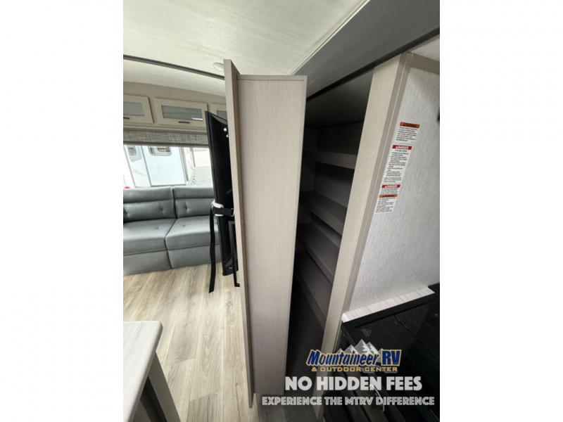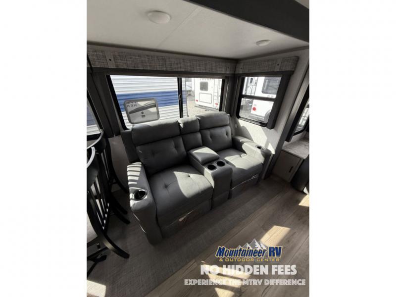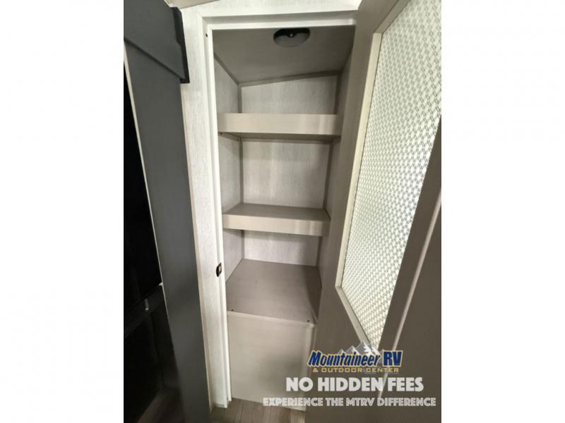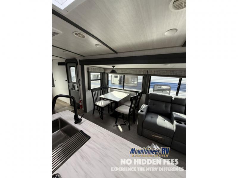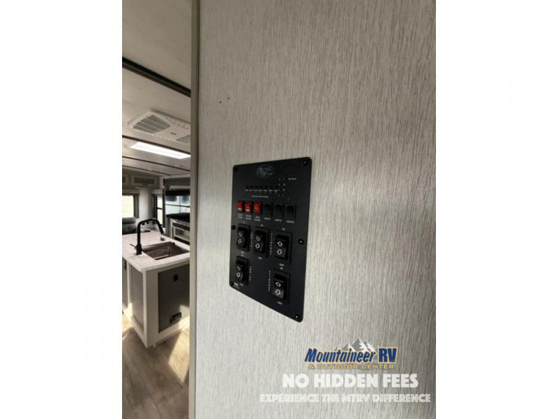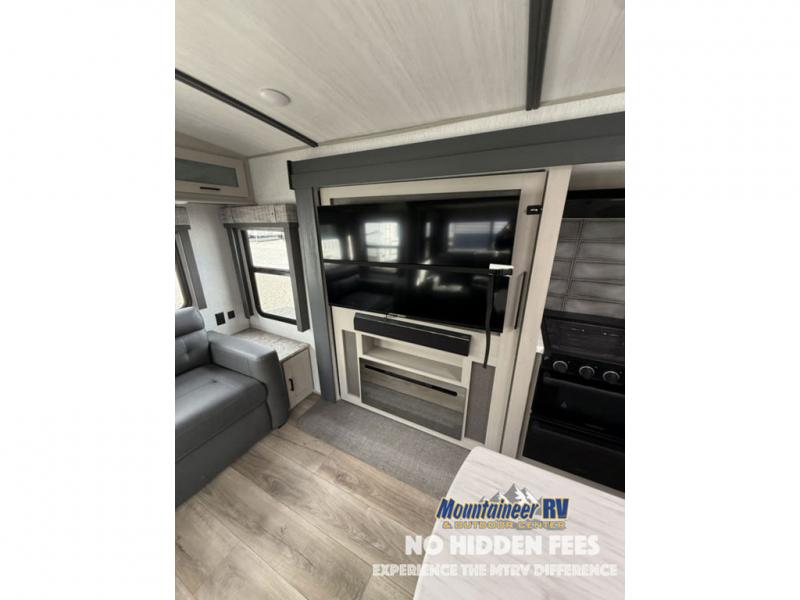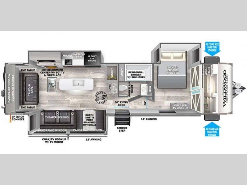 You are going to love the spacious private bedroom with a space-saving door, custom king bed slide, a dresser, and a full-width wardrobe with a space prepped for a washer/dryer option. If you ever decide to get out of bed, you can enjoy a relaxing shower in the residential shower with a skylight and a wide-open kitchen and living area with dual opposing slide outs. The cook will love having a kitchen island, a hutch, a large pantry, plus a black 12V refrigerator. There is an entertainment center with a 50" TV and fireplace plus plenty of seating on the furniture. You can dine at the booth dinette or choose to add the free-standing dinette option if you prefer having your own seat. And don't forget about the natural lighting and views you will receive from the panoramic windows.