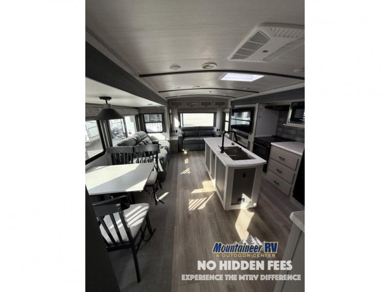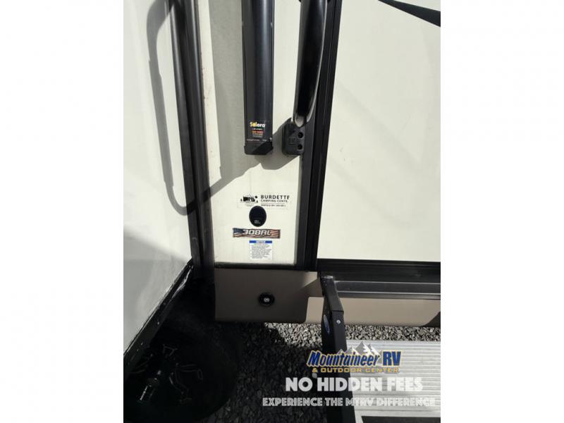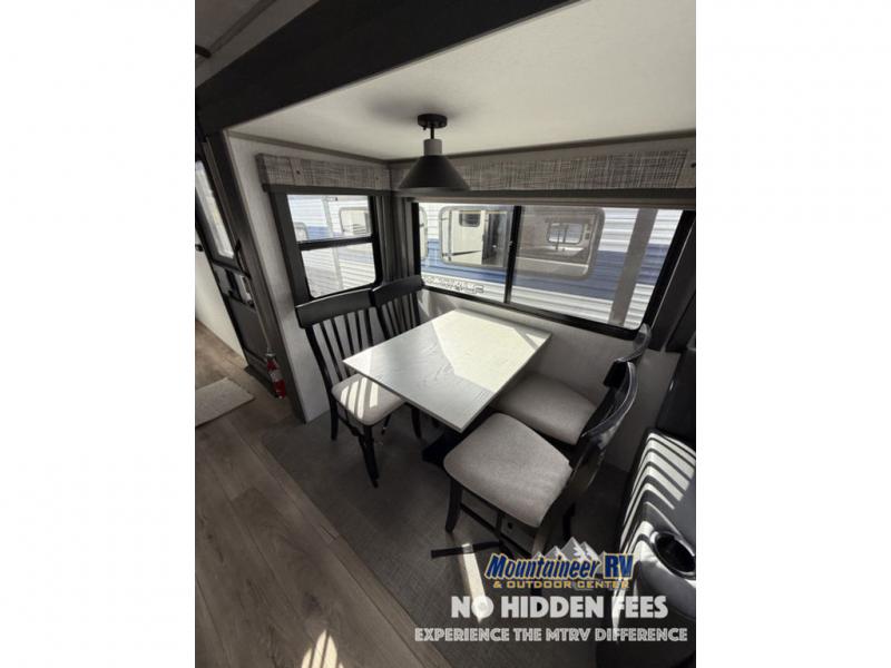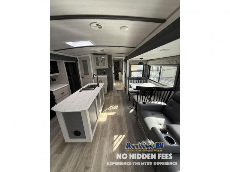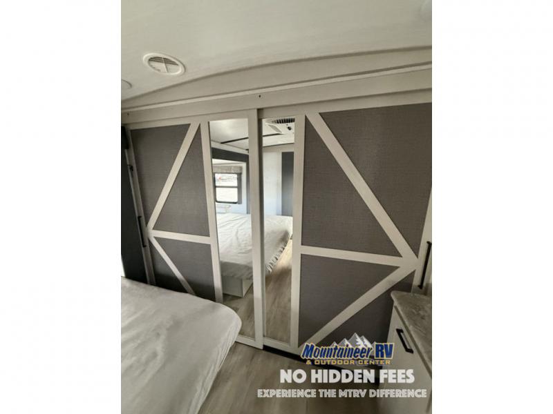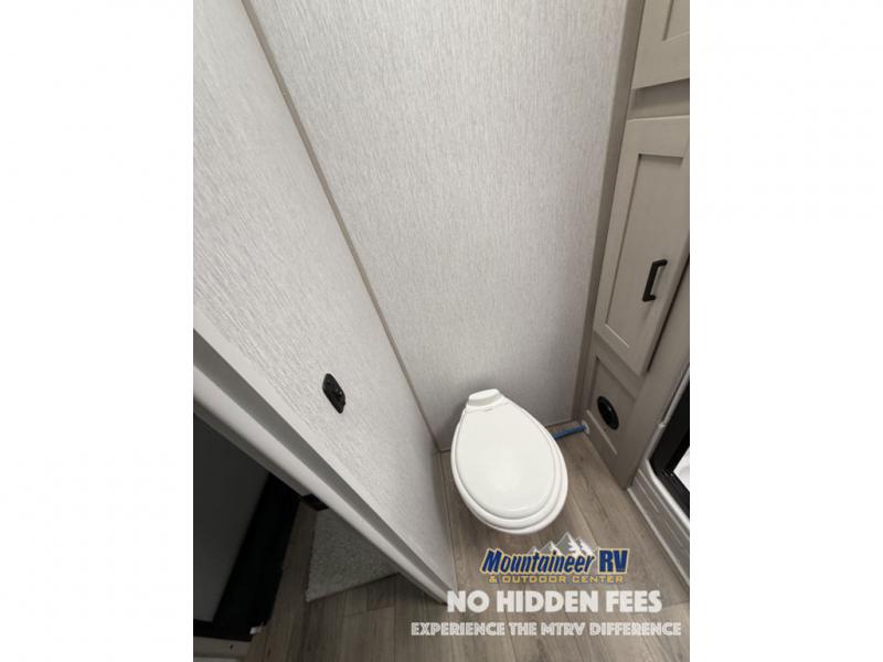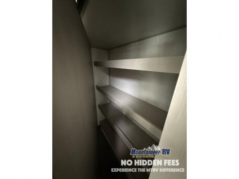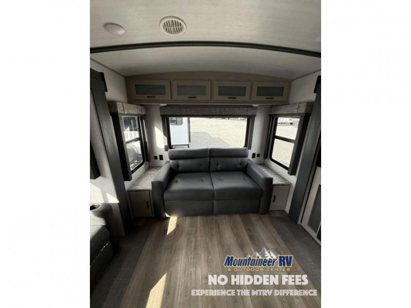 You are going to love the spacious private bedroom with a space-saving door, custom king bed slide, a dresser, and a full-width wardrobe with a space prepped for a washer/dryer option. If you ever decide to get out of bed, you can enjoy a relaxing shower in the residential shower with a skylight and a wide-open kitchen and living area with dual opposing slide outs. The cook will love having a kitchen island, a hutch, a large pantry, plus a black 12V refrigerator. There is an entertainment center with a 50" TV and fireplace plus plenty of seating on the furniture. You can dine at the booth dinette or choose to add the free-standing dinette option if you prefer having your own seat. And don't forget about the natural lighting and views you will receive from the panoramic windows.