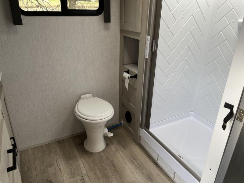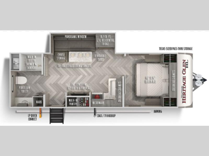 The Wildwood Heritage Glen Hyper-Lyte travel trailer by Forest River offers stability with a wide stance axle system, easy setup with a power tongue jack with an LED docking light, and safe entry with the Step Above aluminum entry steps. The XL Max-Tint panoramic window(s) in the main slide bring the outside inside, plus the kitchen offers a recessed glass stove top cover, a Midnight glass range hood and microwave, plus more. You will also find a back-up camera prep and solar prep, an outdoor shower, black-accented upgraded aluminum wheels, and many more exterior conveniences.