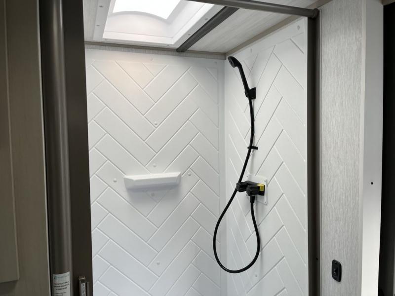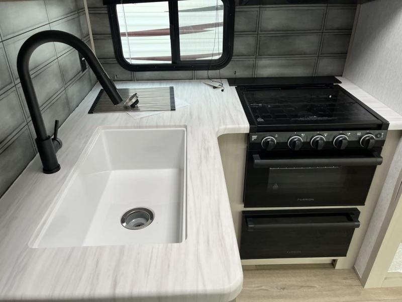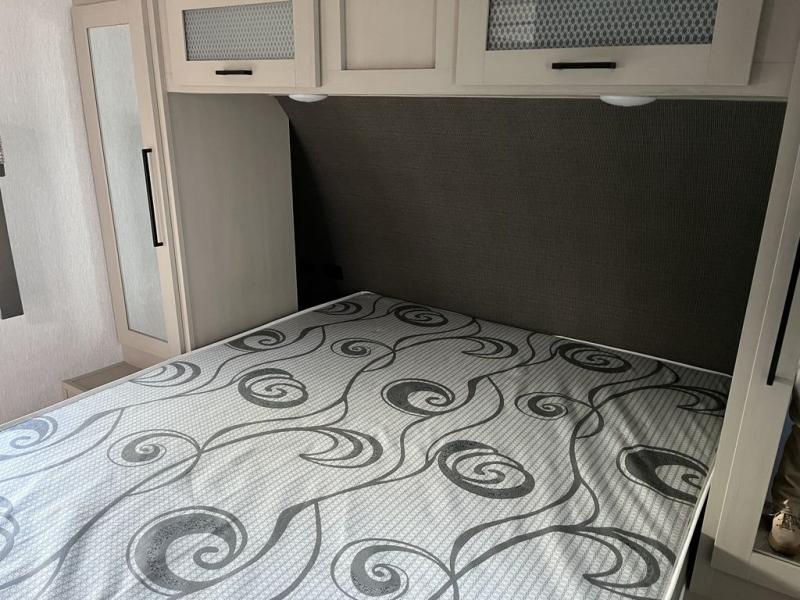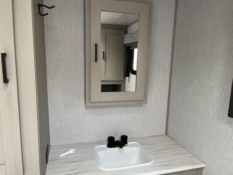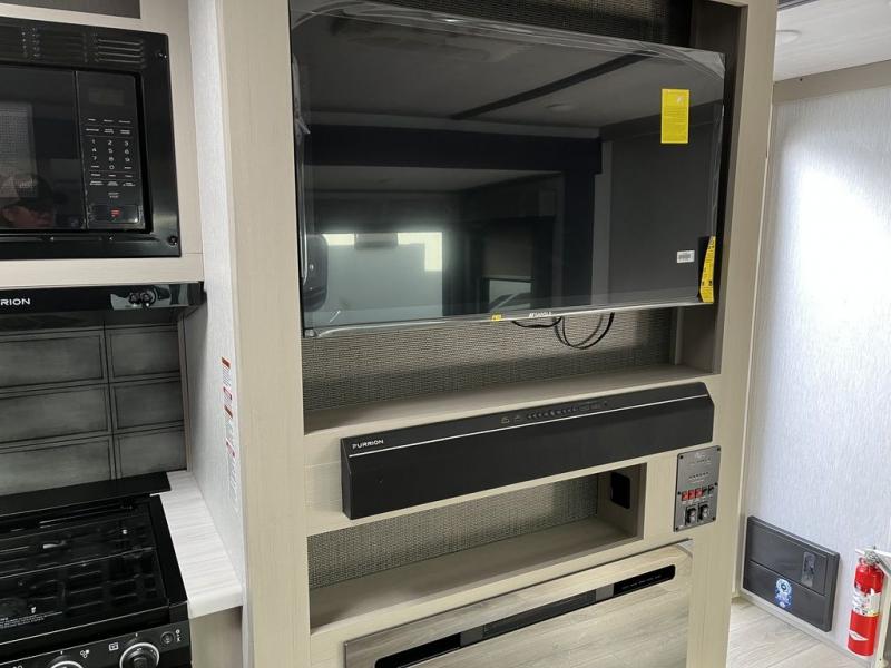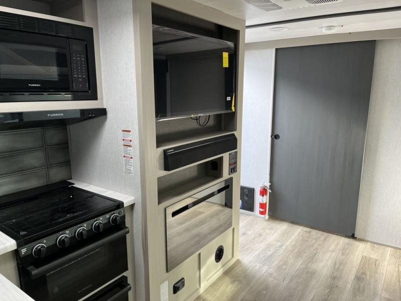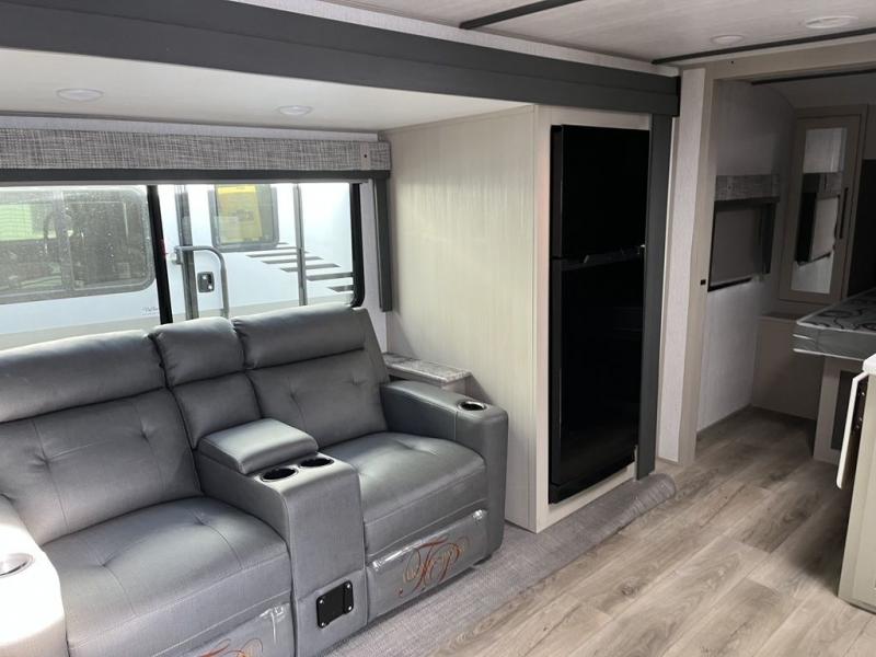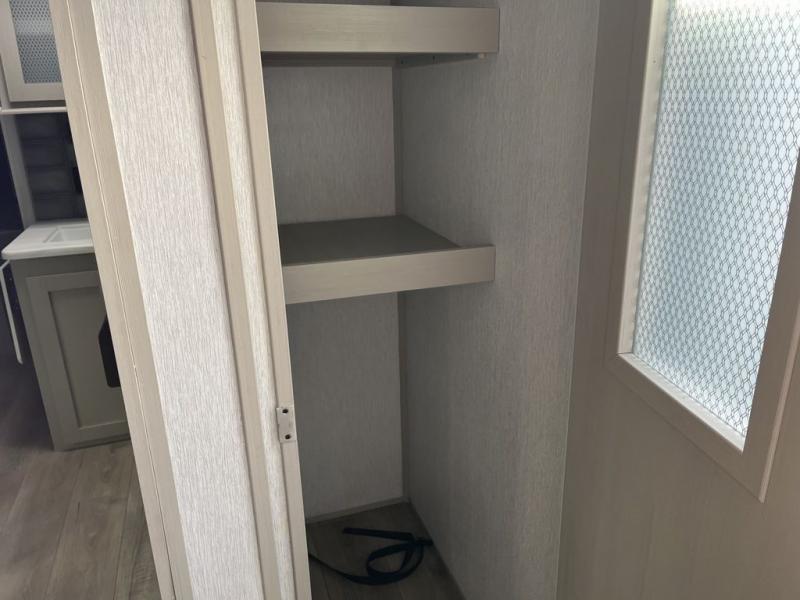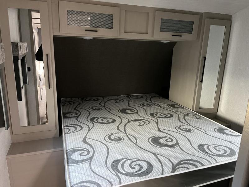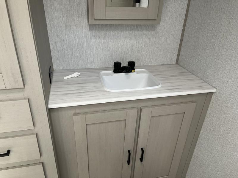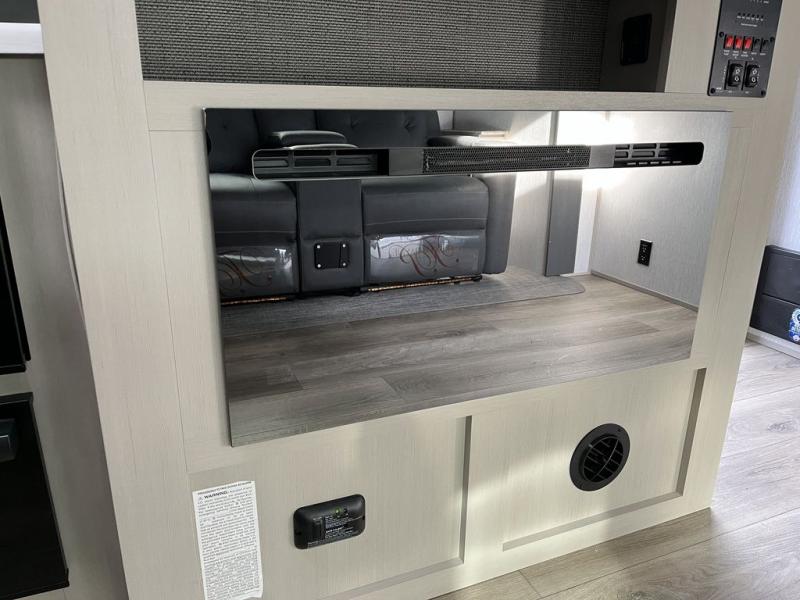 If you like to be different, this couples trailer offers theater seating and a removable table that you can relax on and dine at. There is also a 40" LED TV and a fireplace right across from the seats for perfect viewing. The kitchen has full amenities including a 12V black refrigerator and walk-in pantry. The rear bath offers a walk-in shower with a skylight for more natural lighting, a large linen cabinet for all your essentials, a wardrobe and everything else you need to stay refreshed and clean without having to use the public facilities. The front bedroom offers a space savings door, an RV queen bed and dual wardrobes. You will also find a Texas-sized pass-through compartment outside for the outdoor gear such as camping chairs, charcoal, and such.