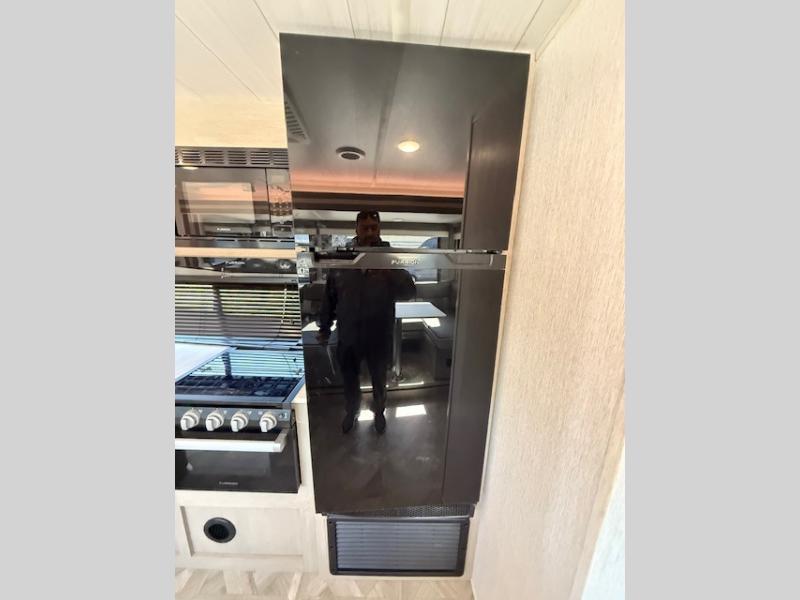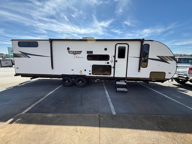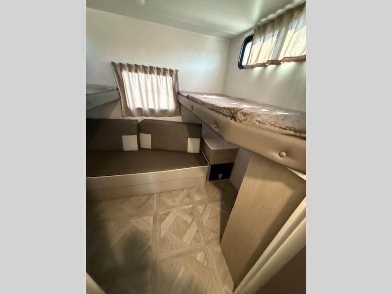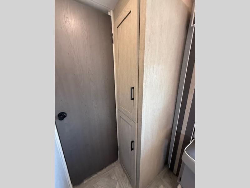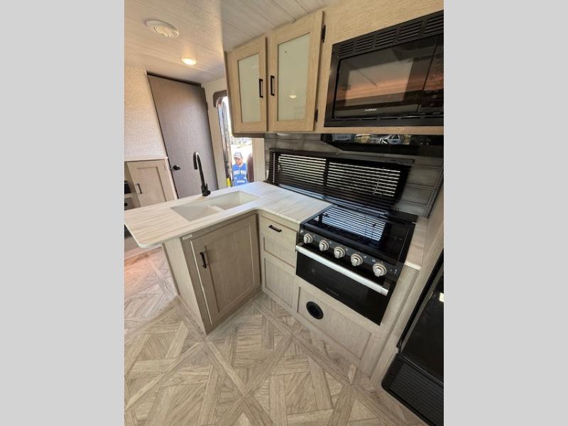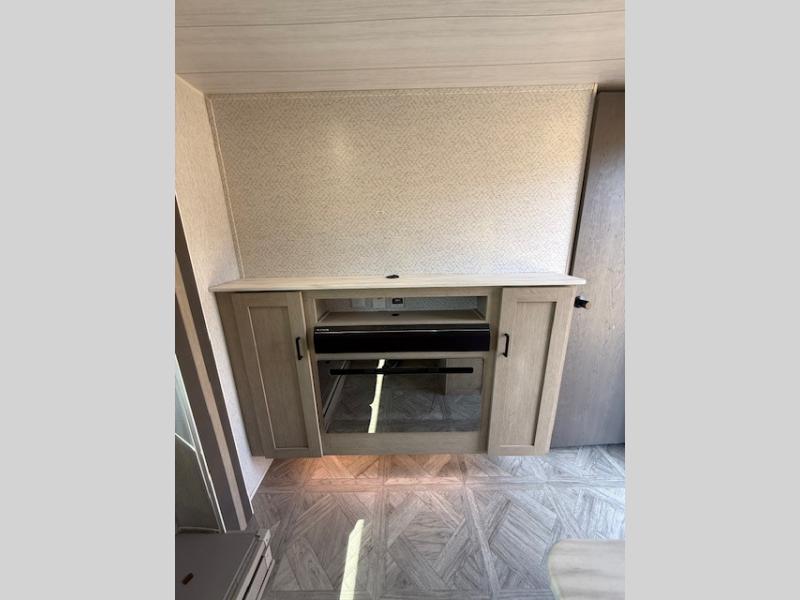 Dual entry doors add convenience to every trip taken with this travel trailer! You will find sleeping space for ten when you utilize the furniture for extra sleeping space. There is plenty of storage for your linens, clothes, dishes and food, plus the Texas-sized pass-through compartment allows you to stow away camping chairs, fishing poles, charcoal and such. The L-shaped kitchen offers plenty of room to cook while everyone is moving about, or you can make a few meals on the outside kitchen that includes an exterior griddle and refrigerator. You will also have your own private bedroom up front while the kids or your friends sleep on the double size bunks or the furniture once set up for bedtime. And the 40" LED TV and fireplace will be popular on those chilly nights.
