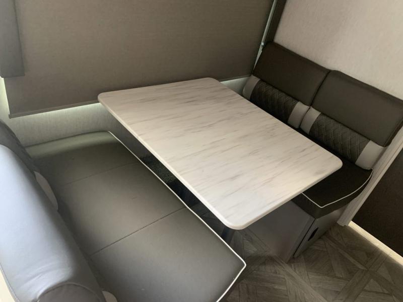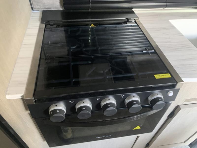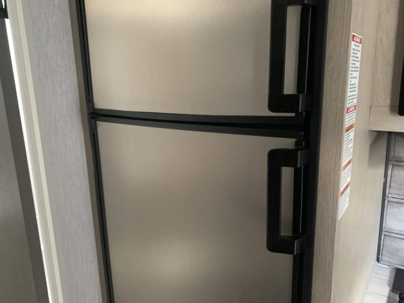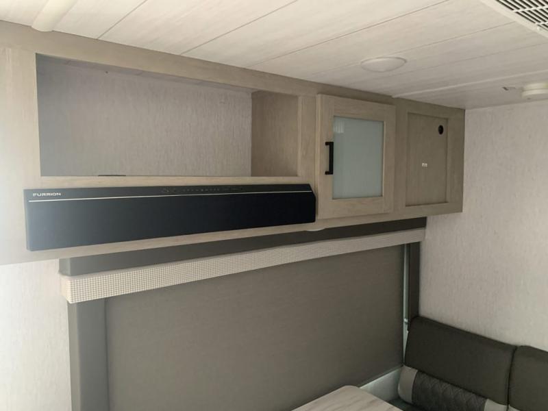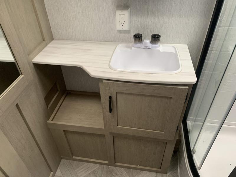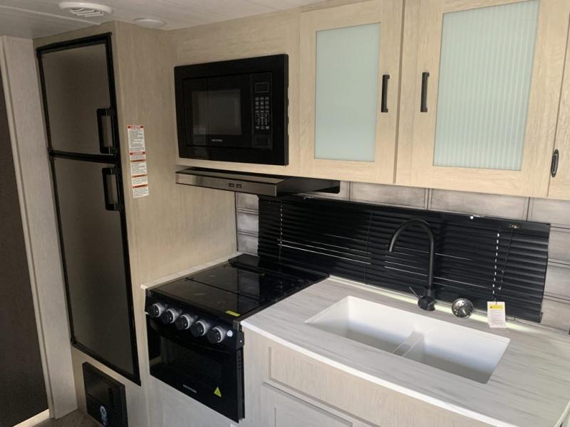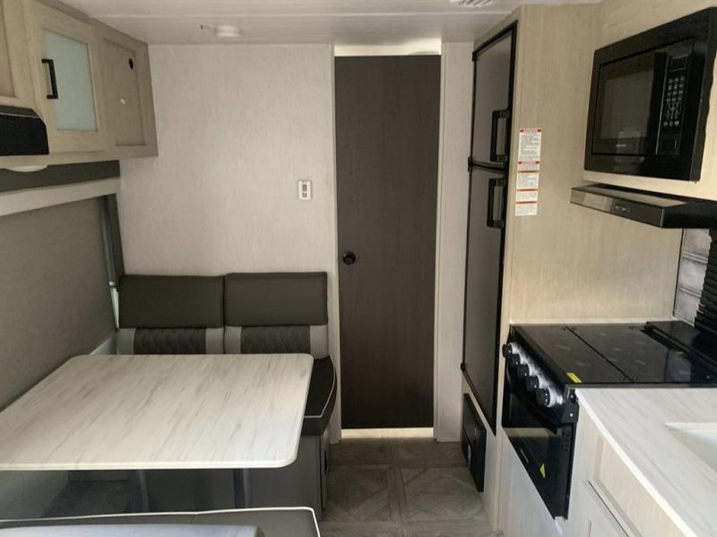 This Wildwood X-Lite travel trailer is a lightweight unit that offers you a spacious rear bathroom including a vanity with medicine cabinet above, a walk-in radius shower, and additional mirrored linen storage for your towels and things. You will appreciate the fact that you can fold away the bed in this trailer to reveal a Jiffy sofa for afternoon relaxation, and the booth dinette is another place to relax and enjoy a meal, a card game, or a good book with a hot cup of coffee. The seamless countertops in the kitchen are both stylish and functional, and the microwave and three-burner cooktop will help you prepare a meal any time of the day.