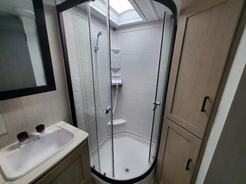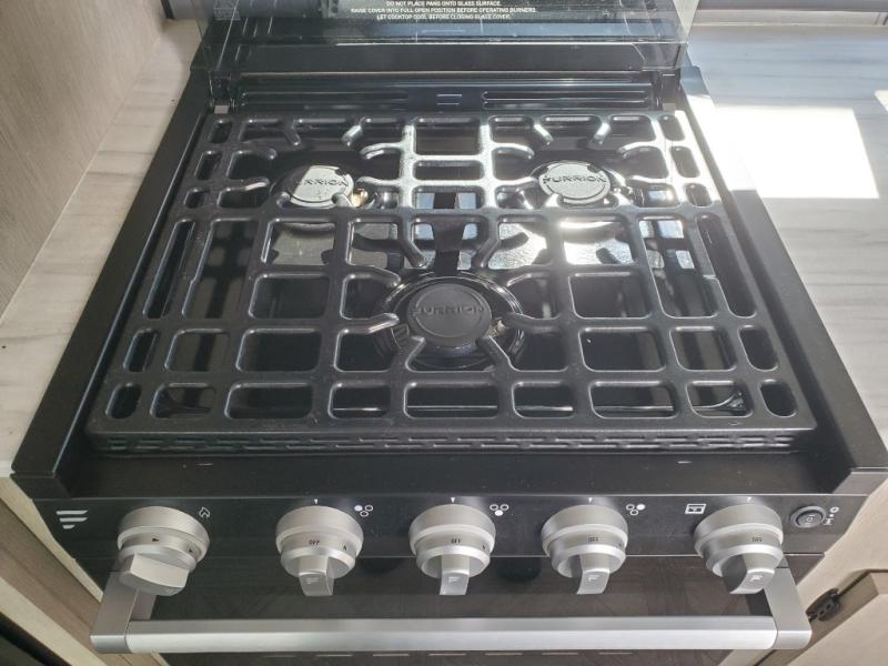 This Wildwood X-Lite travel trailer is a lightweight unit that offers you a spacious rear bathroom including a vanity with medicine cabinet above, a walk-in radius shower, and additional mirrored linen storage for your towels and things. You will appreciate the fact that you can fold away the bed in this trailer to reveal a Jiffy sofa for afternoon relaxation, and the booth dinette is another place to relax and enjoy a meal, a card game, or a good book with a hot cup of coffee. The seamless countertops in the kitchen are both stylish and functional, and the microwave and three-burner cooktop will help you prepare a meal any time of the day.