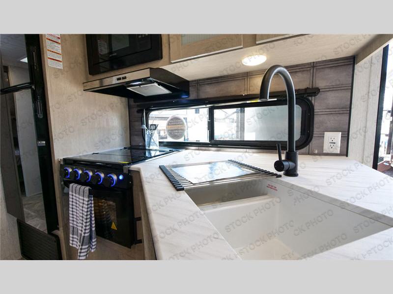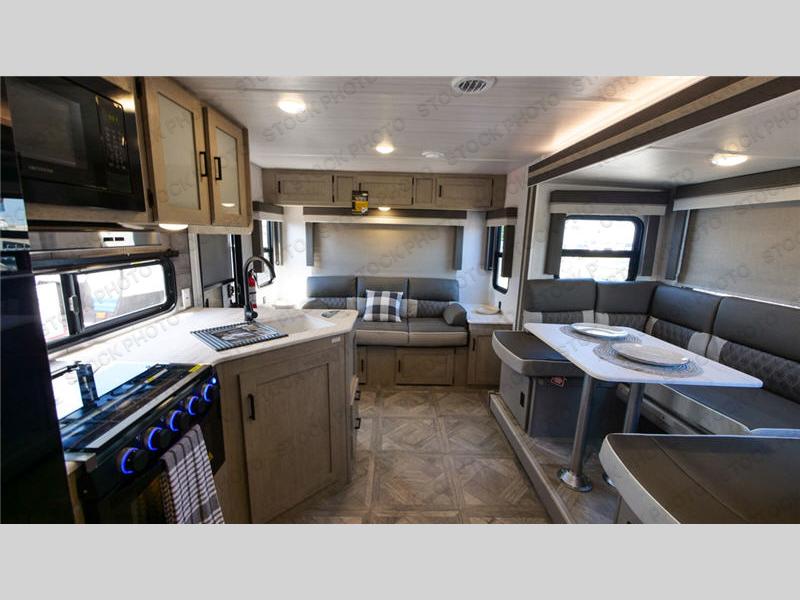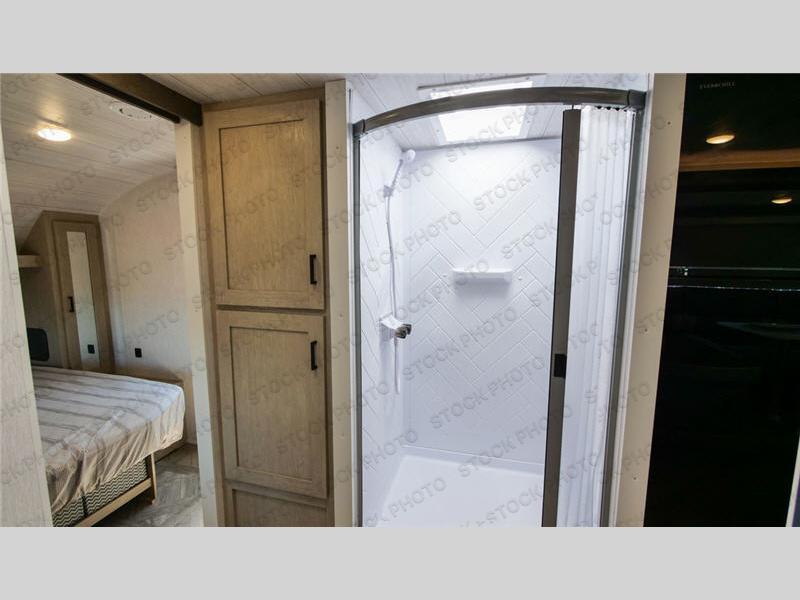 Whether it's a family vacation or a romantic getaway with your significant other, this Wildwood X-Lite travel trailer will make it the very best! The master bedroom has many places to store items with the walk-in closet and bedside closets plus nightstands, and the walk-through bath also provides additional storage with a linen closet and vanity. The kitchen has modern amenities, like an 11-cubic foot refrigerator, a microwave, and a three-burner cooktop, plus the U-shaped dinette has panoramic windows that surround it to create an inviting space to spend your time. And you will enjoy the protection from the 16' power awning and the sturdy Step Above steps at the entry.
