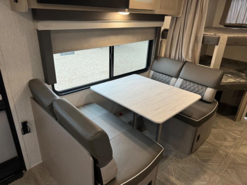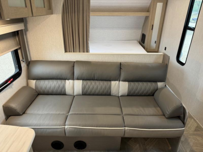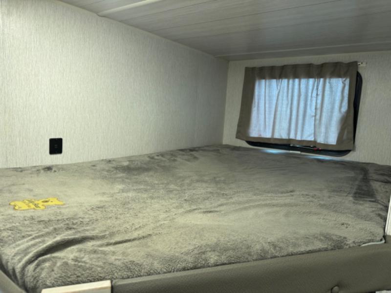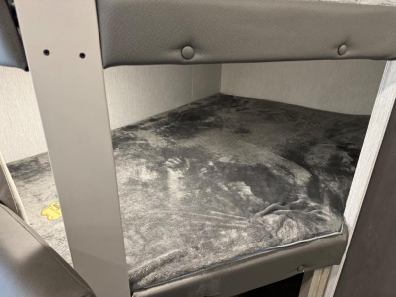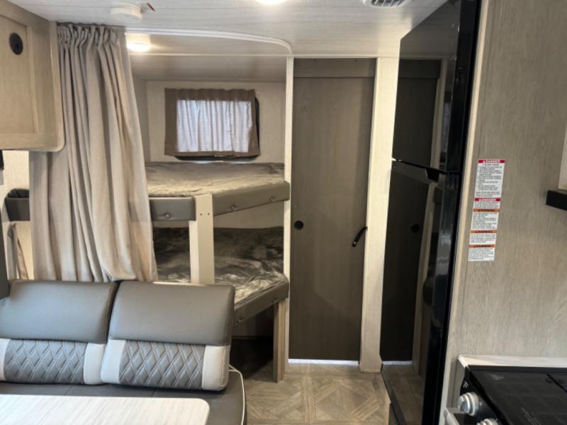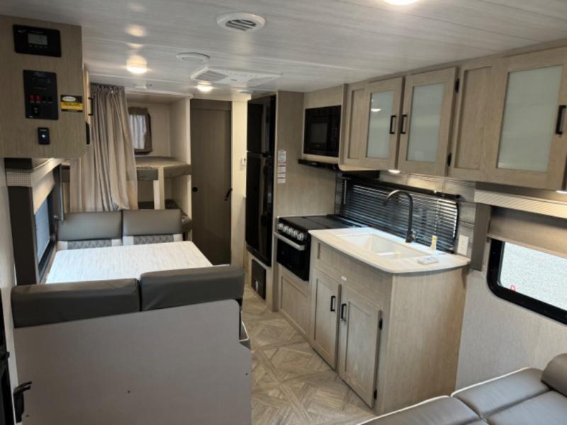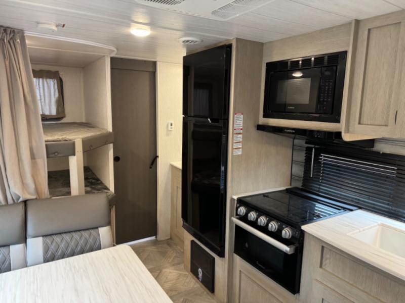 This Wildwood X-Lite travel trailer is packed with features! There is a walk-around custom king bed up at the front that can be sectioned off from the rest of the trailer with a privacy curtain, and the double-size bunks in the back of this trailer will provide you with a compact sleeping space for your little ones. The booth dinette is going to be a great place to sit down together and have a meal when the bugs are too bad outside to sit at the picnic table, and there is also a sofa for relaxation while inside. You will also appreciate the look and function of the seamless countertops in the kitchen, and the 11-cubic foot refrigerator will easily keep your perishable items fresh. There is also an outside camp kitchen option for more choices when cooking for the family.