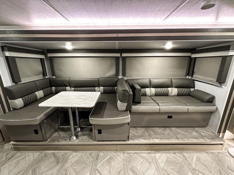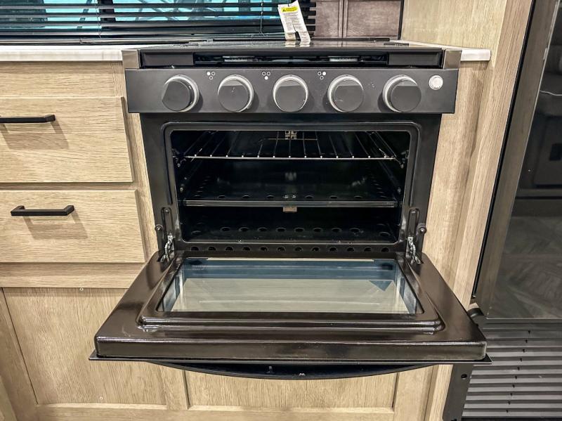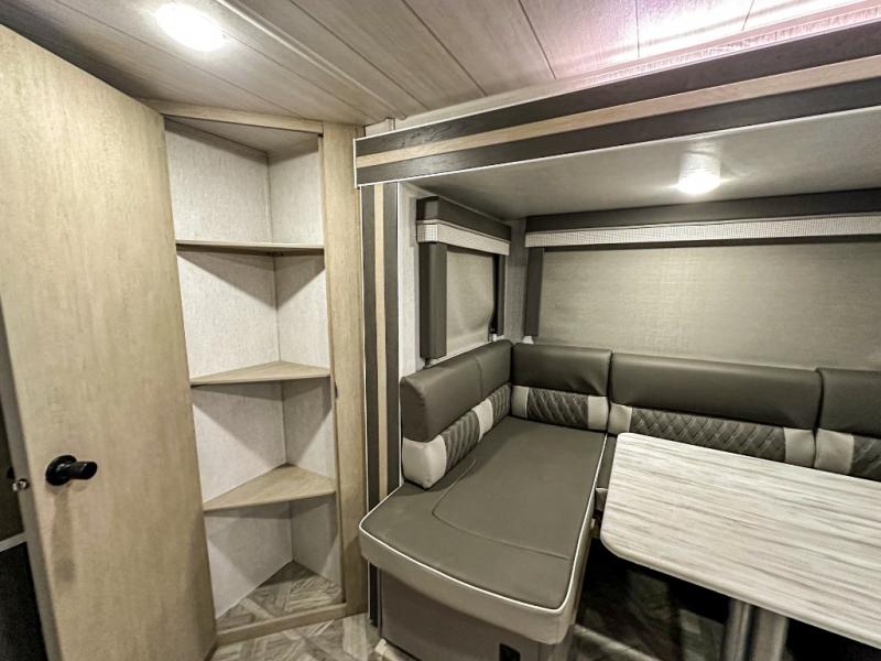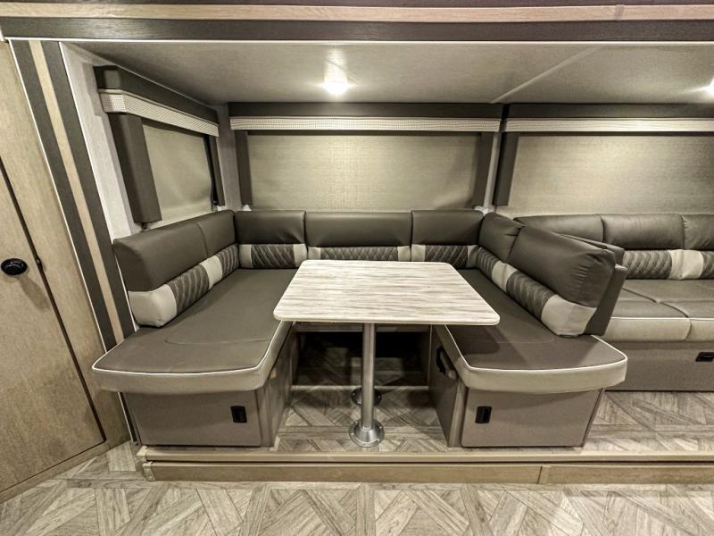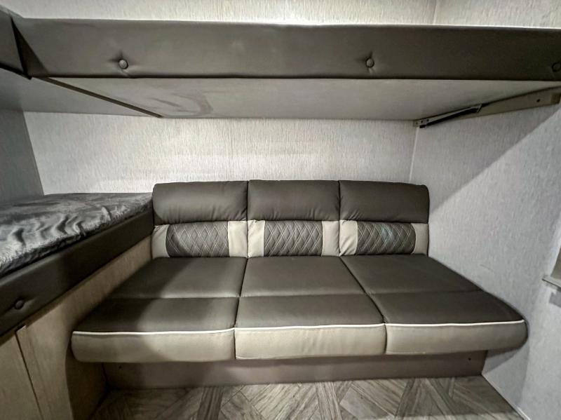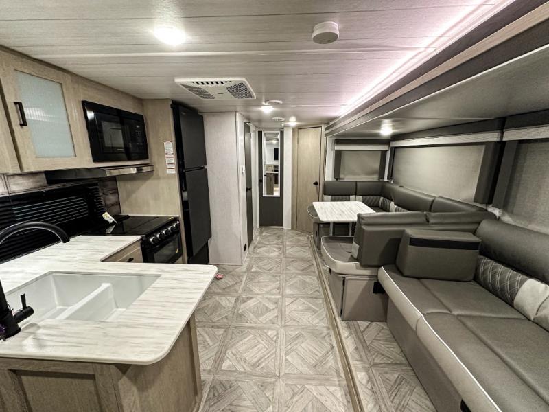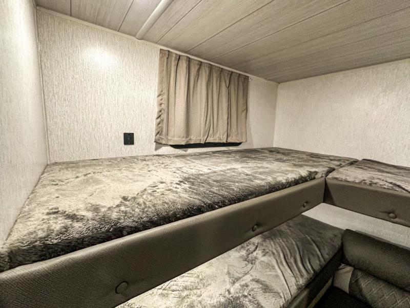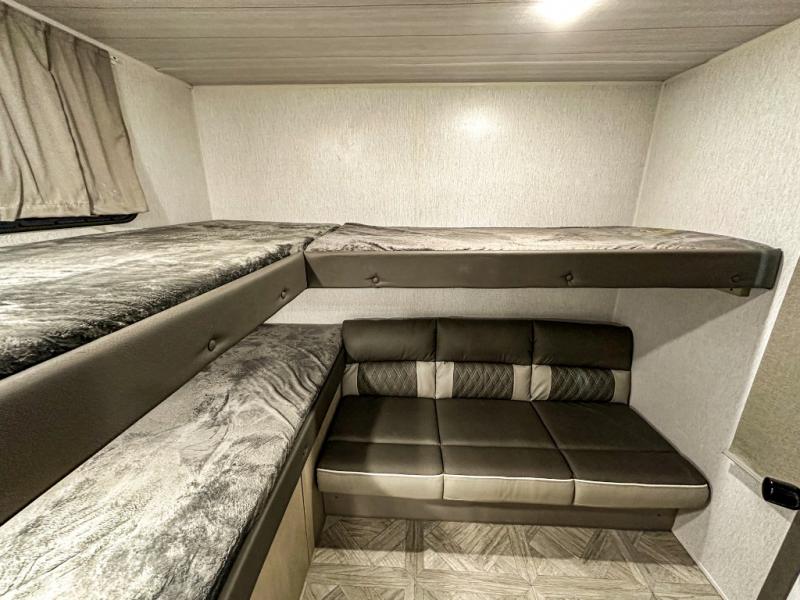 If you like to travel with a large crew, choose this Wildwood X-Lite travel trailer! This trailer has two private sleeping spaces with a private bedroom up front and a private bunkhouse in the back. Not only does the bunkhouse have three bunk beds, but it also has a closet for storage and a jiffy sofa for lounging. In the main living area, there is a large slide that holds the U-shaped dinette and sofa. These pieces of furniture are a part of the Versa Lounge, and you can customize them to function as you need them to. The panoramic windows surround the dinette and sofa so that you can take in the scenic views while you relax. You even have an outdoor camp kitchen to make it more convenient.
