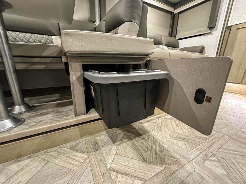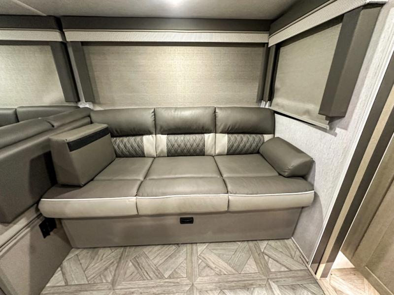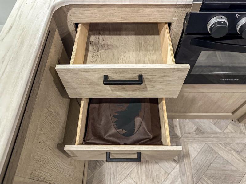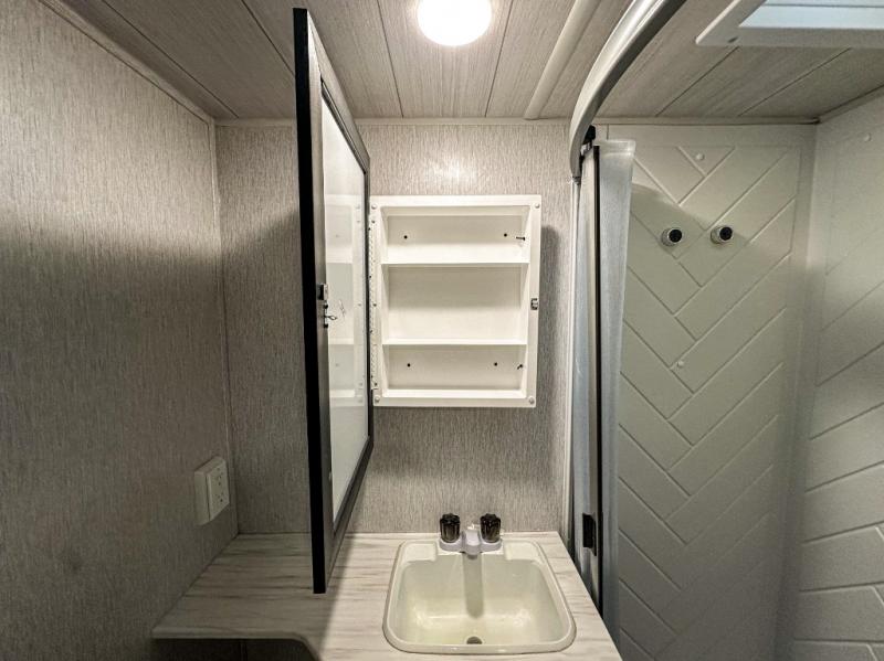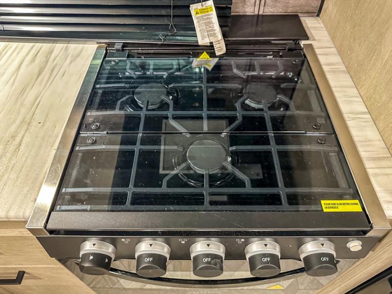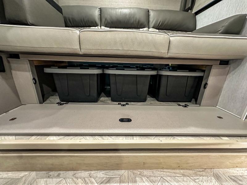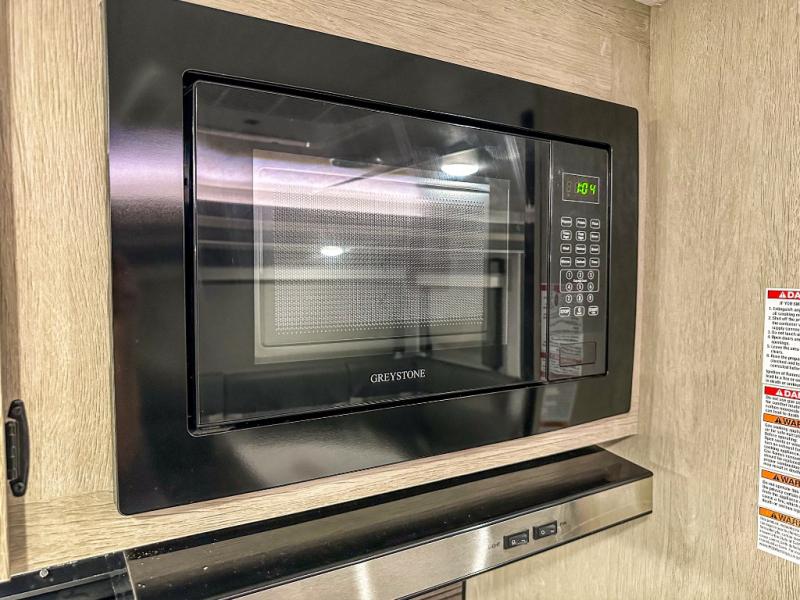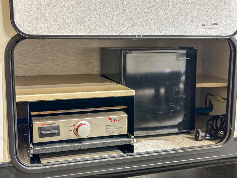 If you like to travel with a large crew, choose this Wildwood X-Lite travel trailer! This trailer has two private sleeping spaces with a private bedroom up front and a private bunkhouse in the back. Not only does the bunkhouse have three bunk beds, but it also has a closet for storage and a jiffy sofa for lounging. In the main living area, there is a large slide that holds the U-shaped dinette and sofa. These pieces of furniture are a part of the Versa Lounge, and you can customize them to function as you need them to. The panoramic windows surround the dinette and sofa so that you can take in the scenic views while you relax. You even have an outdoor camp kitchen to make it more convenient.