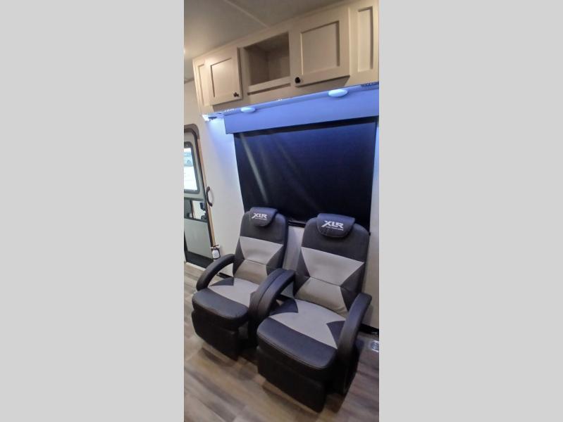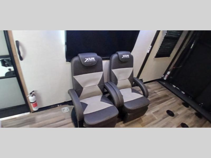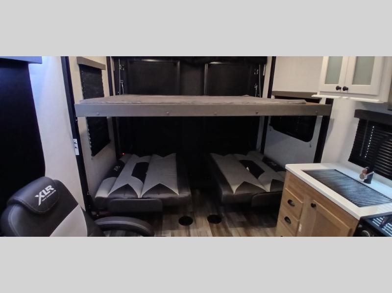 With the XLR Hyper Lite toy hauler travel trailer by Forest River, there is a wider interior with a 74" width even when the slides are retracted in so you can enjoy modern decor, at-home amenities and custom styling. The garages are spacious and include 5,000 lb. cargo tie downs that are anchored to steel plates, an insulated floor, a black rear privacy screen, a ramp patio cable kit for outdoor fun above ground, and Alumi-tread rear entry steps to mention a few highlights. More standout features include MORryde CRE3000 premium suspension that smooths out even the toughest of roads, heavy-duty Dexter axles offering the best in class carrying capacities, and the XLR fully enclosed "Body Armor" underbelly that is insulated and uses a panel system for ease of access. So when you want to play hard, choose an XLR Hyper Lite that offers upgraded features, quality construction, and allows you the control of venturing on or off road!
