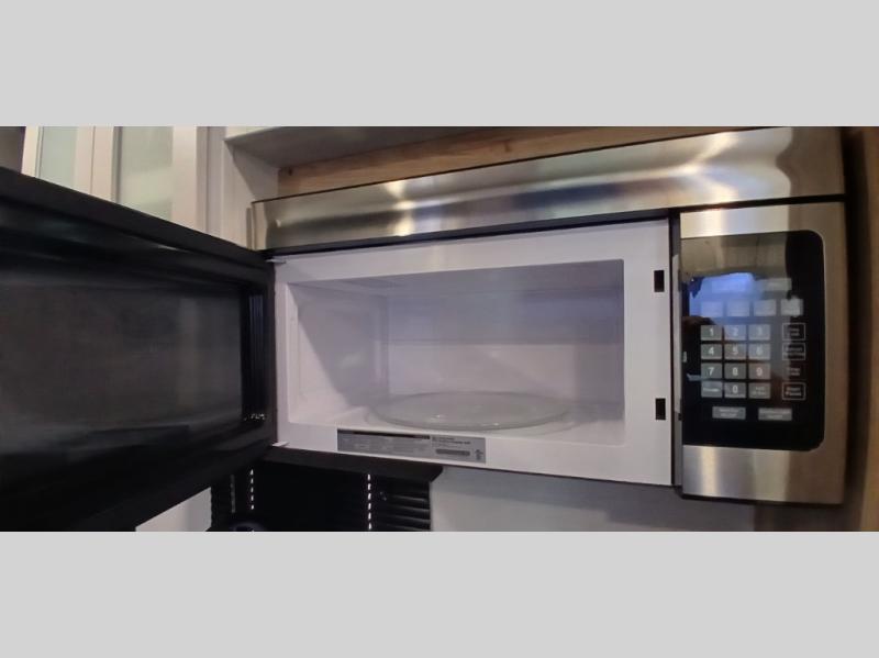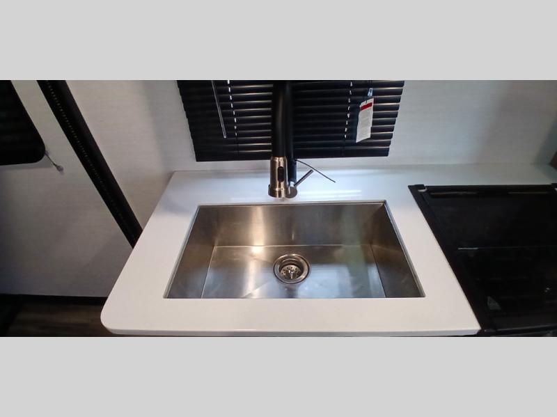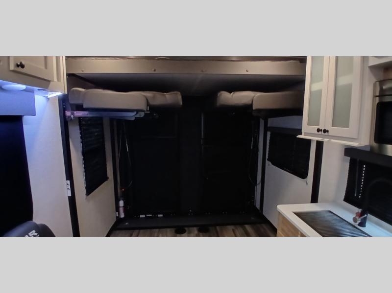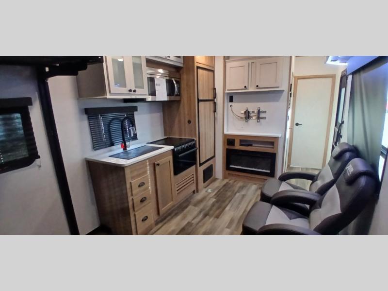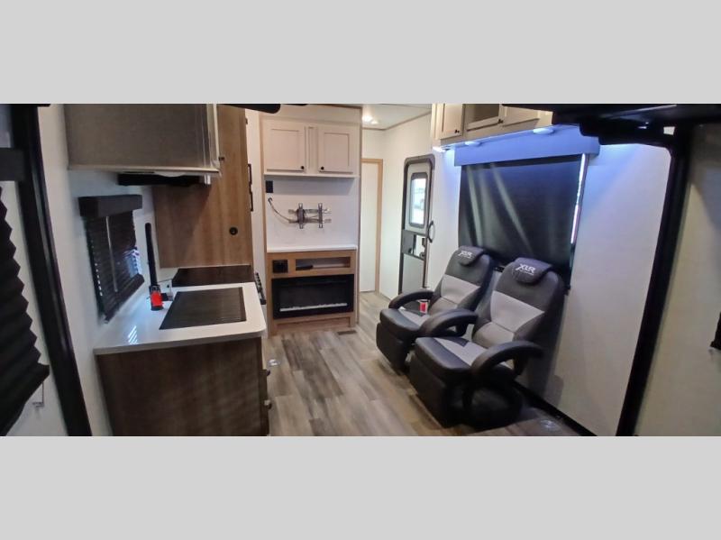 After you hit the trails, you can relax in the garage that becomes your kitchen and living area as well as a bedroom once the toys have been unloaded down the weather-proof ramp door. The galley kitchen offers an oven with cast iron three-burner cooktop, hardwood cabinet doors, adjustable hidden hinge cabinet hardware, full extension four-sided craftsman drawers, and a stainless steel single basin sink for easy cleanup, plus more! The dual sofas with dinettes give you a place for your cellphones, keys and such after dining, the two lounge chairs with an end table in between allow you to relax after a fun ride and enjoy the electric fireplace. The double entry bathroom is convenient especially from the front bedroom with a queen bed slide for more floor space, front bench window seating, and clothing storage.
