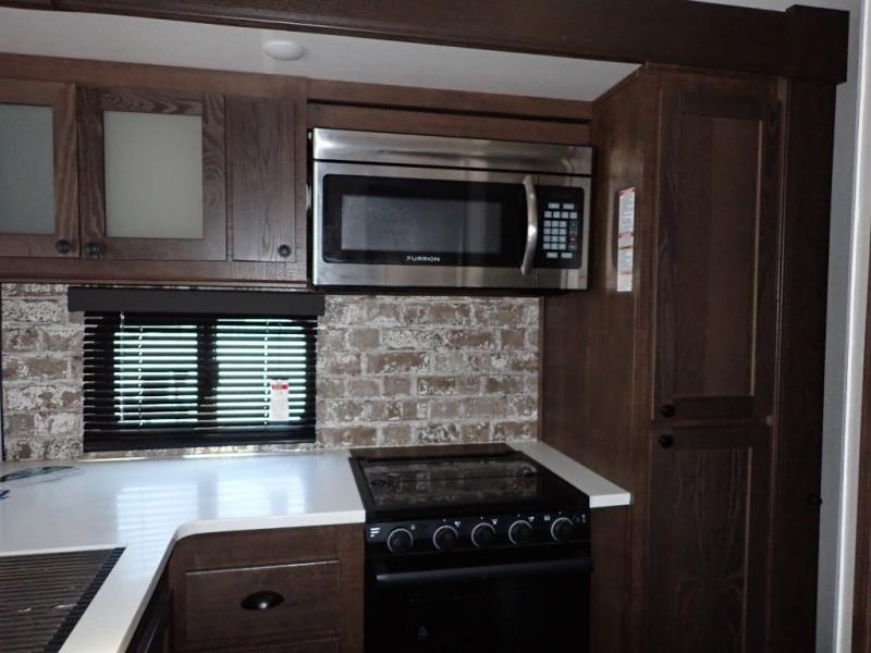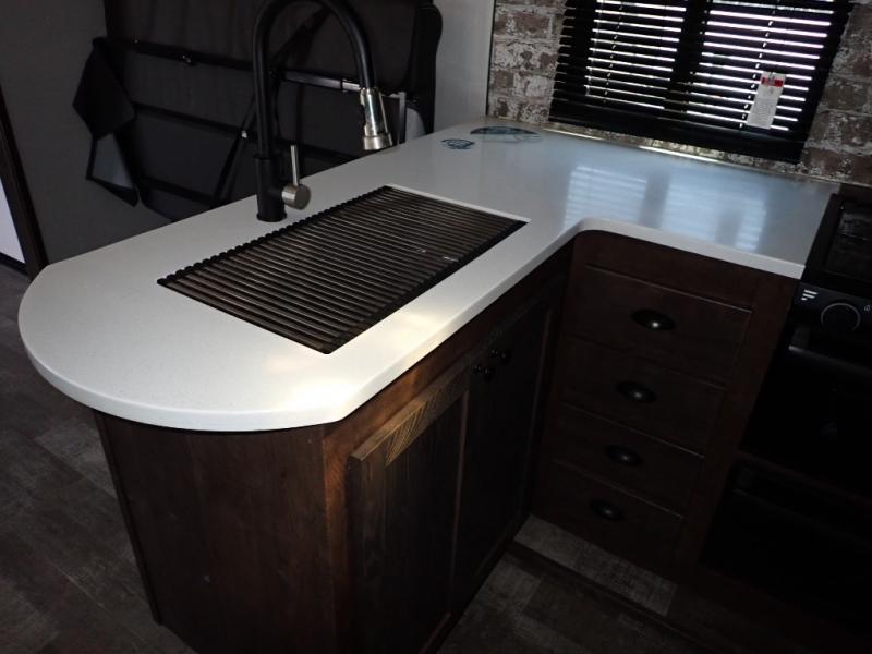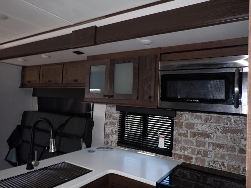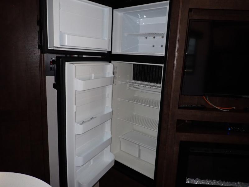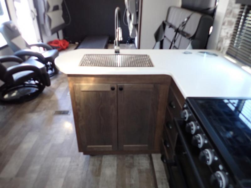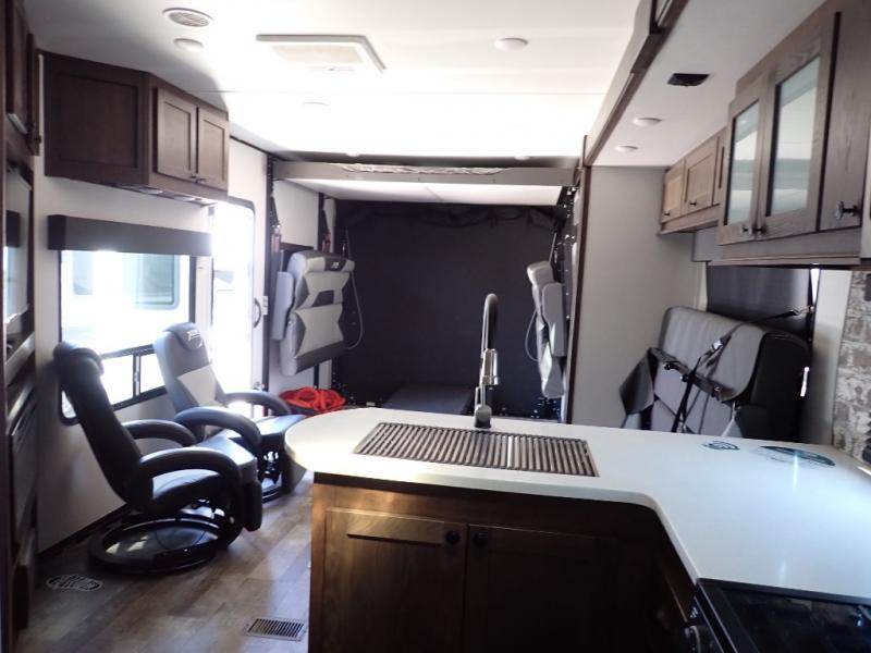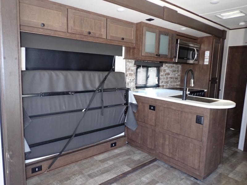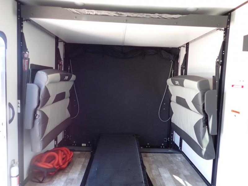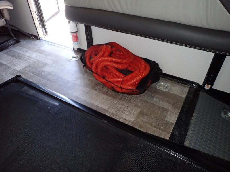 Load up your toys using the weather-proof ramp door into the garage to safely travel to your destination. After unloading, you can easily set up the ramp patio door kit, the 20' electric awning with LED lights, and the interior slide out so you can enjoy more floor space when cooking and relaxing in this combined living and kitchen area. You will have three sofas, removable dinette table, the two lounge chairs to sit and visit, dine at or watch the 39" TV with fireplace below. The cook will love the kitchen peninsula countertop, the stainless steel single basin sink, the 17" oven with cast iron three-burner cooktop, and the refrigerator to stock up on beverages and cold items. And there is sleeping space in the front master suite on the walk-around queen bed, and in the living area on the sofas and the electric bunk.
