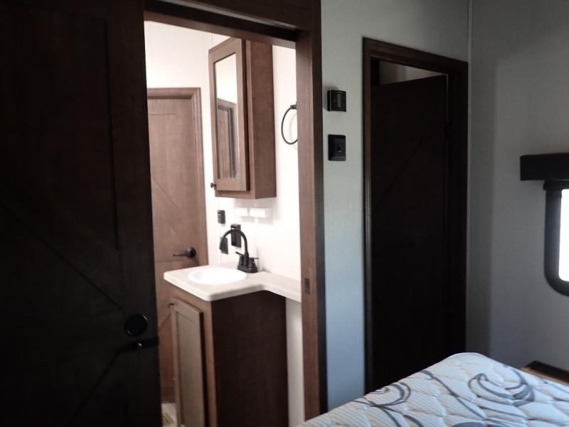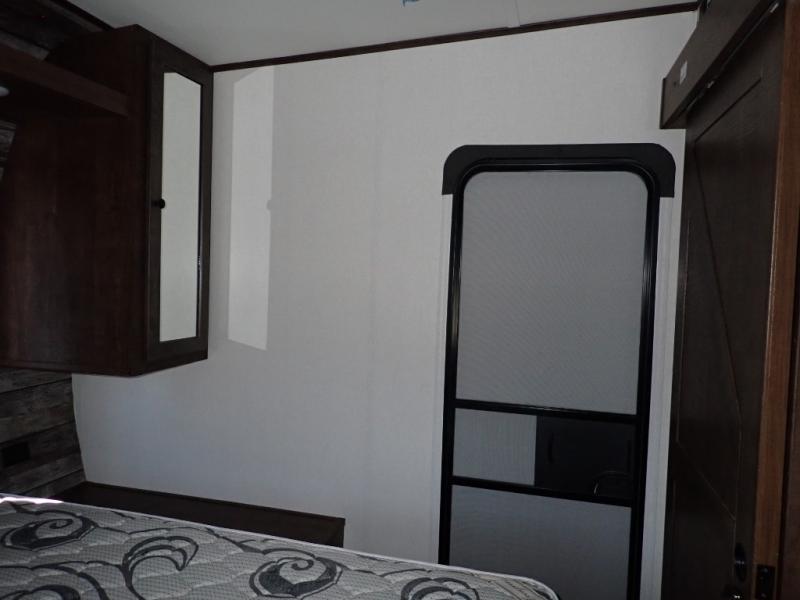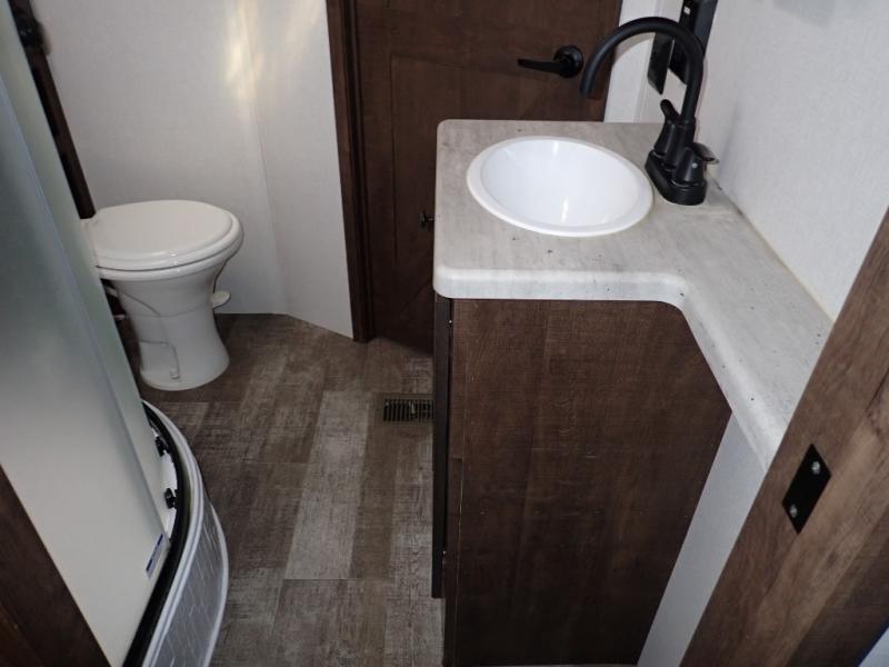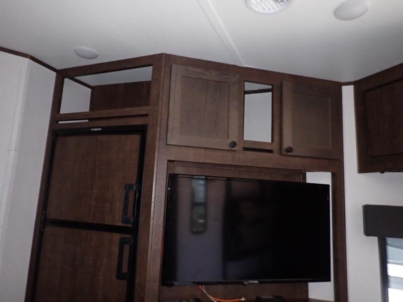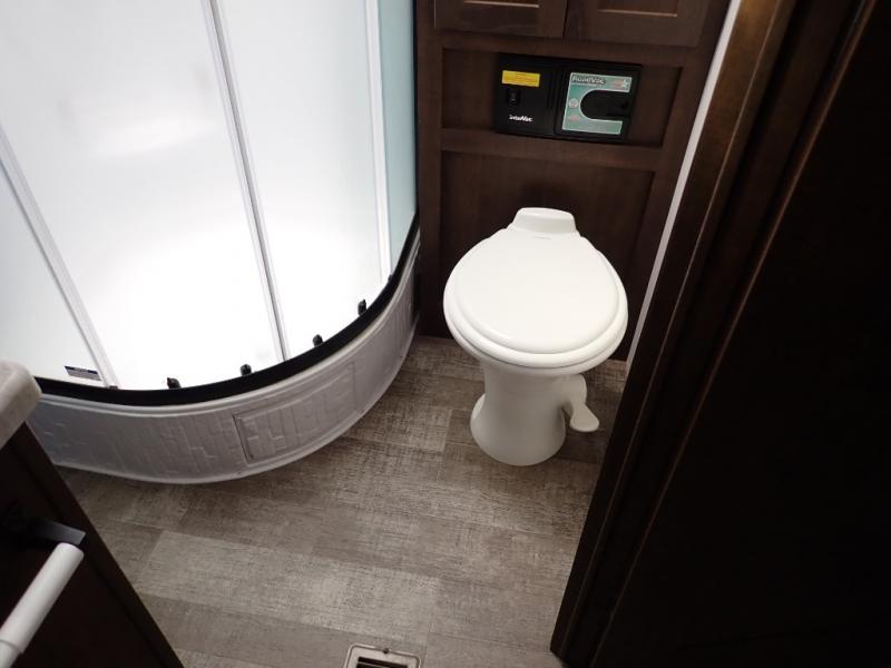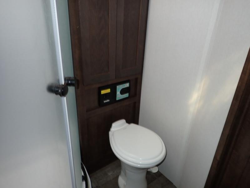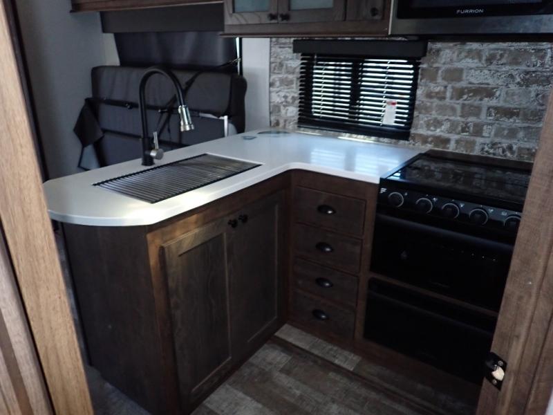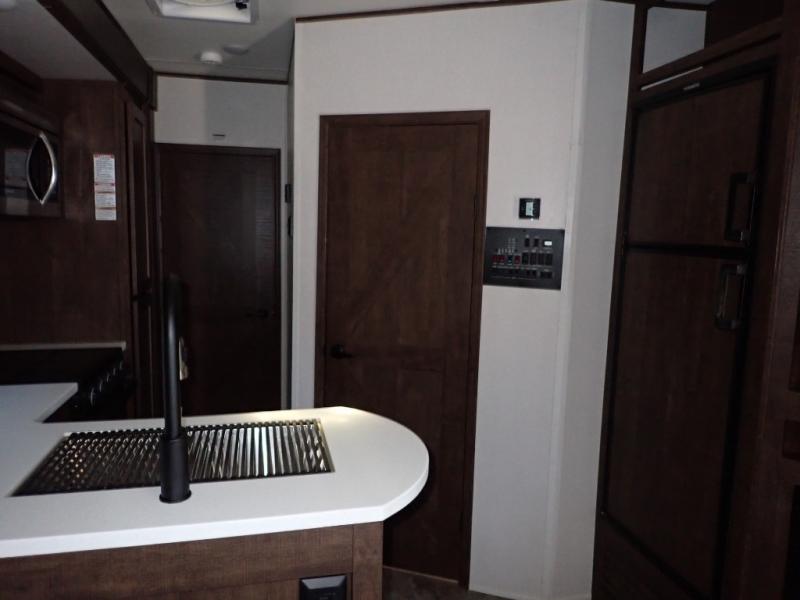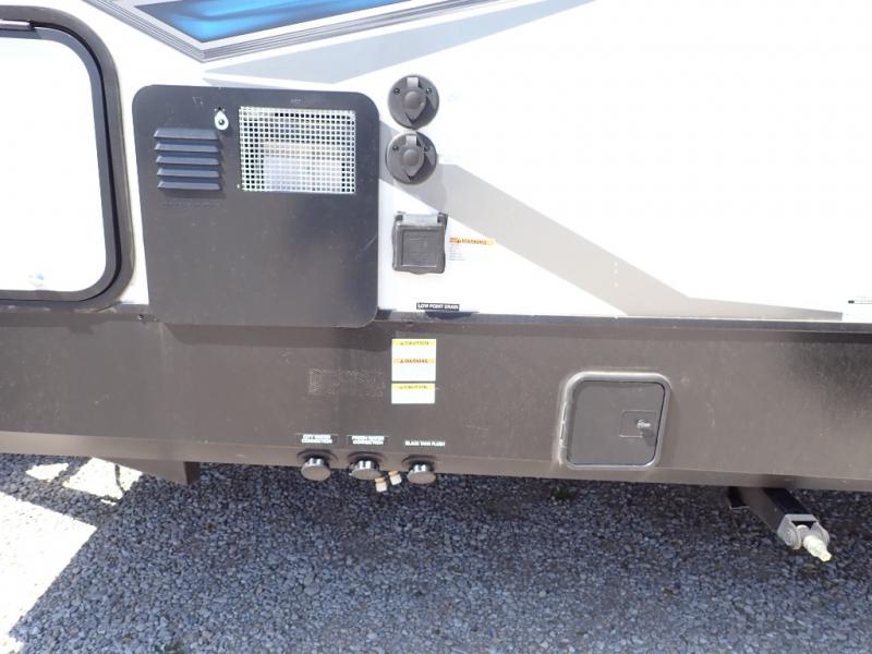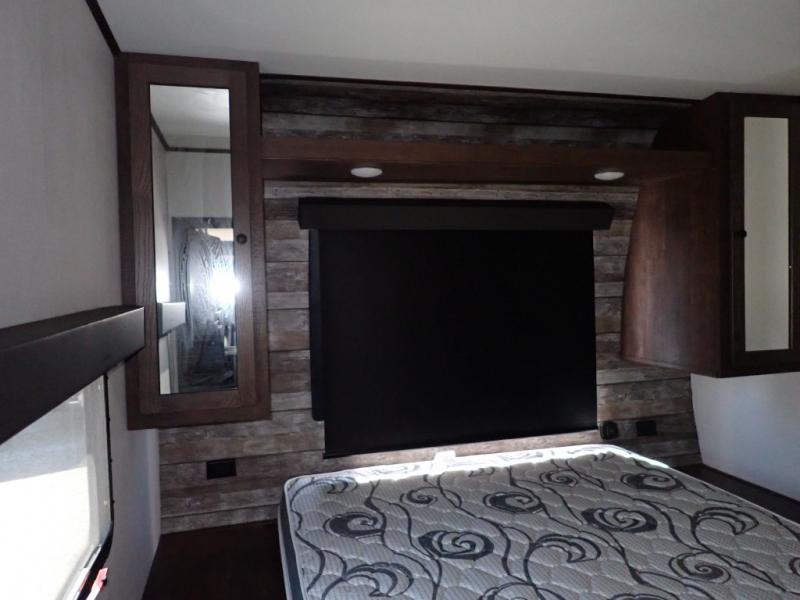 Load up your toys using the weather-proof ramp door into the garage to safely travel to your destination. After unloading, you can easily set up the ramp patio door kit, the 20' electric awning with LED lights, and the interior slide out so you can enjoy more floor space when cooking and relaxing in this combined living and kitchen area. You will have three sofas, removable dinette table, the two lounge chairs to sit and visit, dine at or watch the 39" TV with fireplace below. The cook will love the kitchen peninsula countertop, the stainless steel single basin sink, the 17" oven with cast iron three-burner cooktop, and the refrigerator to stock up on beverages and cold items. And there is sleeping space in the front master suite on the walk-around queen bed, and in the living area on the sofas and the electric bunk.