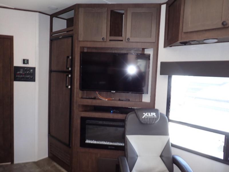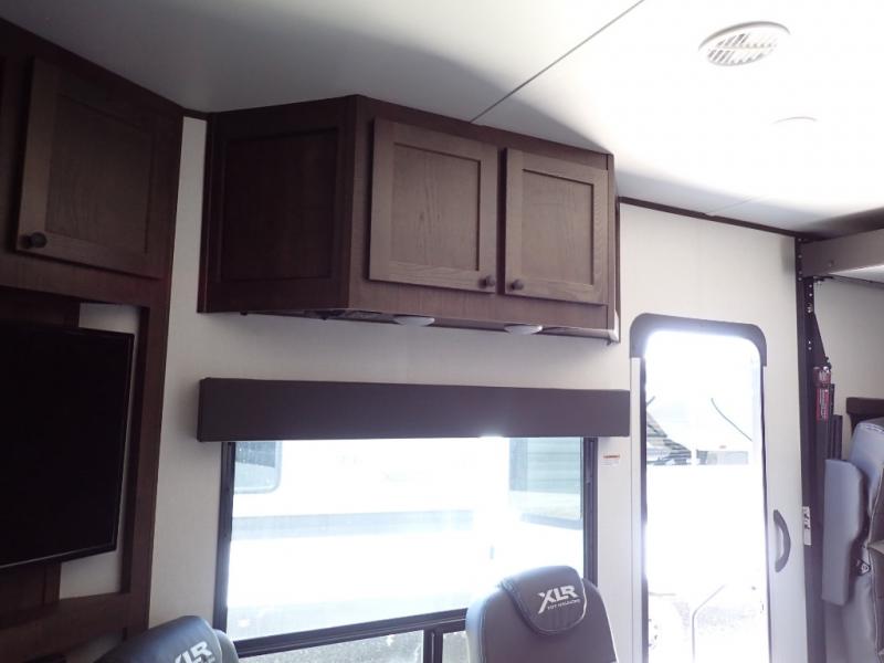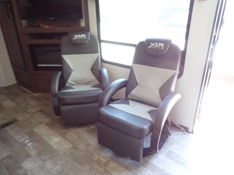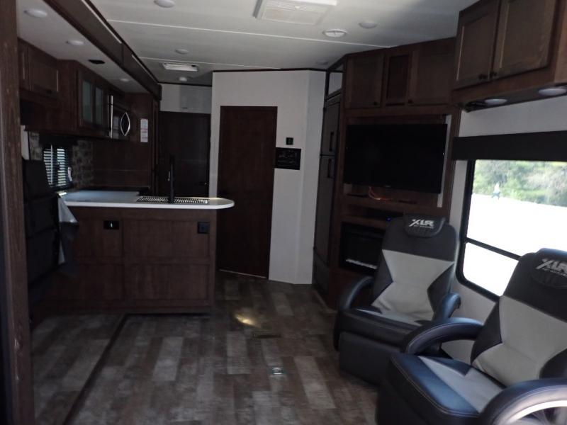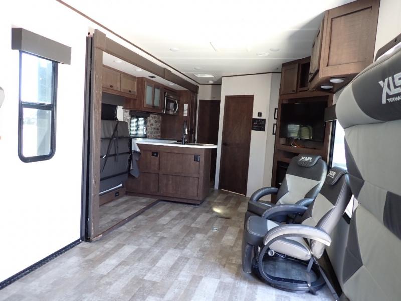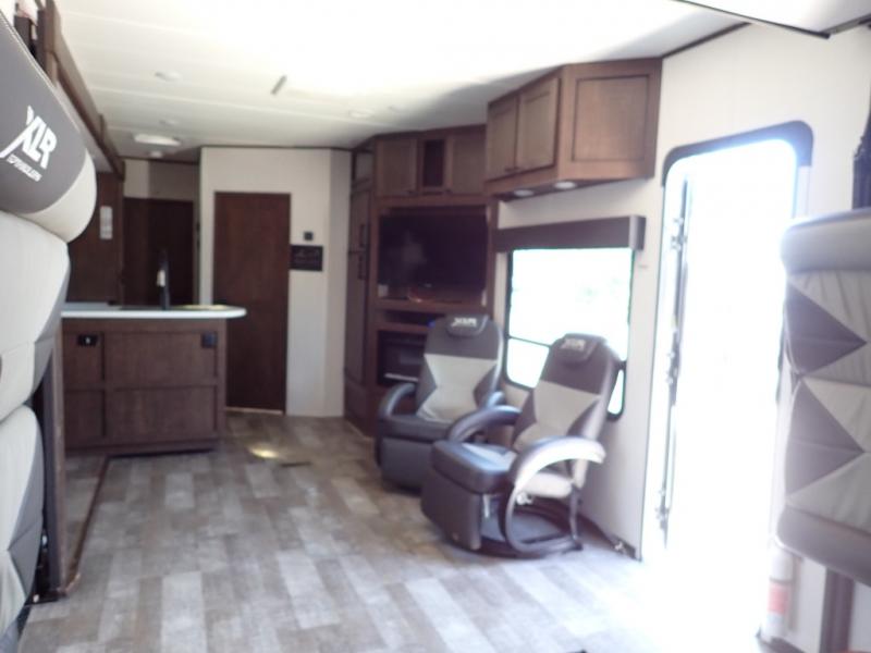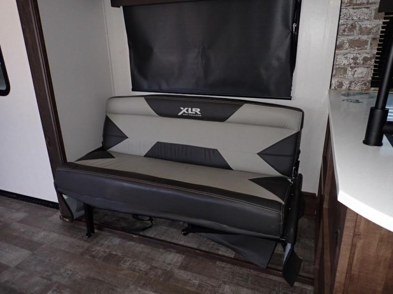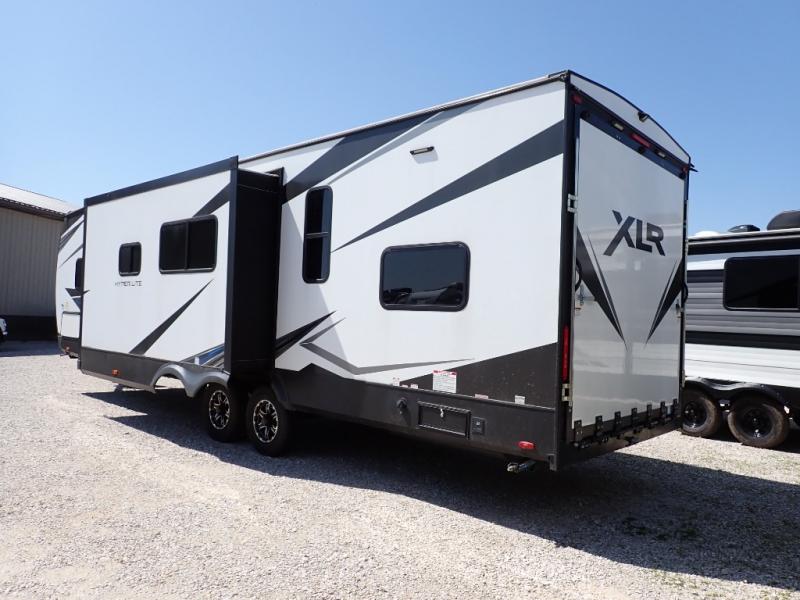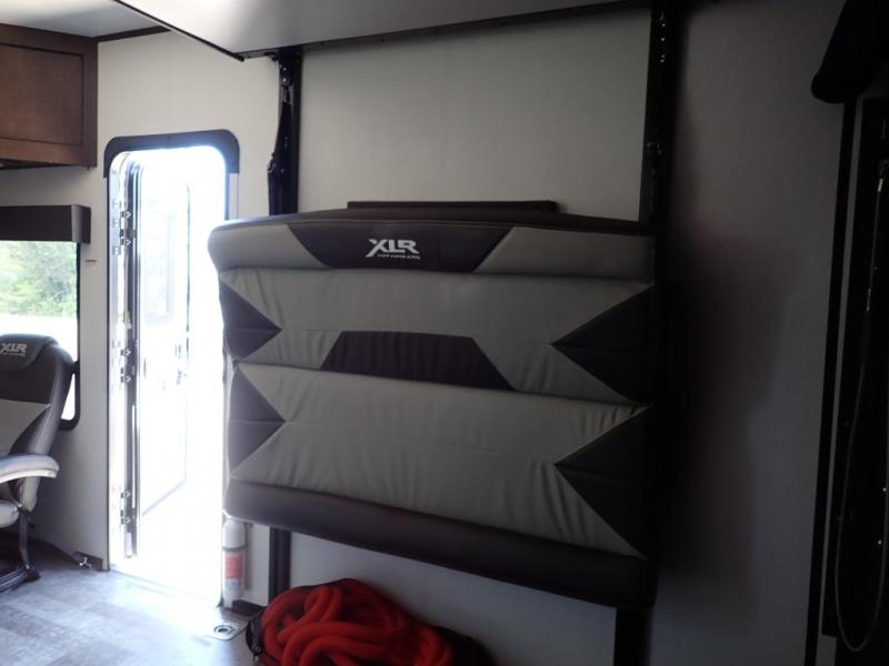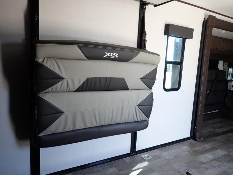 With the XLR Hyper Lite toy hauler travel trailer by Forest River, there is a wider interior with a 74" width even when the slides are retracted in so you can enjoy modern decor, at-home amenities and custom styling. The garages are spacious and include 5,000 lb. cargo tie downs that are anchored to steel plates, an insulated floor, a black rear privacy screen, a ramp patio cable kit for outdoor fun above ground, and Alumi-tread rear entry steps to mention a few highlights. More standout features include MORryde CRE3000 premium suspension that smooths out even the toughest of roads, heavy-duty Dexter axles offering the best in class carrying capacities, and the XLR fully enclosed "Body Armor" underbelly that is insulated and uses a panel system for ease of access. So when you want to play hard, choose an XLR Hyper Lite that offers upgraded features, quality construction, and allows you the control of venturing on or off road!