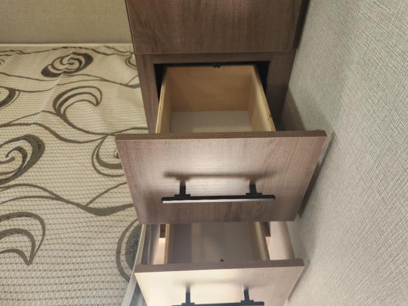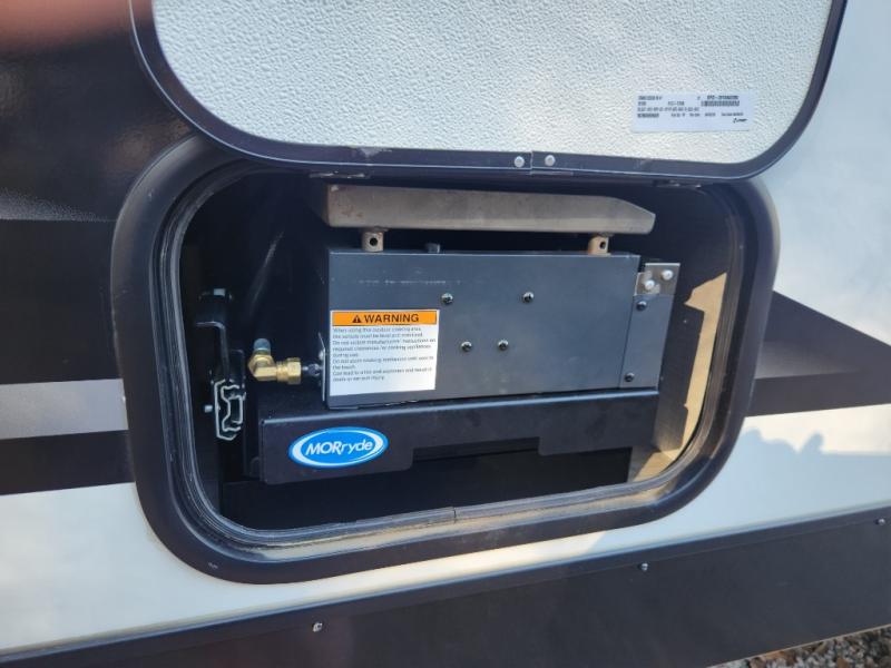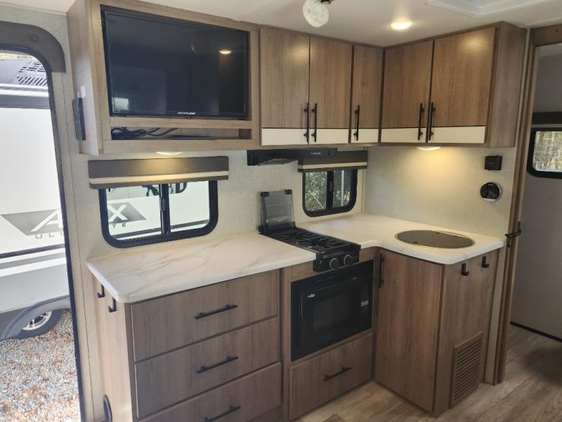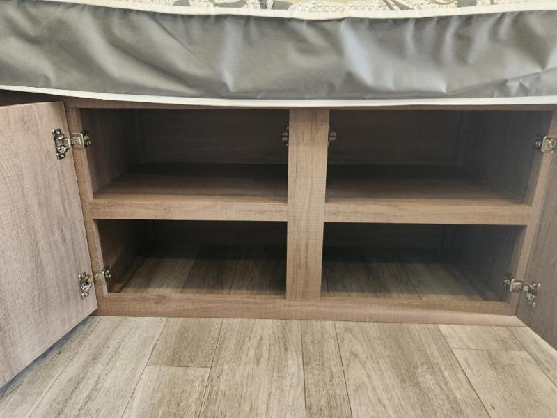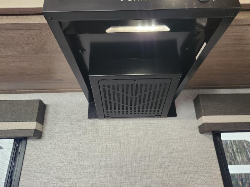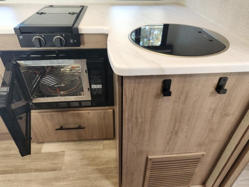 You’ll find convenient coat hooks near the entry for quick storage, and the kitchen area includes a two-burner cooktop, microwave, and refrigerator — everything you need to prepare meals indoors. Prefer cooking outside? The outside griddle is perfect for sizzling breakfast or grilling dinner under the stars.