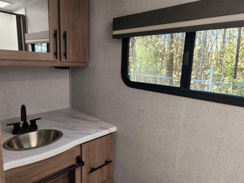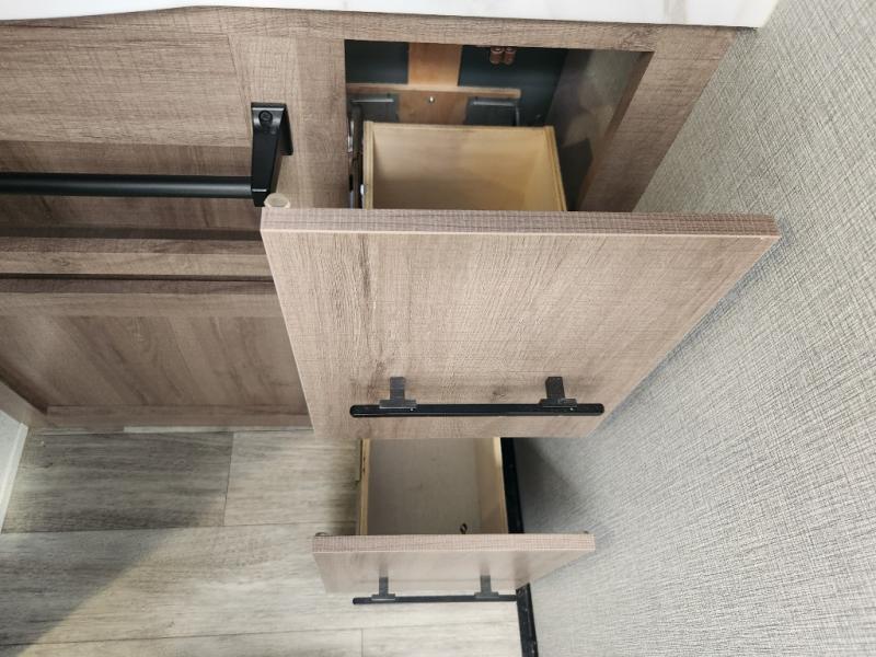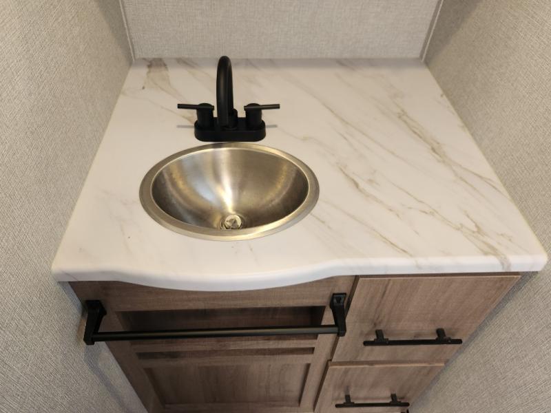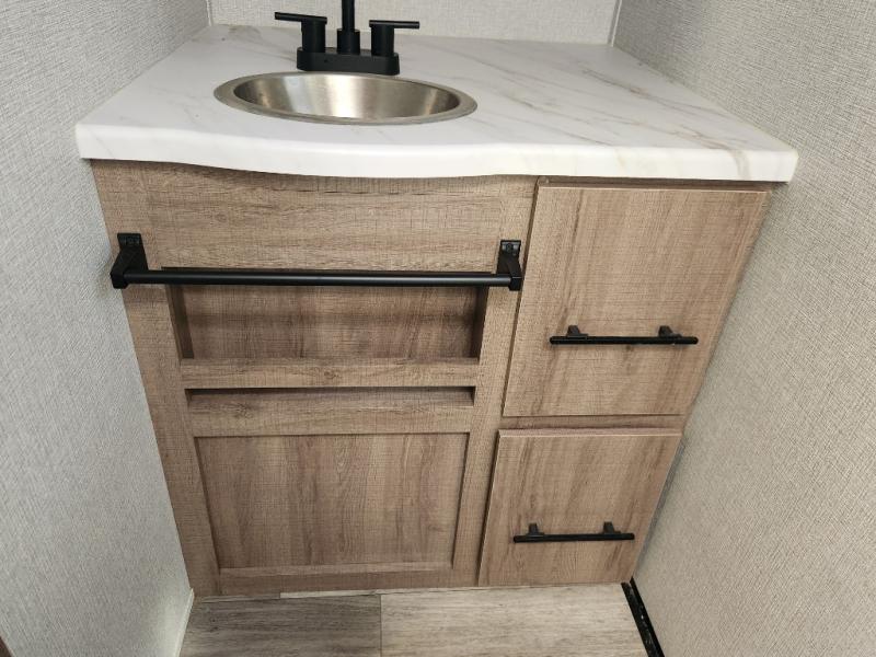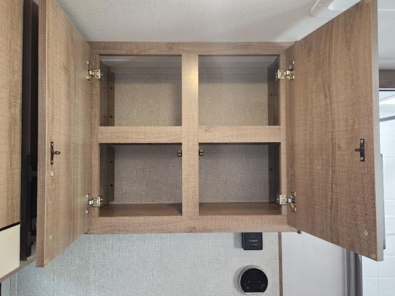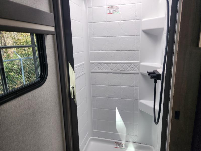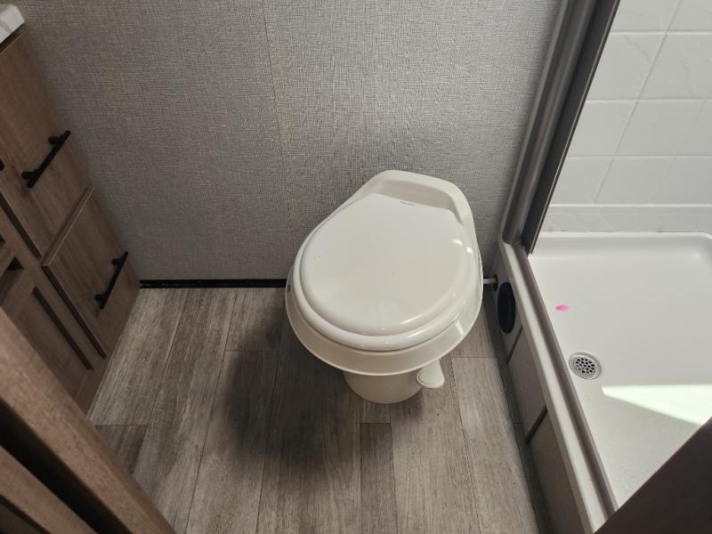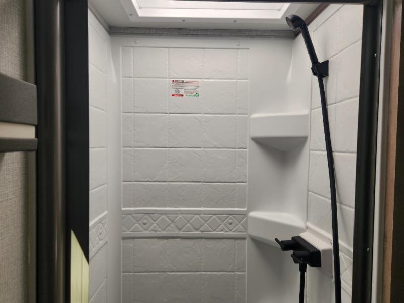 The full rear bathroom offers unexpected space and comfort, featuring a walk-in shower with skylight, toilet, sink, and overhead cabinets for your toiletries and towels. Plus, the pass-through storage keeps all your camping gear organized and easily accessible.