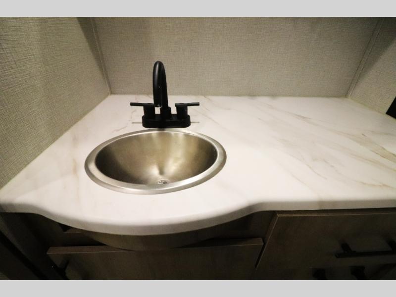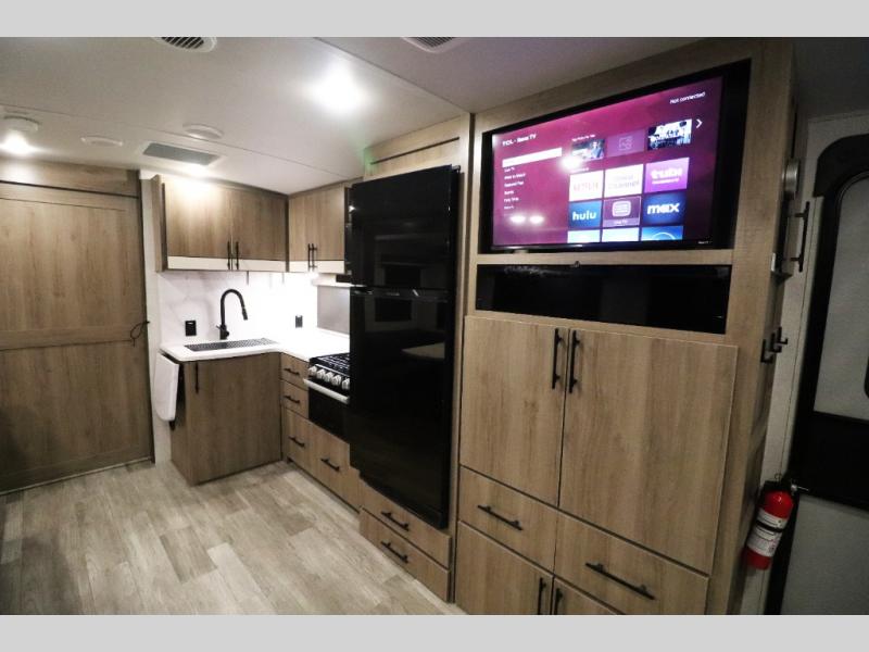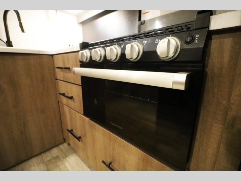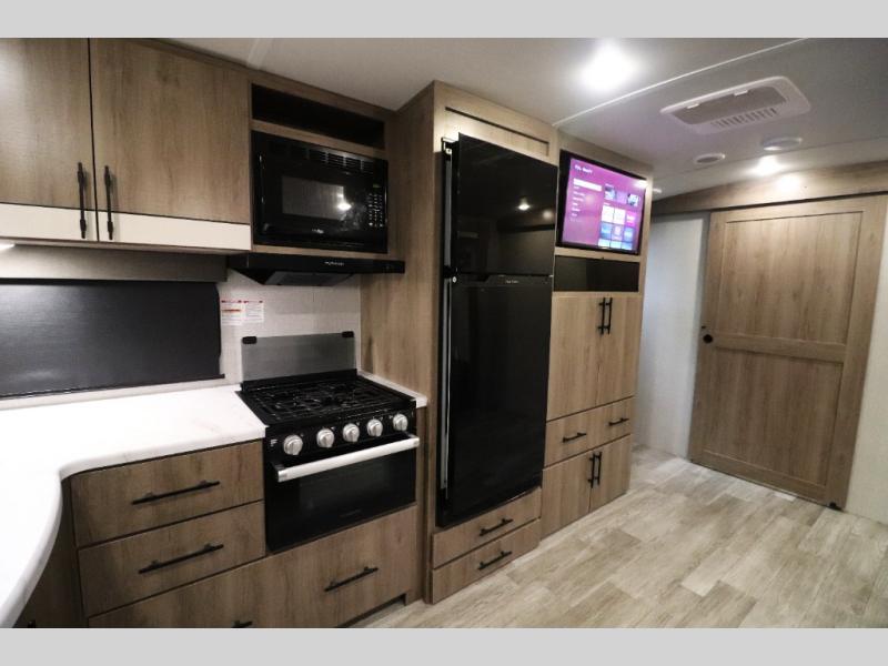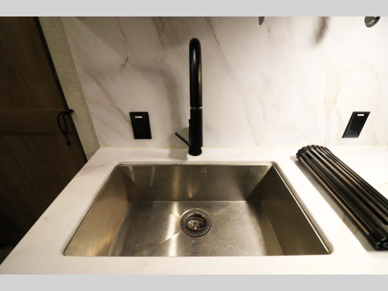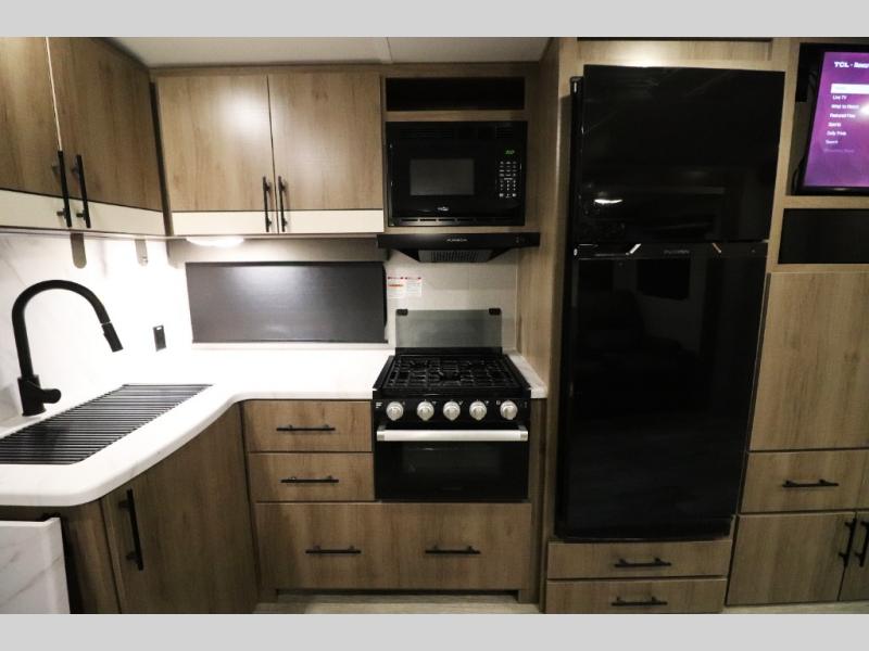 Modern Kitchen: Prepare meals with ease using the 3-burner range with oven, microwave, and a 12V 10 cu. ft. refrigerator, all complemented by residential countertops and a stainless steel sink.