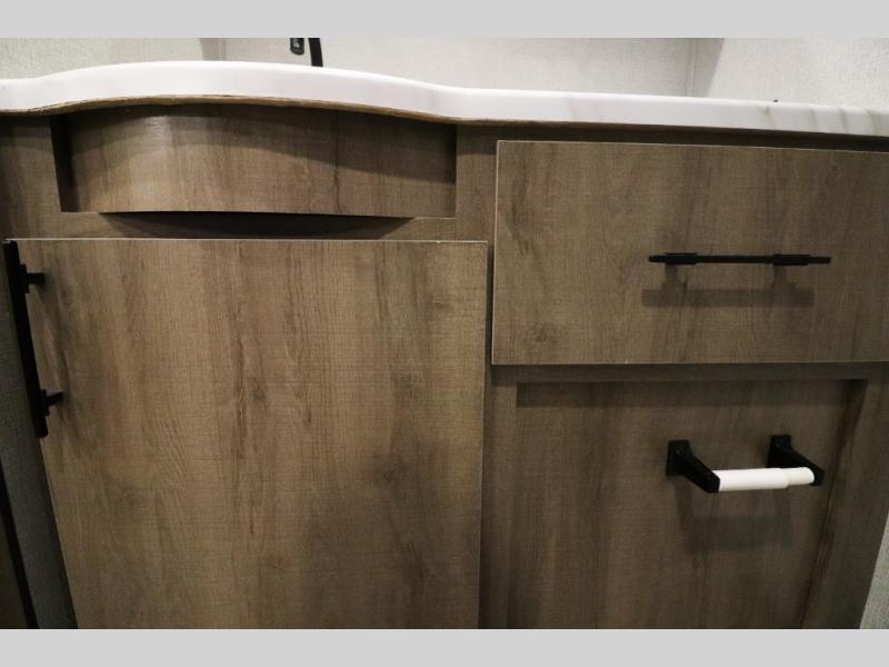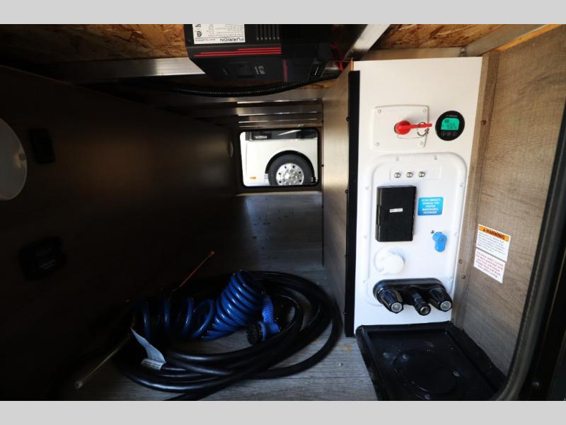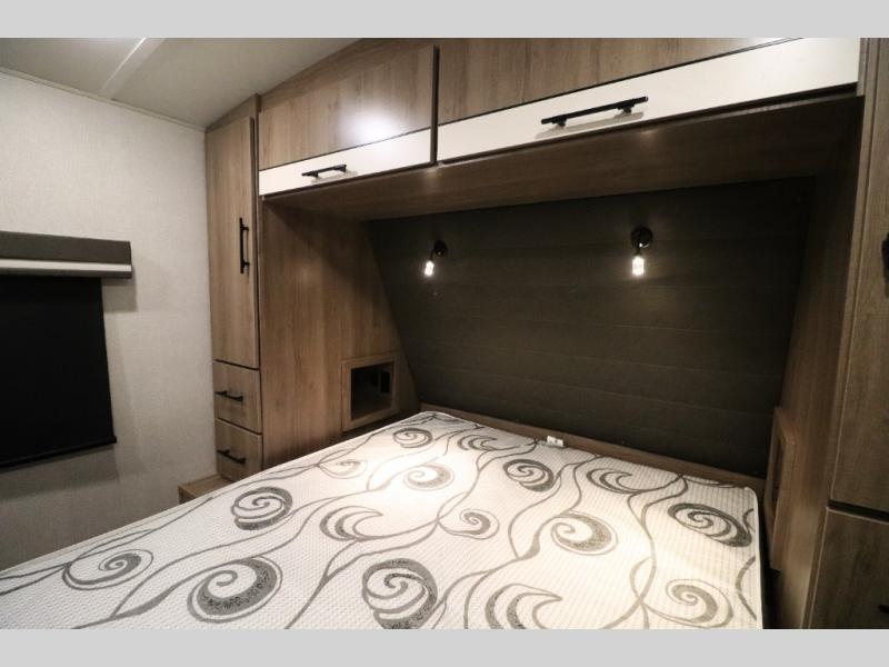 Master Suite: Relax in a private bedroom featuring a 60" x 80" queen bed, underbed storage with a sliding cargo tray, and built-in wardrobe cubby storage with USB-C charging stations and 110V outlets