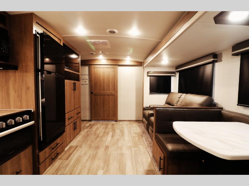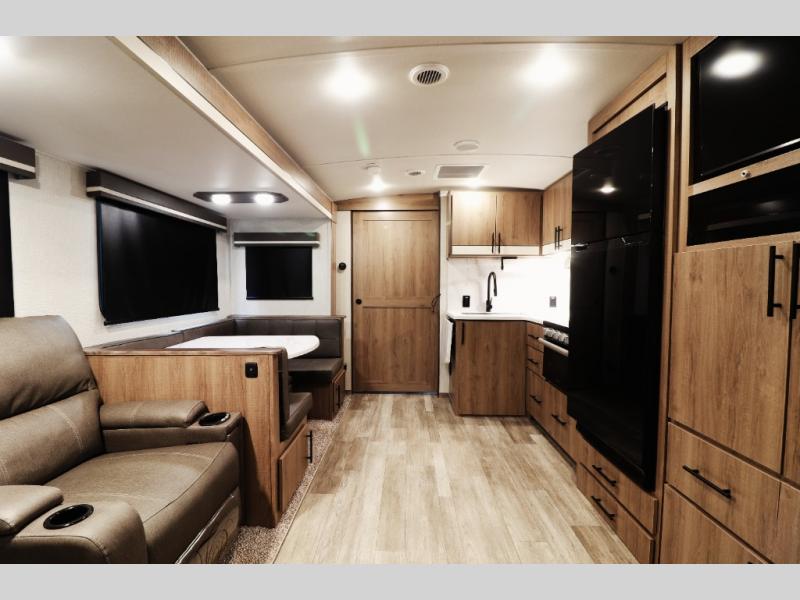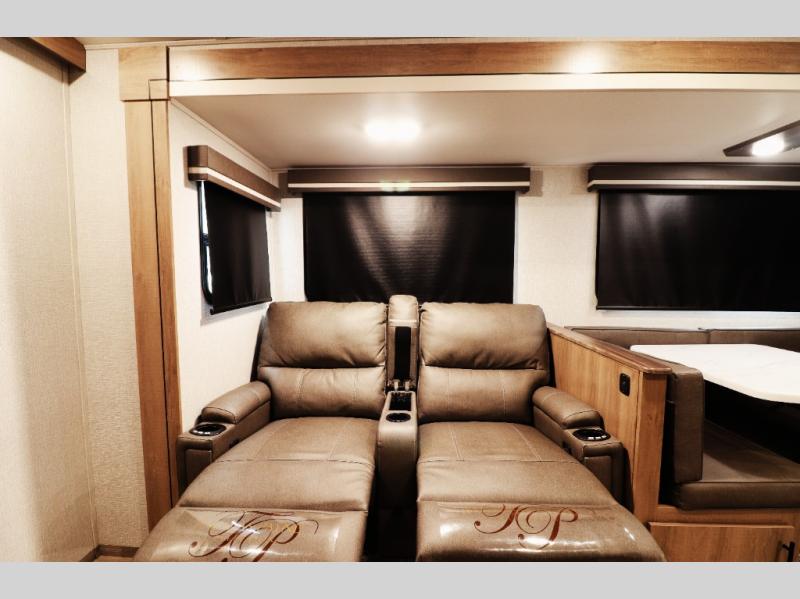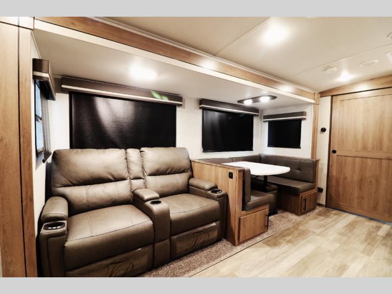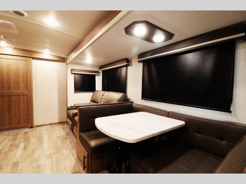A U-shaped dinette and tri-fold sofa (or optional theater seating) provide flexible lounging or bedding space.