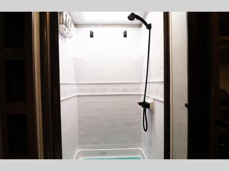 Rear full bathroom featuring a 30×36 walk-in shower with skylight, power vent fan, and a mirrored medicine cabinet.