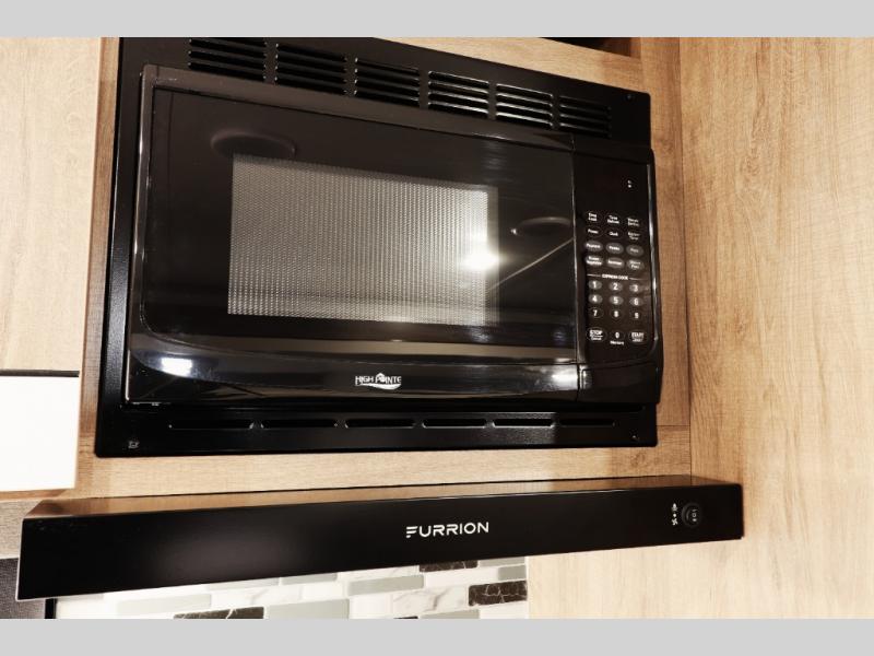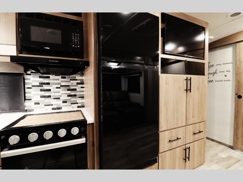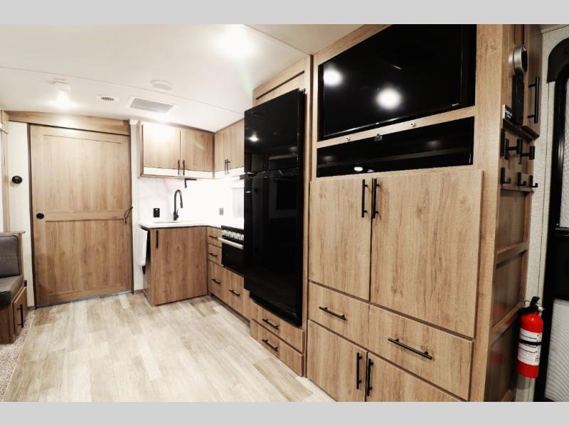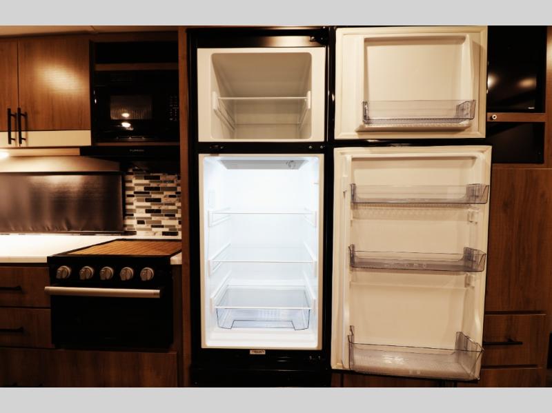 Home-style kitchen equipped with residential countertops, stainless-steel sink with cover, 3-burner range with oven, microwave, and 12V 10 cu ft refrigerator (solar-capable).