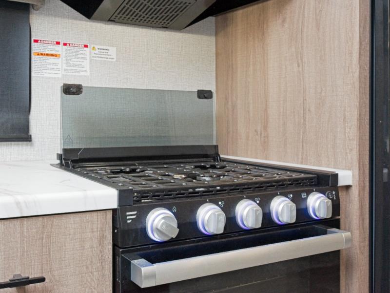 - Full kitchen with three-burner range, oven, microwave, and large sink