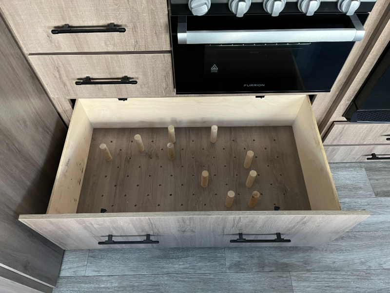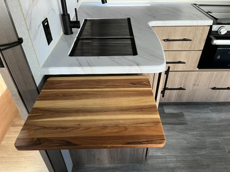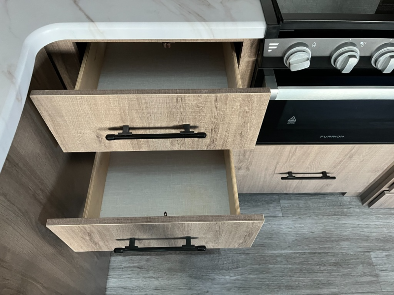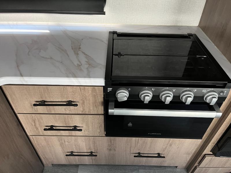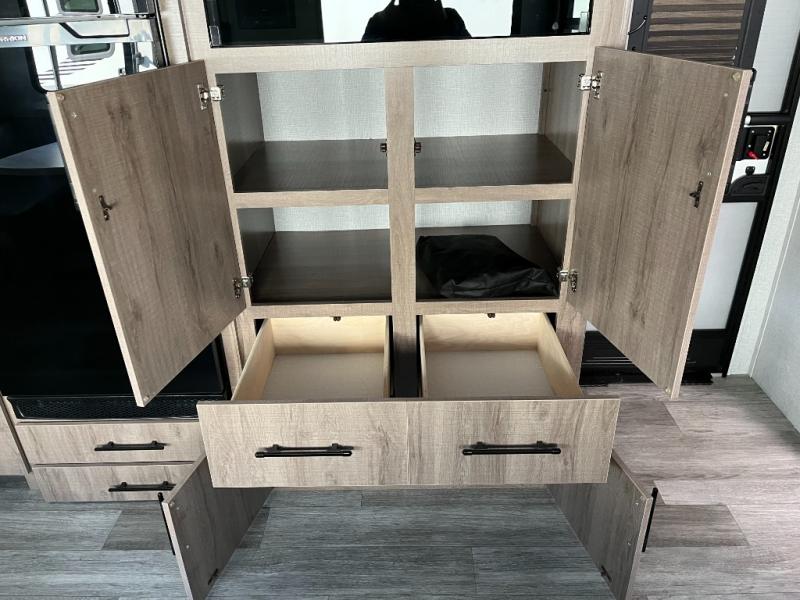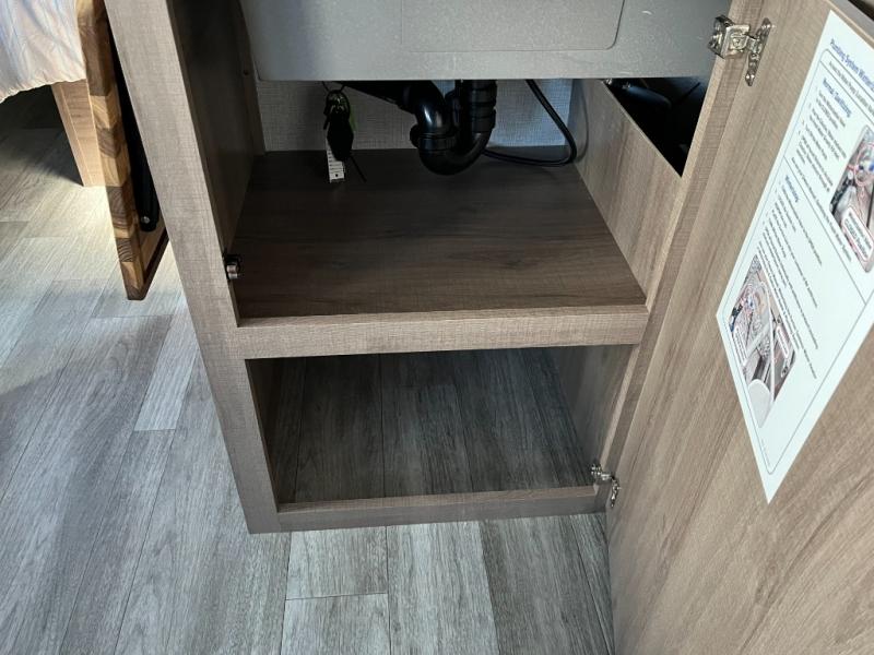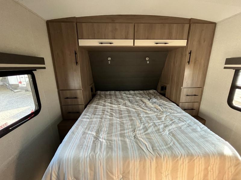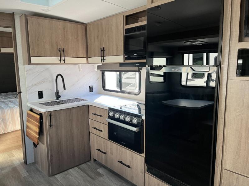 The kitchen in the 2600RB is designed with convenience and everyday use in mind. It features a cooktop with oven, microwave, spacious refrigerator, and plenty of counter space — all set up to handle anything from quick breakfasts to hearty dinners. With ample cabinets and pantry storage, you’ll have room for cookware, dishes, and pantry staples, helping keep your space neat and organized no matter how long you’re away.