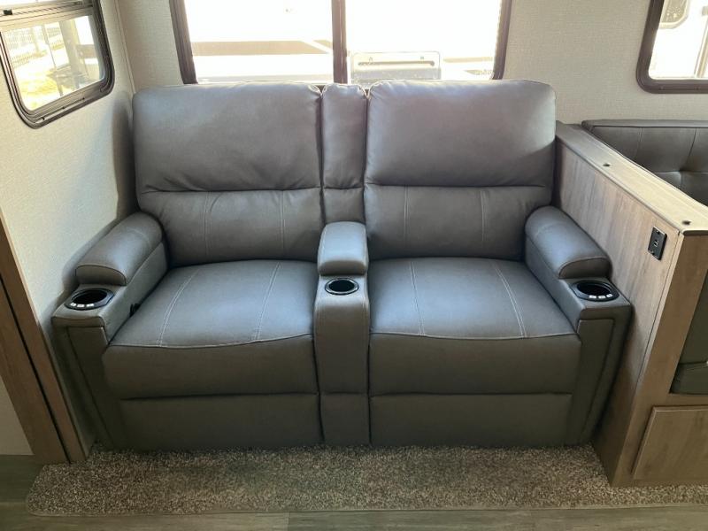 Step inside the Imagine 2600RB and enjoy an interior that feels both welcoming and spacious. Large panoramic windows fill the living area with natural light, creating a cheerful ambiance and connecting you to your surroundings. The comfortable sofa and booth dinette offer cozy spaces for meals, games, or relaxation, while the open floorplan makes it easy for everyone to stay engaged — even during rainy days or evenings in camp.