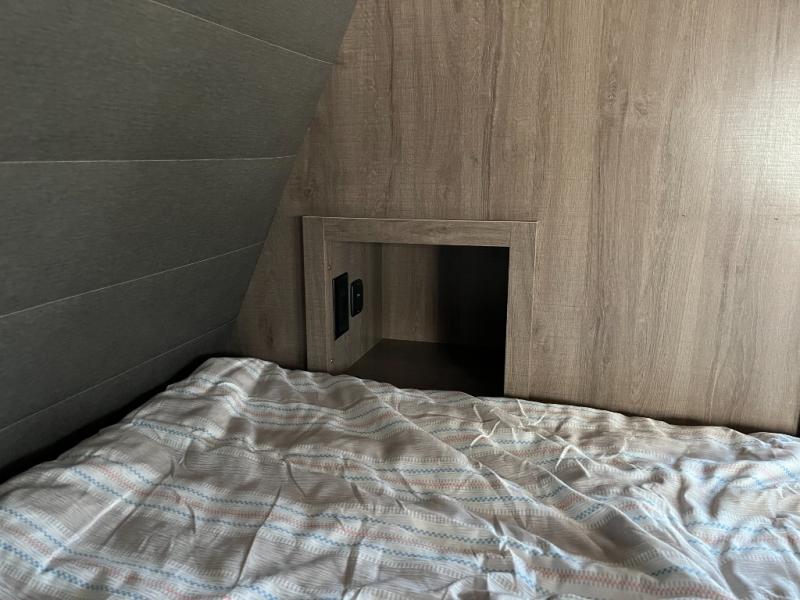 Comfortable bedroom with storage provides peaceful nights on the road.