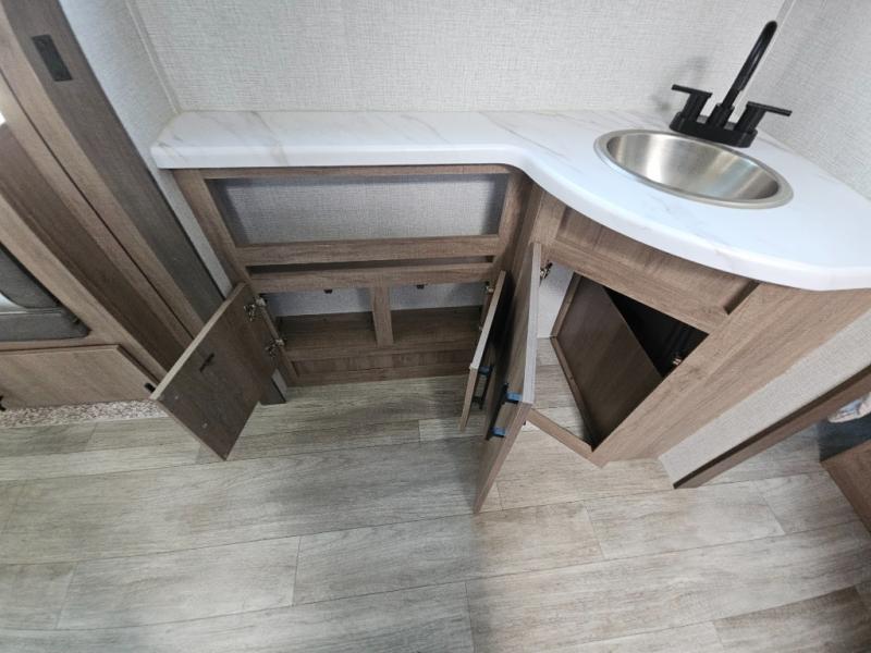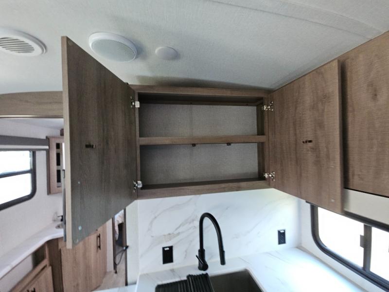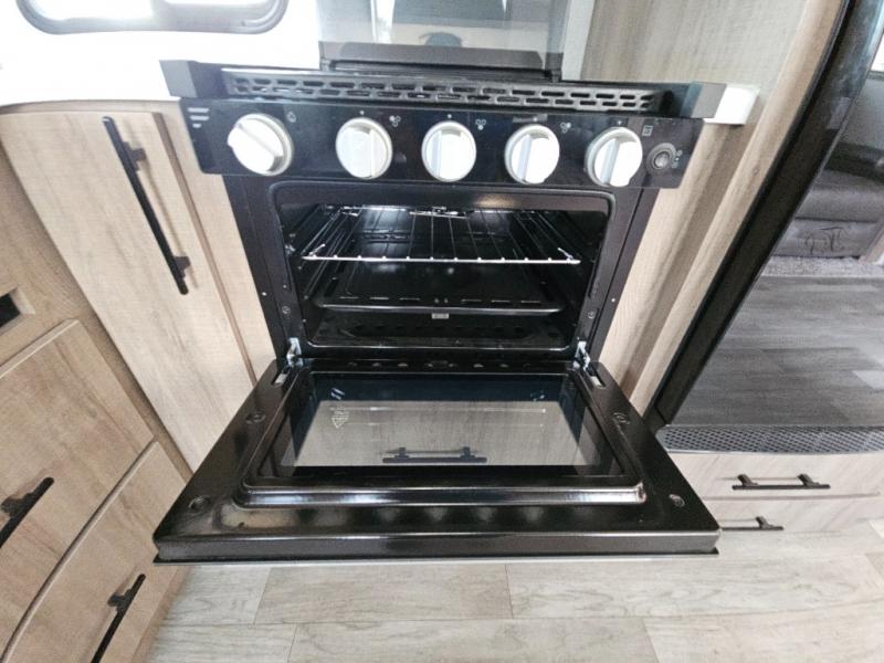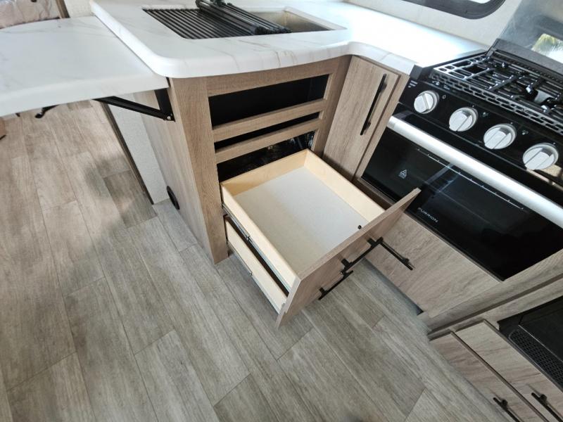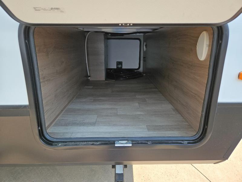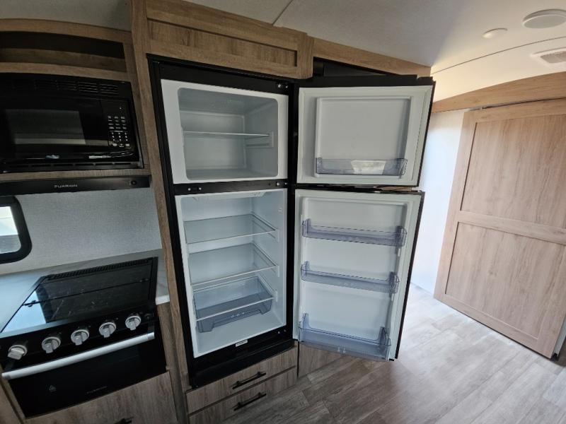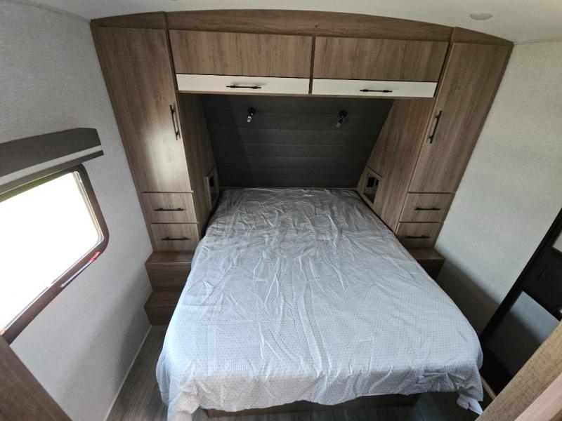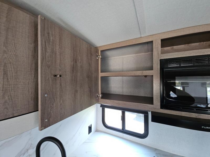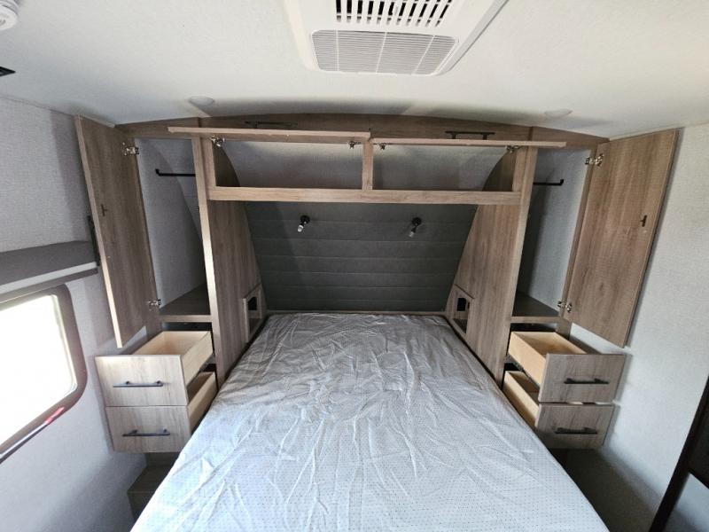 With this Imagine travel trailer, you won't have to imagine what a great camping trip will be like because you can live it! The kitchen includes everything you will need to prepare a meal for everyone, like a 10-cubic foot refrigerator, a three-burner range with oven, microwave, stainless steel sink, and flip-up countertop extension. There is a pet dish below the refrigerator, and the LED HDTV sits across from the tri-fold sofa and U-shaped dinette with removable ottoman so that you can watch a movie or the big game in comfort. Another great addition is the private bunkhouse because it provides you with a second secluded sleeping space. This bunkhouse includes a wardrobe, drawers, and an area prepped for a TV.