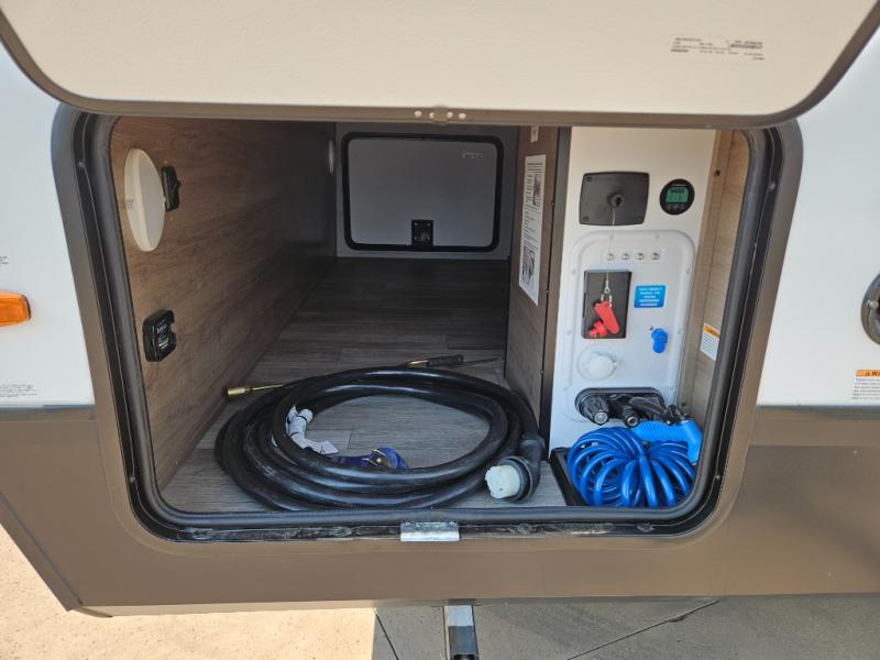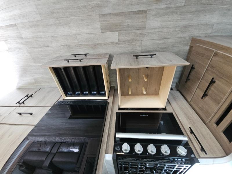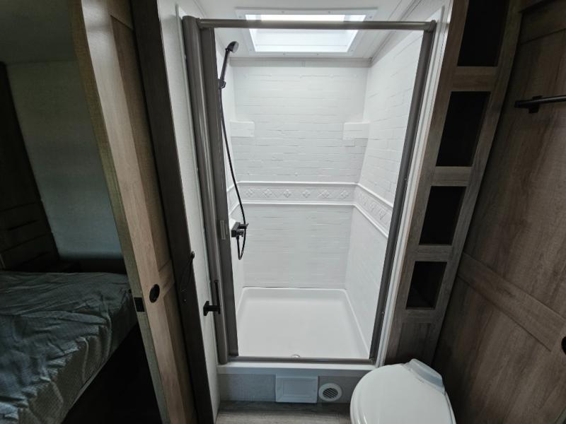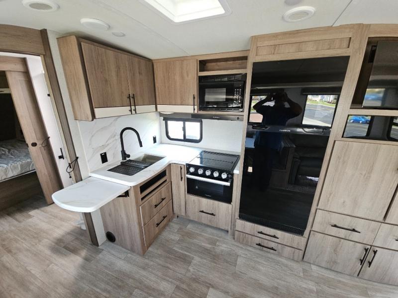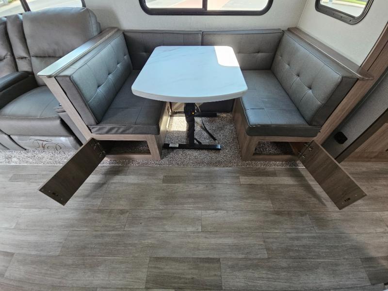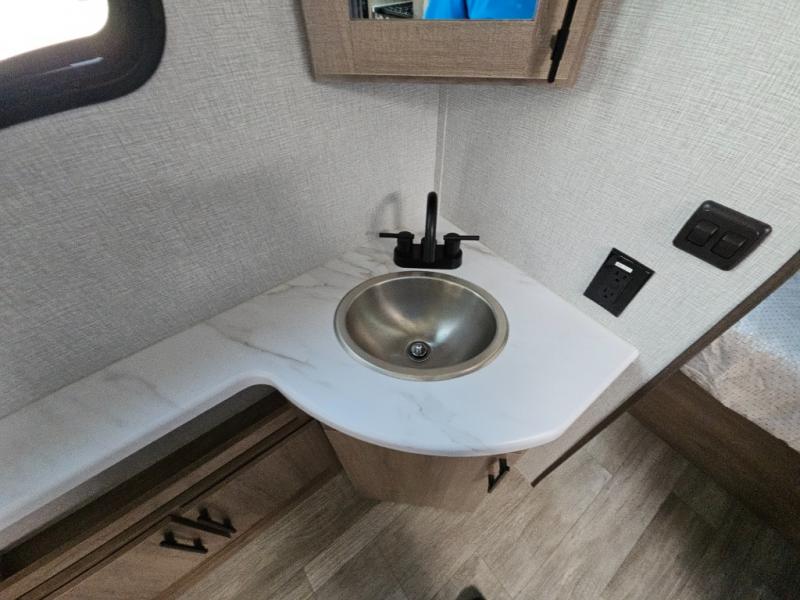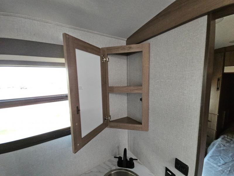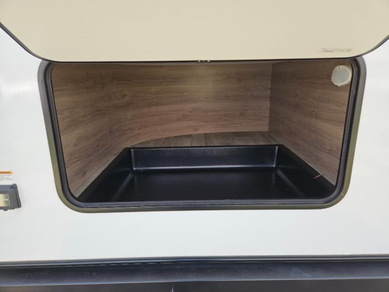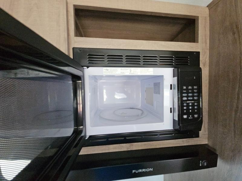 With this Imagine travel trailer, you won't have to imagine what a great camping trip will be like because you can live it! The kitchen includes everything you will need to prepare a meal for everyone, like a 10-cubic foot refrigerator, a three-burner range with oven, microwave, stainless steel sink, and flip-up countertop extension. There is a pet dish below the refrigerator, and the LED HDTV sits across from the tri-fold sofa and U-shaped dinette with removable ottoman so that you can watch a movie or the big game in comfort. Another great addition is the private bunkhouse because it provides you with a second secluded sleeping space. This bunkhouse includes a wardrobe, drawers, and an area prepped for a TV.