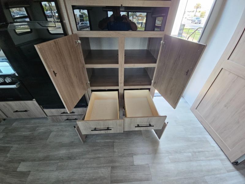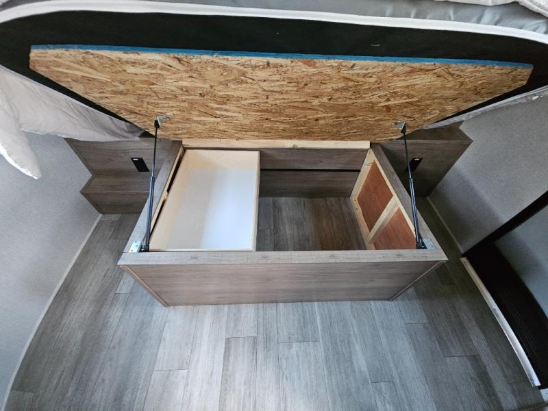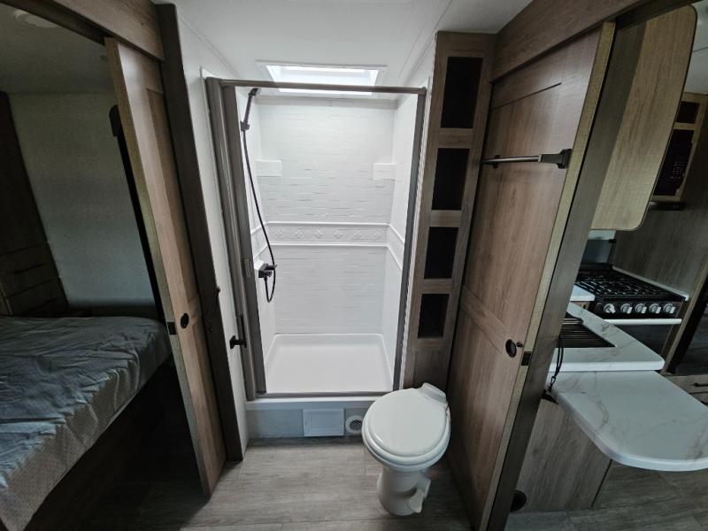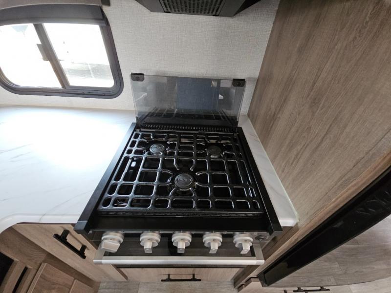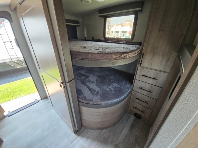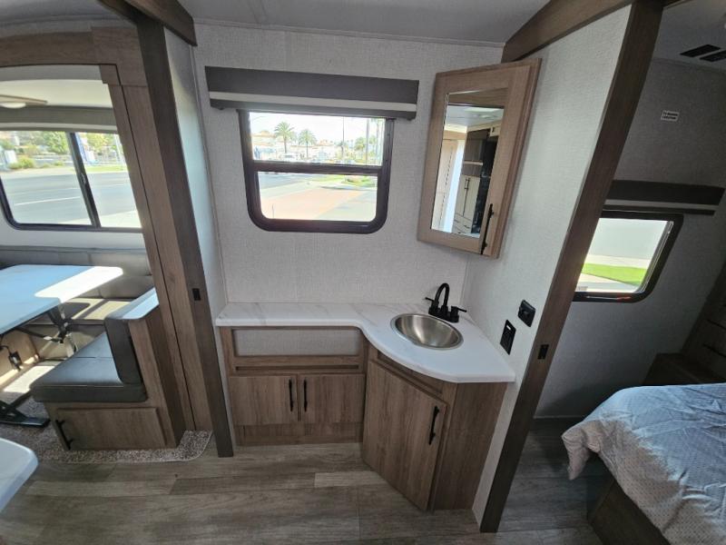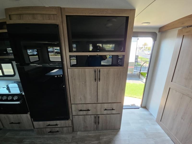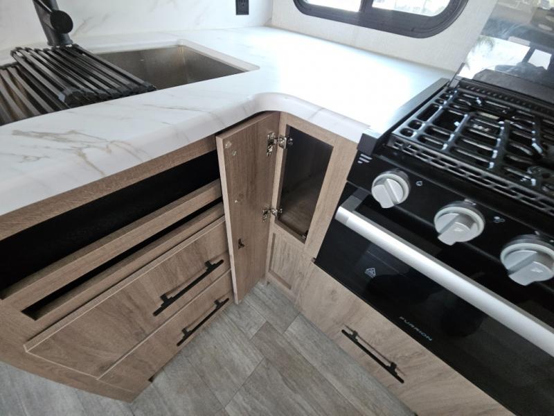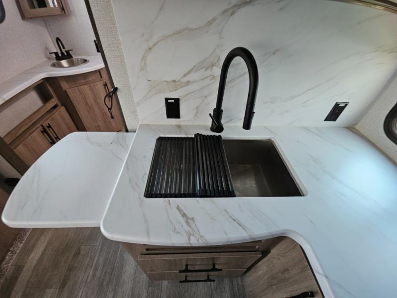 With this Imagine travel trailer, you won't have to imagine what a great camping trip will be like because you can live it! The kitchen includes everything you will need to prepare a meal for everyone, like a 10-cubic foot refrigerator, a three-burner range with oven, microwave, stainless steel sink, and flip-up countertop extension. There is a pet dish below the refrigerator, and the LED HDTV sits across from the tri-fold sofa and U-shaped dinette with removable ottoman so that you can watch a movie or the big game in comfort. Another great addition is the private bunkhouse because it provides you with a second secluded sleeping space. This bunkhouse includes a wardrobe, drawers, and an area prepped for a TV.