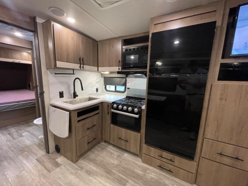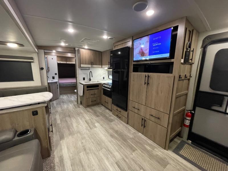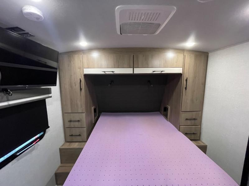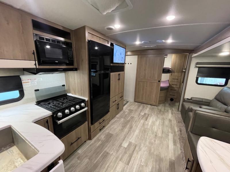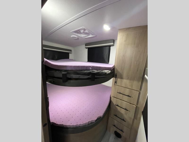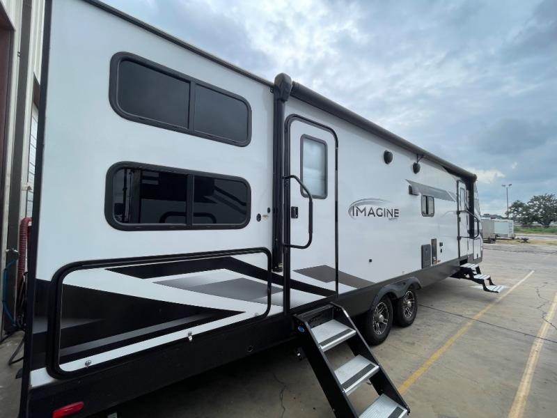 With this Imagine travel trailer, you won't have to imagine what a great camping trip will be like because you can live it! The kitchen includes everything you will need to prepare a meal for everyone, like a 10-cubic foot refrigerator, a three-burner range with oven, microwave, stainless steel sink, and flip-up countertop extension. There is a pet dish below the refrigerator, and the LED HDTV sits across from the tri-fold sofa and U-shaped dinette with removable ottoman so that you can watch a movie or the big game in comfort. Another great addition is the private bunkhouse because it provides you with a second secluded sleeping space. This bunkhouse includes a wardrobe, drawers, and an area prepped for a TV.