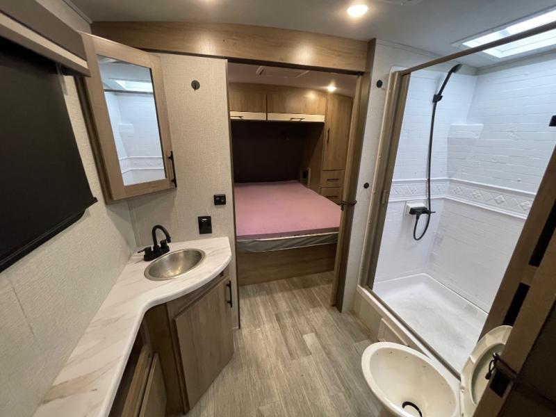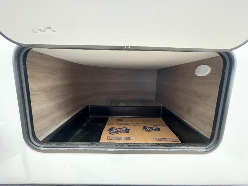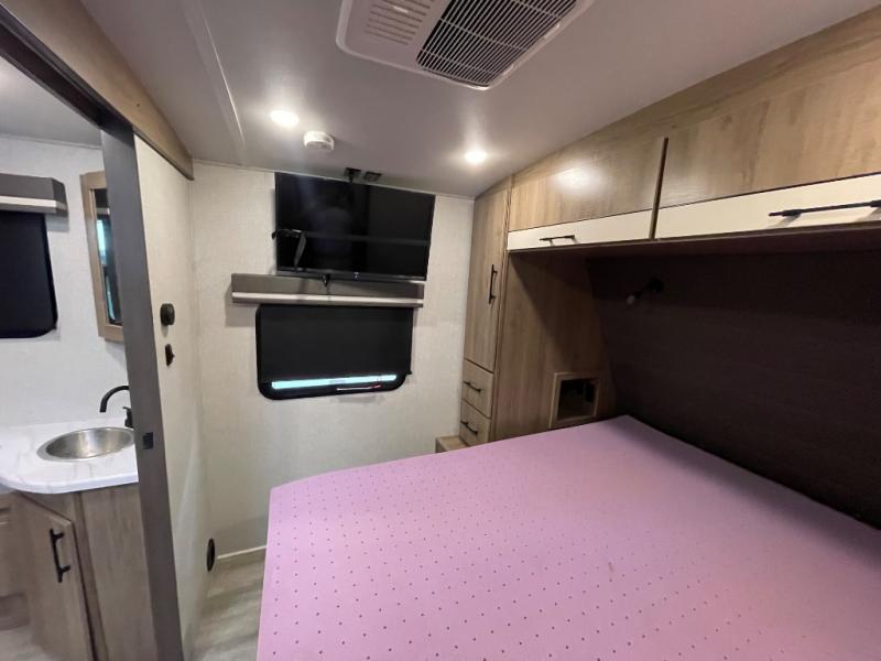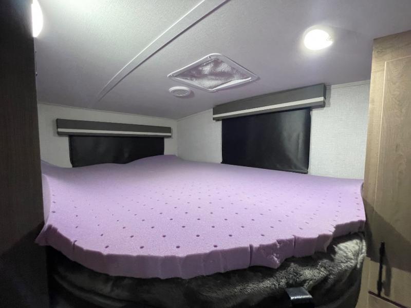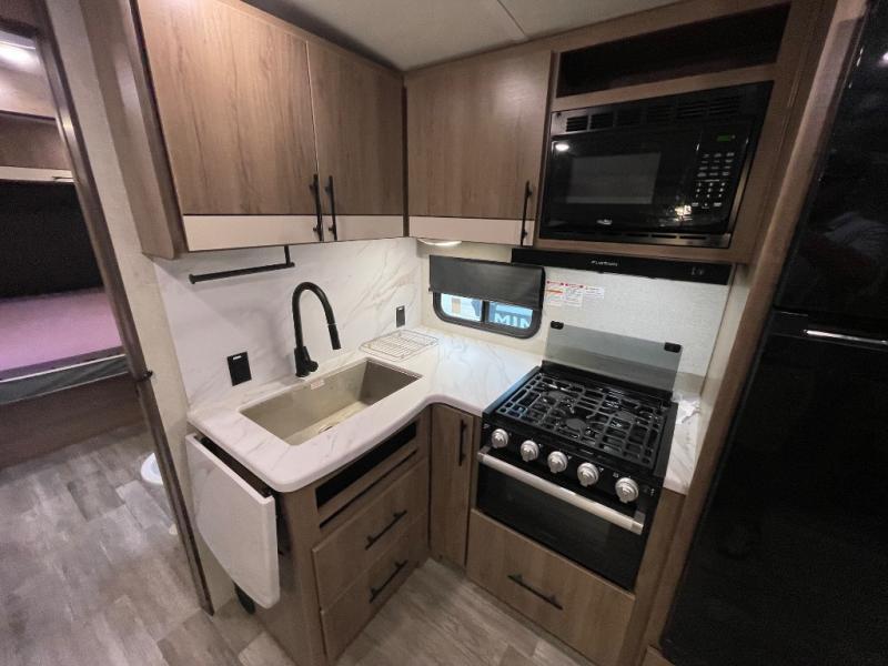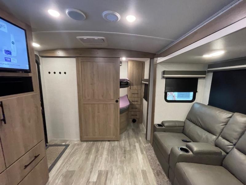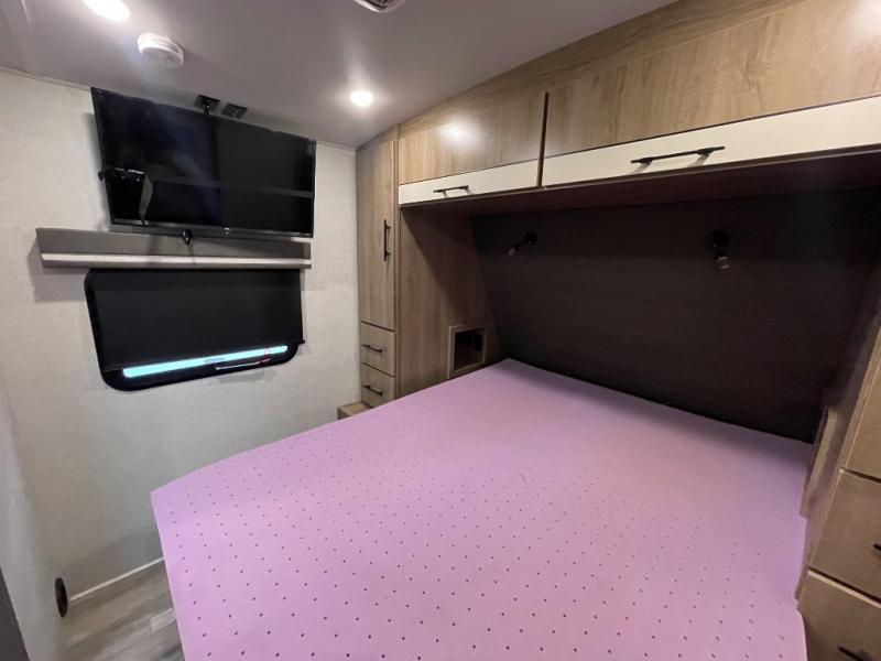 With this Imagine travel trailer, you won't have to imagine what a great camping trip will be like because you can live it! The kitchen includes everything you will need to prepare a meal for everyone, like a 10-cubic foot refrigerator, a three-burner range with oven, microwave, stainless steel sink, and flip-up countertop extension. There is a pet dish below the refrigerator, and the LED HDTV sits across from the tri-fold sofa and U-shaped dinette with removable ottoman so that you can watch a movie or the big game in comfort. Another great addition is the private bunkhouse because it provides you with a second secluded sleeping space. This bunkhouse includes a wardrobe, drawers, and an area prepped for a TV.