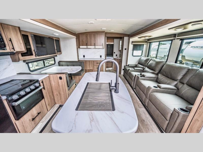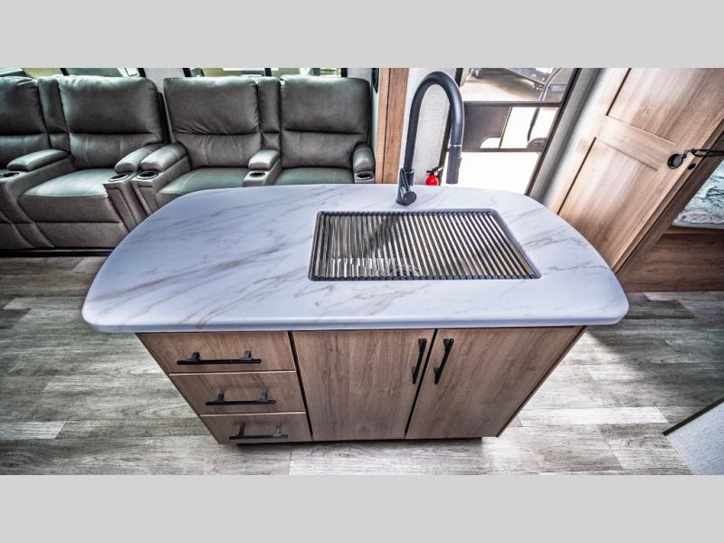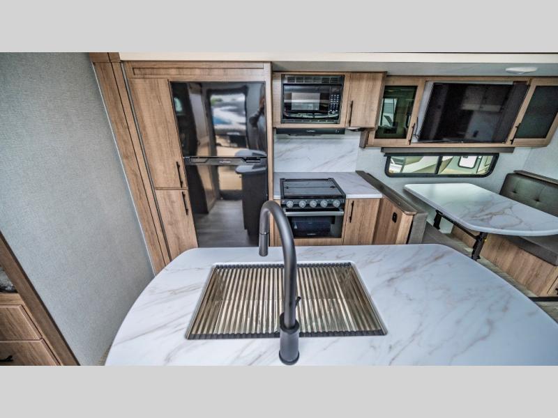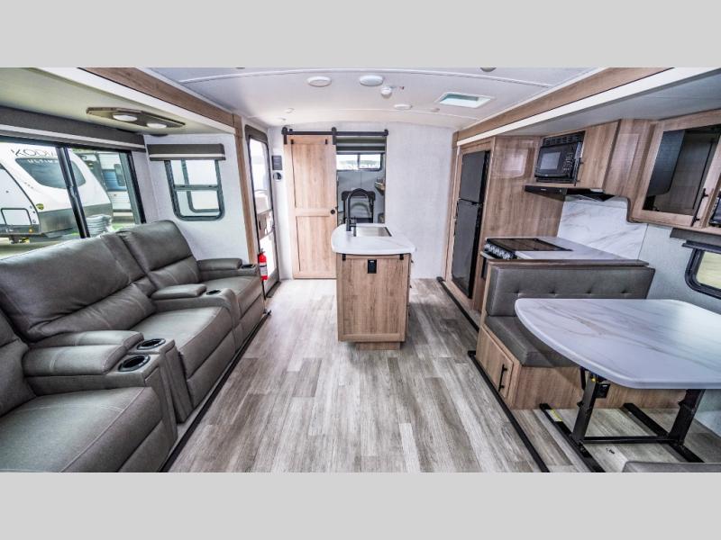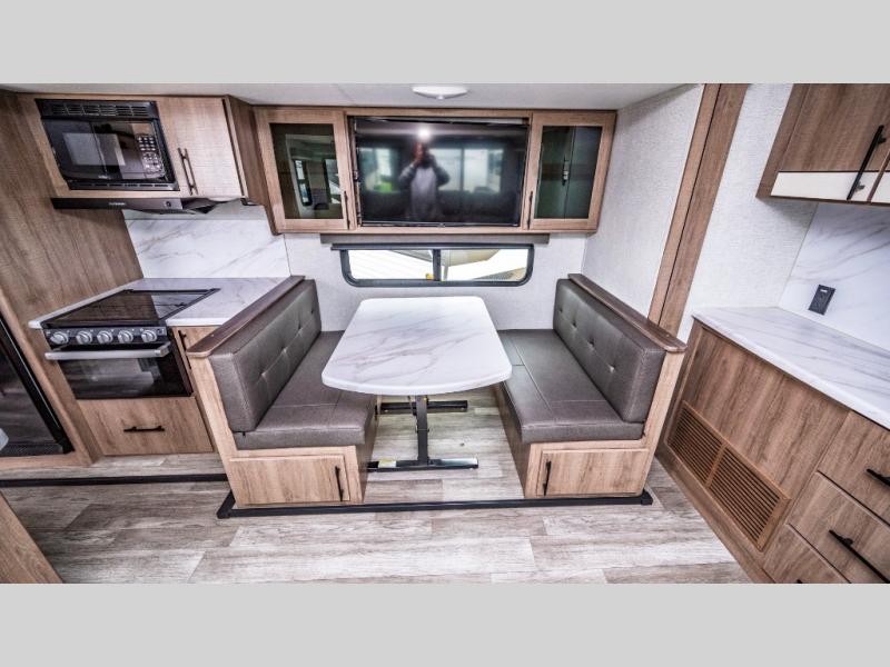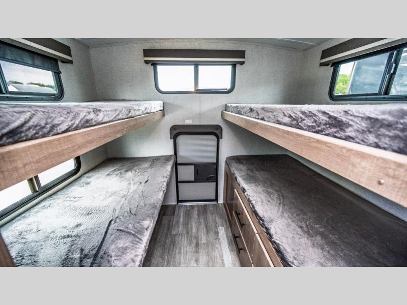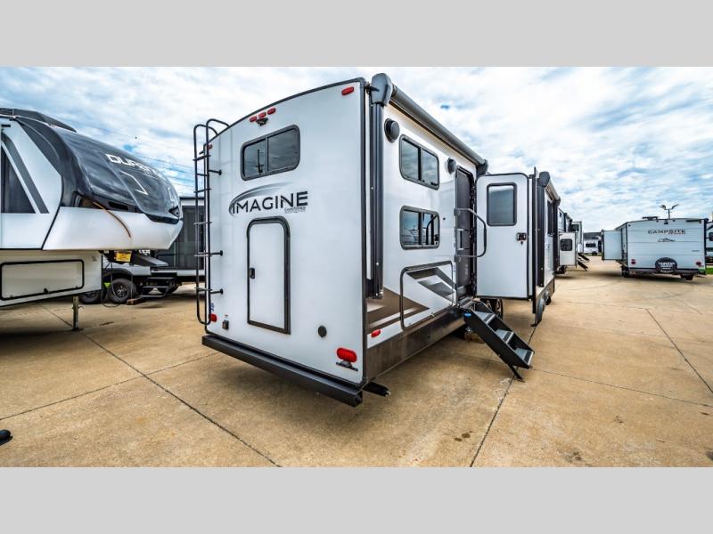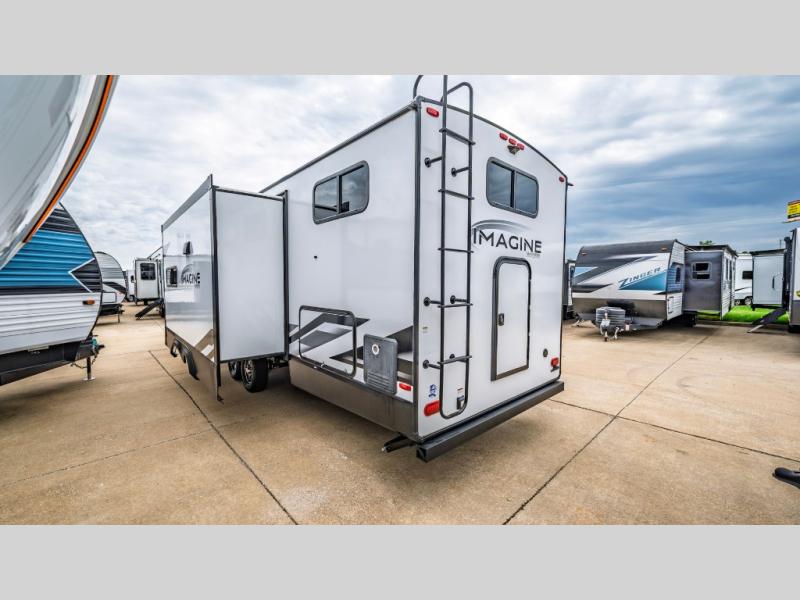 A great travel trailer for larger families or those that enjoy traveling with a few friends! This Imagine quad bunk model features two private bedrooms, with the master up front including a private entry/exit door just beyond a spacious walk-through bathroom that features a 30" x 36" shower with skylight to bring in more natural lighting each day, plus a toilet, sink and linen storage. In the kitchen, a nice island for food prep and cleaning up makes it easy to be part of the conversation in the room while you get meals ready for everyone. Speaking of food prep, how about the outside griddle and 1.6 cu. ft. refrigerator which is perfect for cooking outside, or for making late night snacks when all are enjoying the evening under the stars or in lawn chairs under one of two 9' 6" awnings with LED lighting. Your kids can bring along extra guests with the added sleeping that a quad bunk model provides. And, there is plenty of storage in the private bunkroom with drawers beneath for their things, plus a rear baggage door that is 42" x 22" for even more storage space for extra toys and gear.
