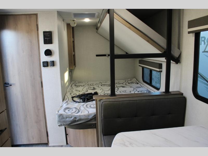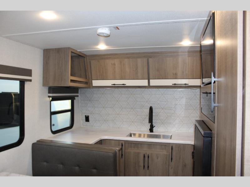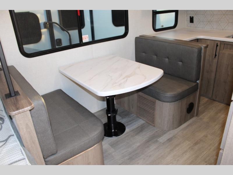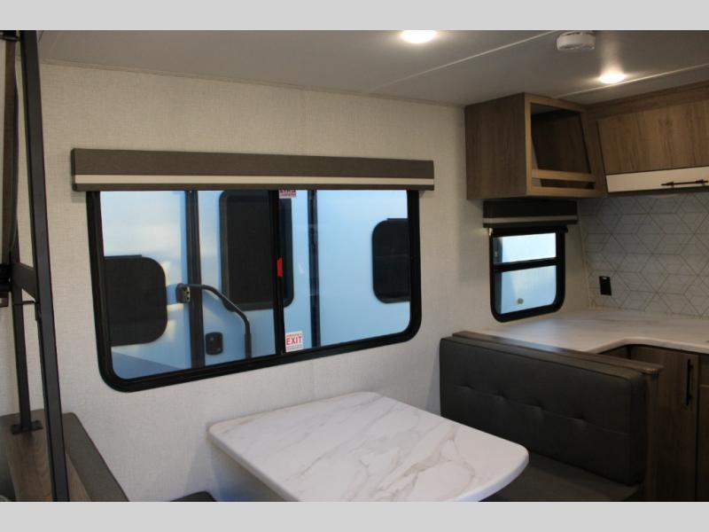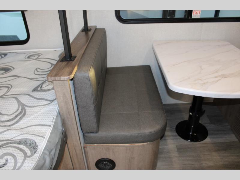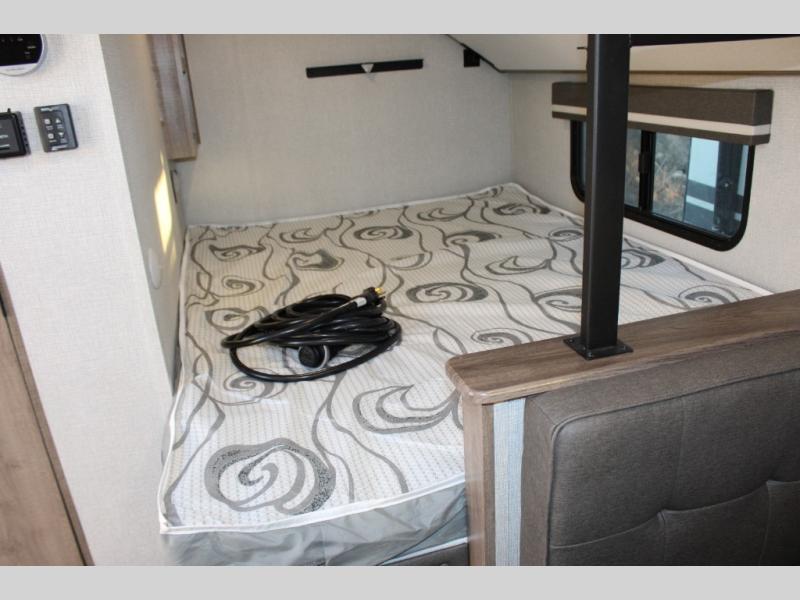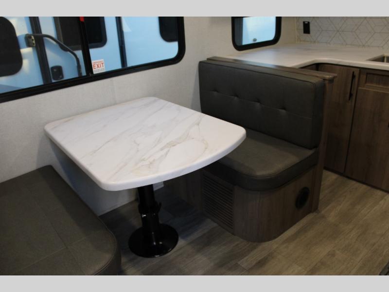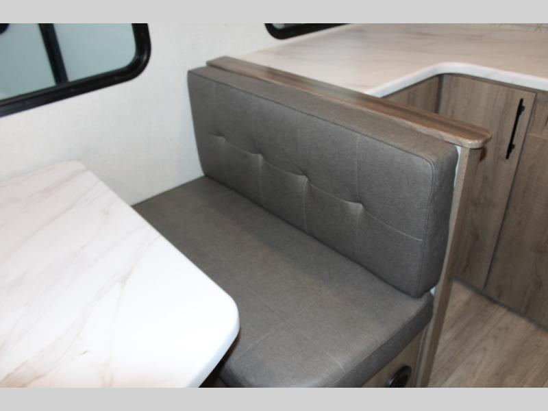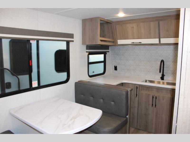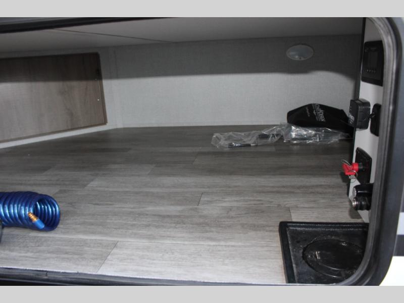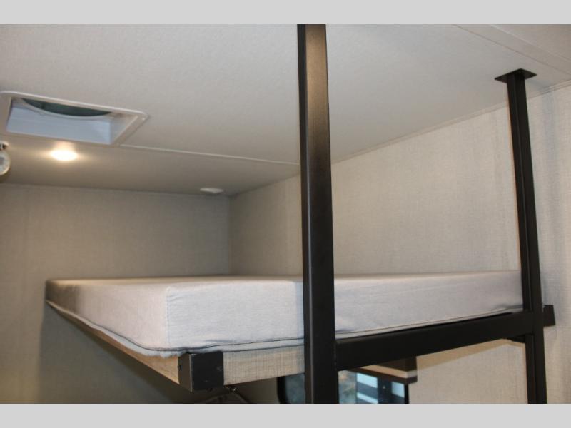 Your small family will have a fun time camping in this travel trailer! There is a queen bed below a 40" x 80" flip top bunk above it for comfortable sleeping spaces. You could even transform the booth dinette into an extra sleeping space when you aren't using it to enjoy a meal prepared with the front kitchen. You could even grill up some burgers on the outside griddle. Underneath the queen bed is a storage portal and the exterior has baggage doors to keep all of your gear out of the way!