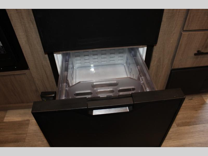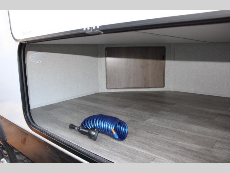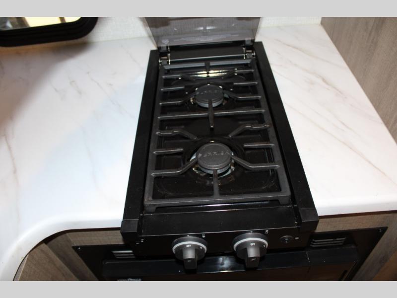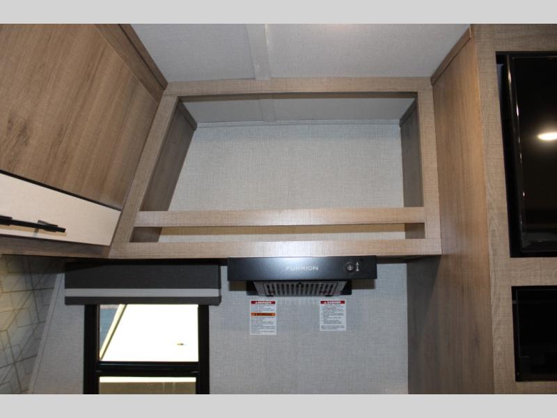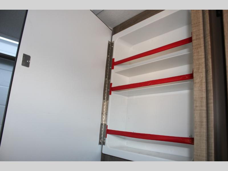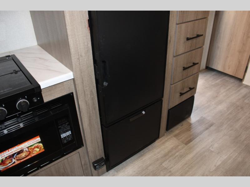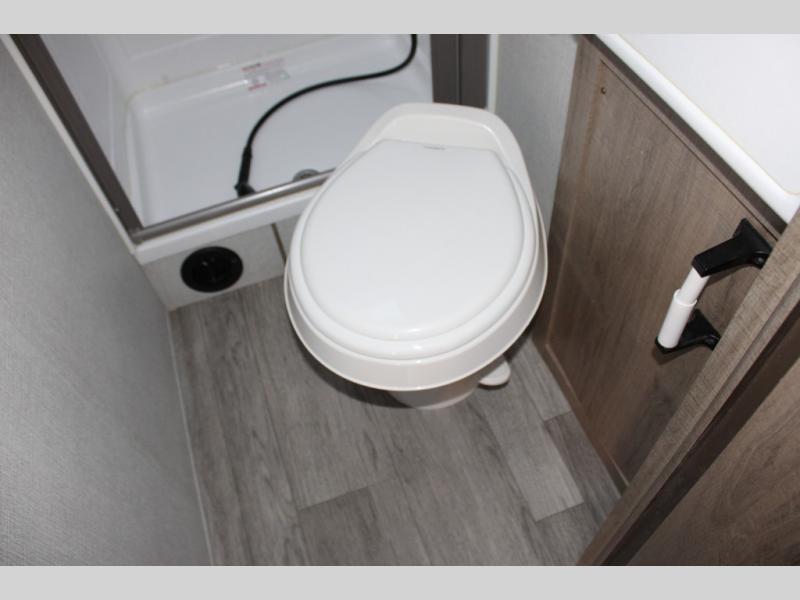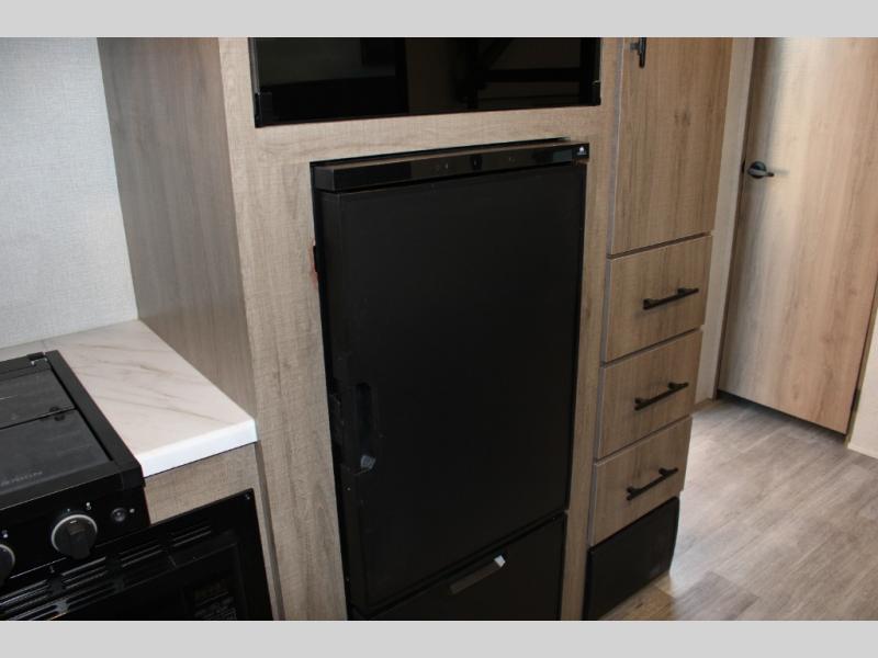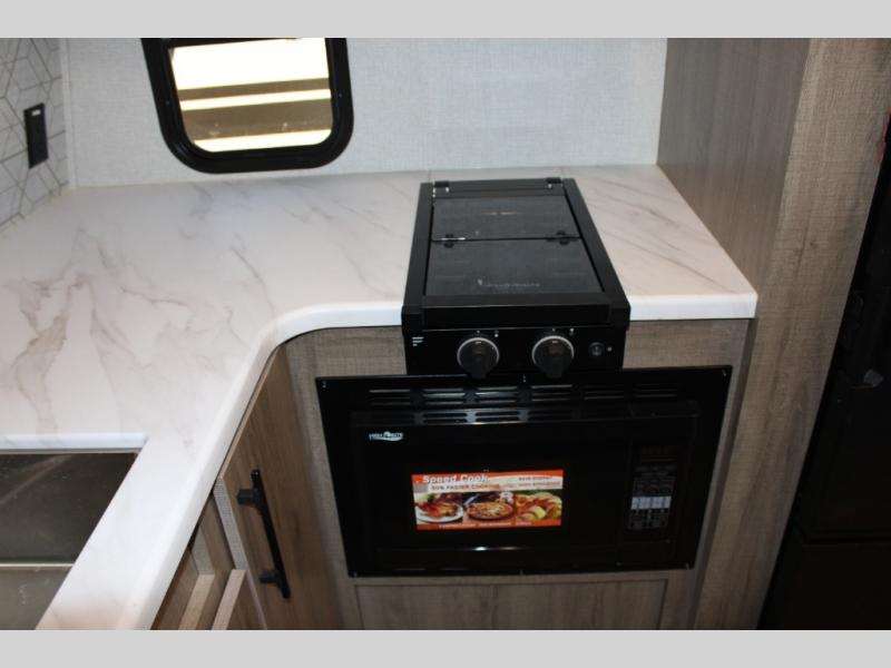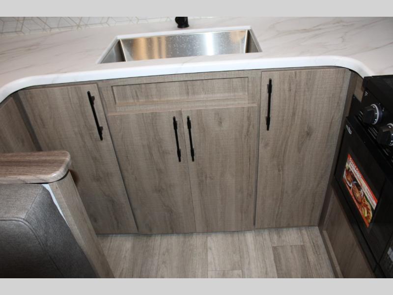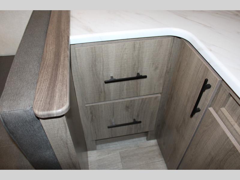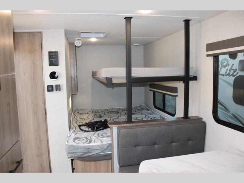 Your small family will have a fun time camping in this travel trailer! There is a queen bed below a 40" x 80" flip top bunk above it for comfortable sleeping spaces. You could even transform the booth dinette into an extra sleeping space when you aren't using it to enjoy a meal prepared with the front kitchen. You could even grill up some burgers on the outside griddle. Underneath the queen bed is a storage portal and the exterior has baggage doors to keep all of your gear out of the way!