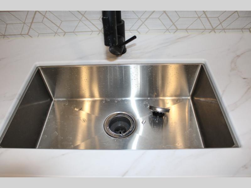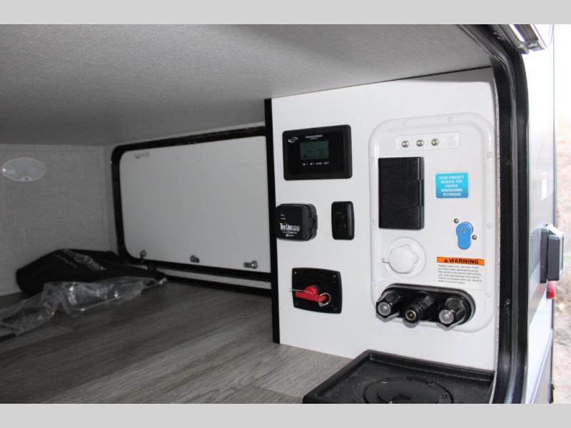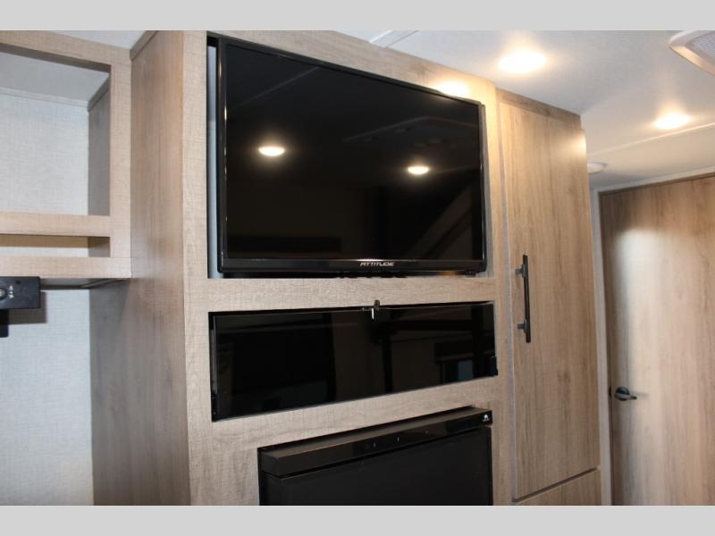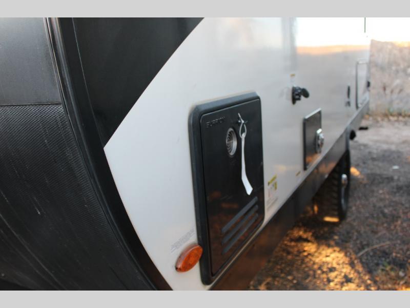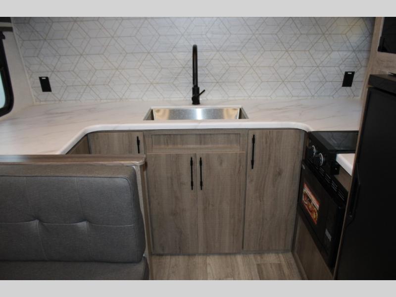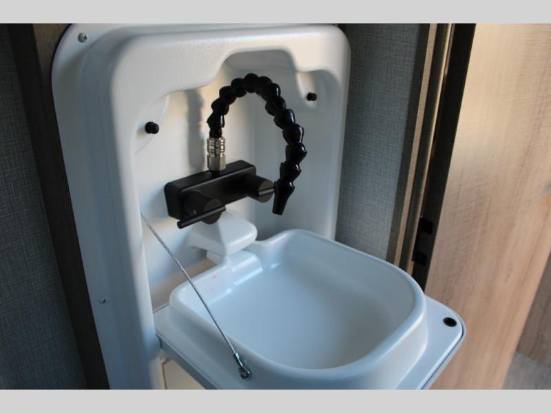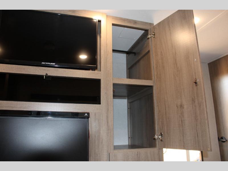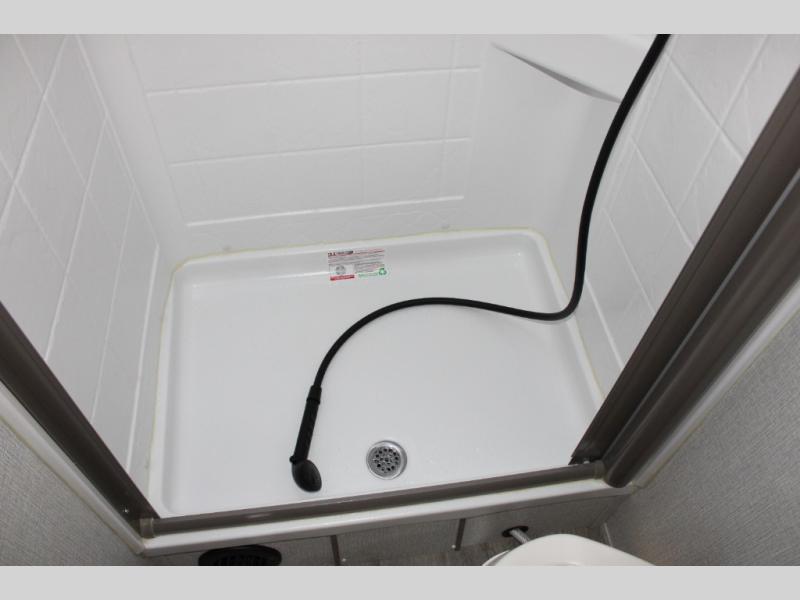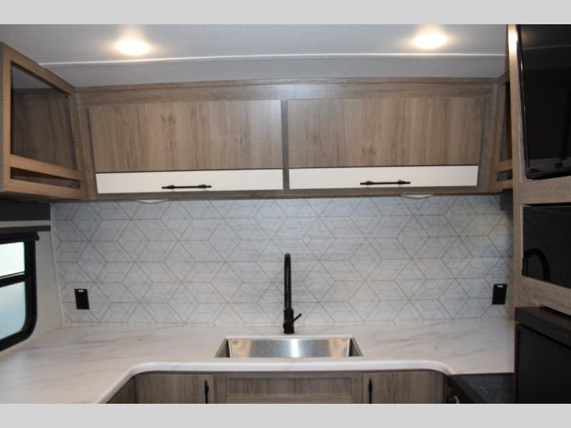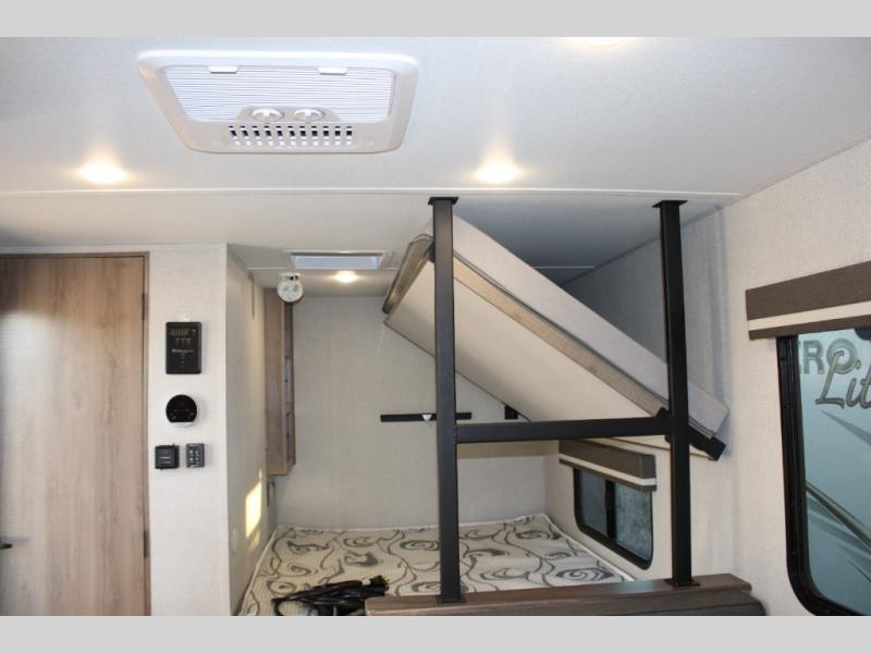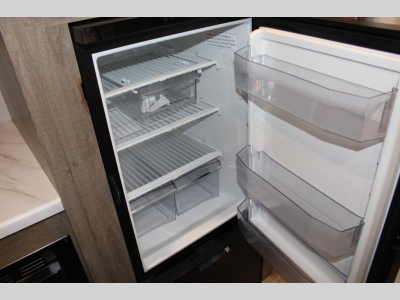 Your small family will have a fun time camping in this travel trailer! There is a queen bed below a 40" x 80" flip top bunk above it for comfortable sleeping spaces. You could even transform the booth dinette into an extra sleeping space when you aren't using it to enjoy a meal prepared with the front kitchen. You could even grill up some burgers on the outside griddle. Underneath the queen bed is a storage portal and the exterior has baggage doors to keep all of your gear out of the way!