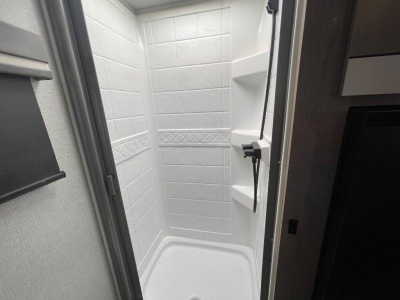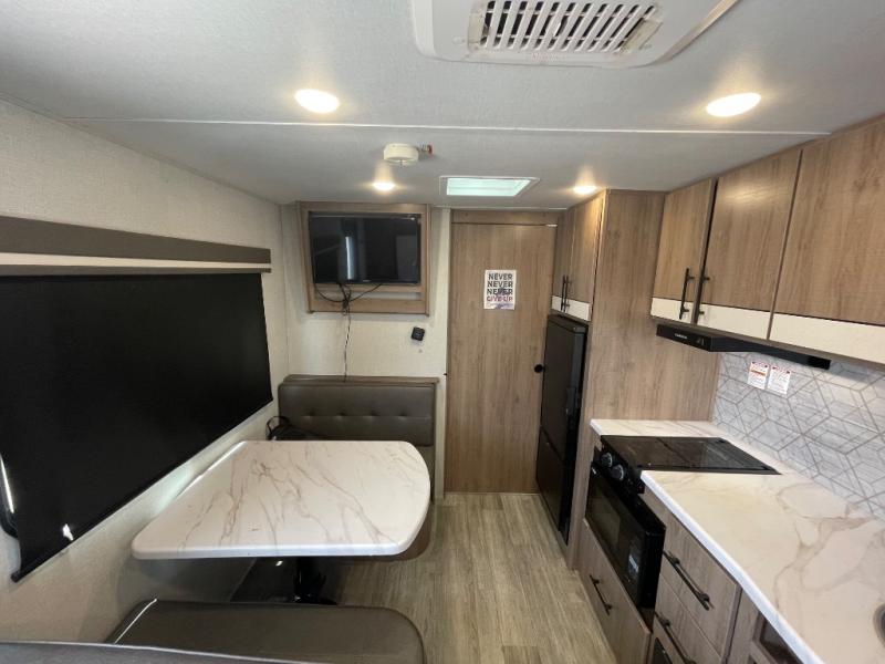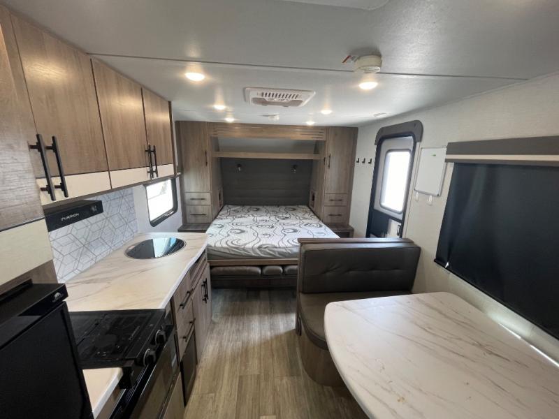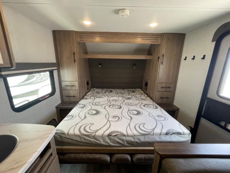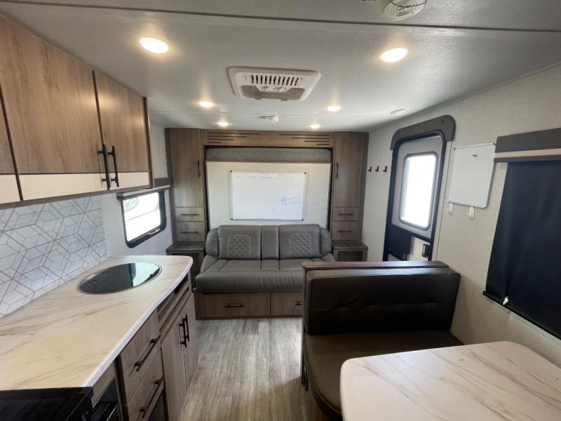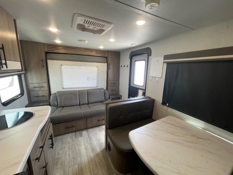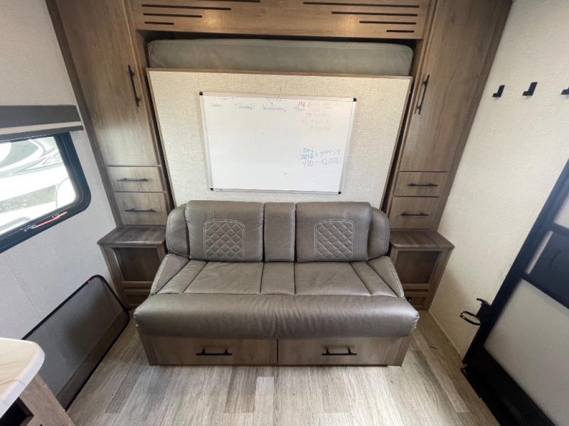 Start looking for your favorite campground to take this travel trailer to! After a fun day at the beach, you can rinse the sand out of your hair with the walk-in shower with a skylight in the full rear bathroom. Depending on what time you enter the unit will determine whether you see the queen Murphy bed or sofa with drawers underneath and wardrobes on either side of it. The booth dinette is not only great for enjoying meals prepared with the two burner cooktop or outside griddle, but also for transforming into an extra sleeping space!