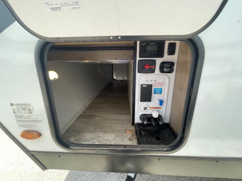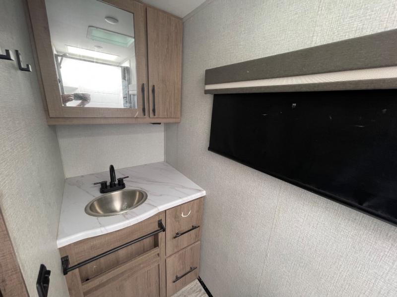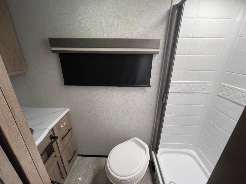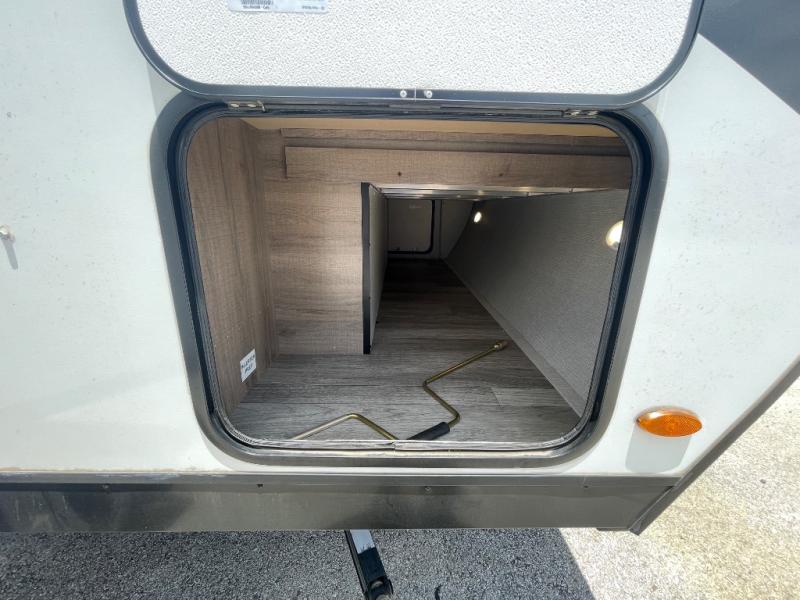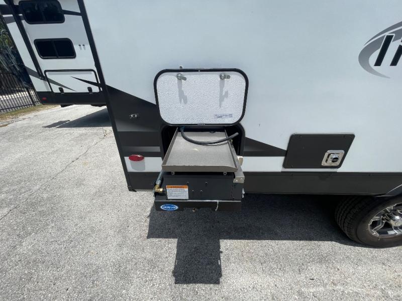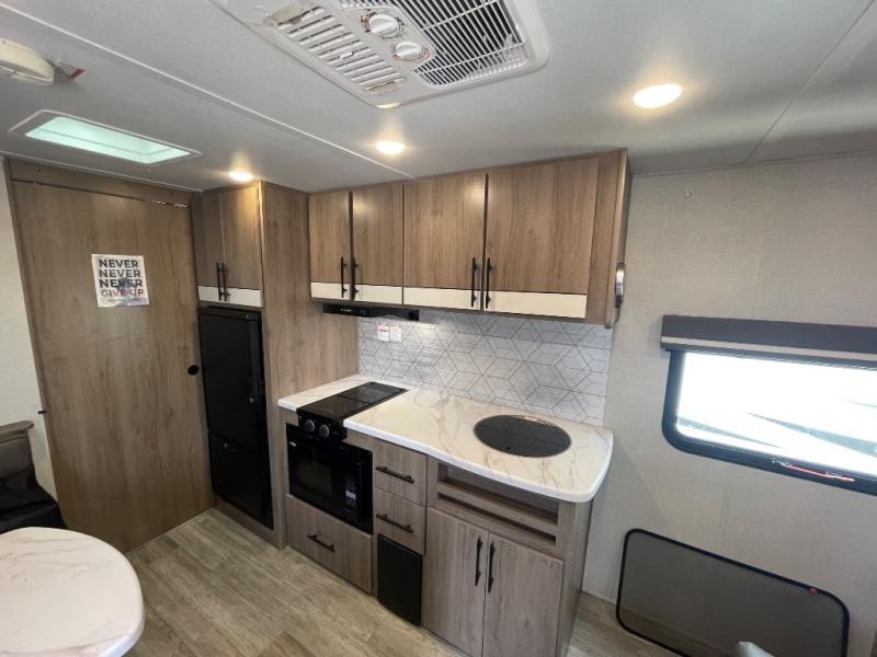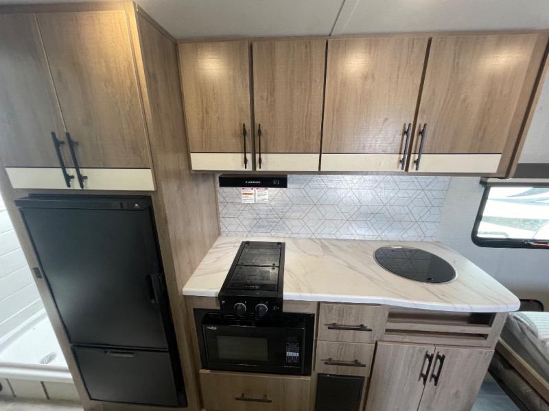 Start looking for your favorite campground to take this travel trailer to! After a fun day at the beach, you can rinse the sand out of your hair with the walk-in shower with a skylight in the full rear bathroom. Depending on what time you enter the unit will determine whether you see the queen Murphy bed or sofa with drawers underneath and wardrobes on either side of it. The booth dinette is not only great for enjoying meals prepared with the two burner cooktop or outside griddle, but also for transforming into an extra sleeping space!