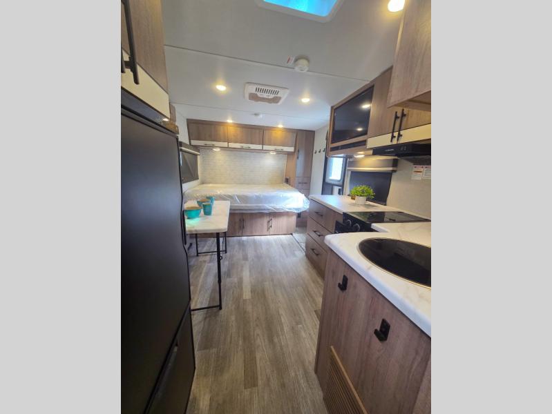 Pack your bags and head out on a fun camping trip in this travel trailer! The front queen bed offers a comfortable place to sleep at night, as well as the roll-over sleeper sofa slide. You can hang your jacket up on one of the coat hooks when you enter, and then start preparing a delicious meal on the two burner cooktop. You even have an outside griddle to fry up the catch of the day. The full rear bathroom has a walk-in shower with skylight to freshen up in and overhead cabinets for your toiletries!